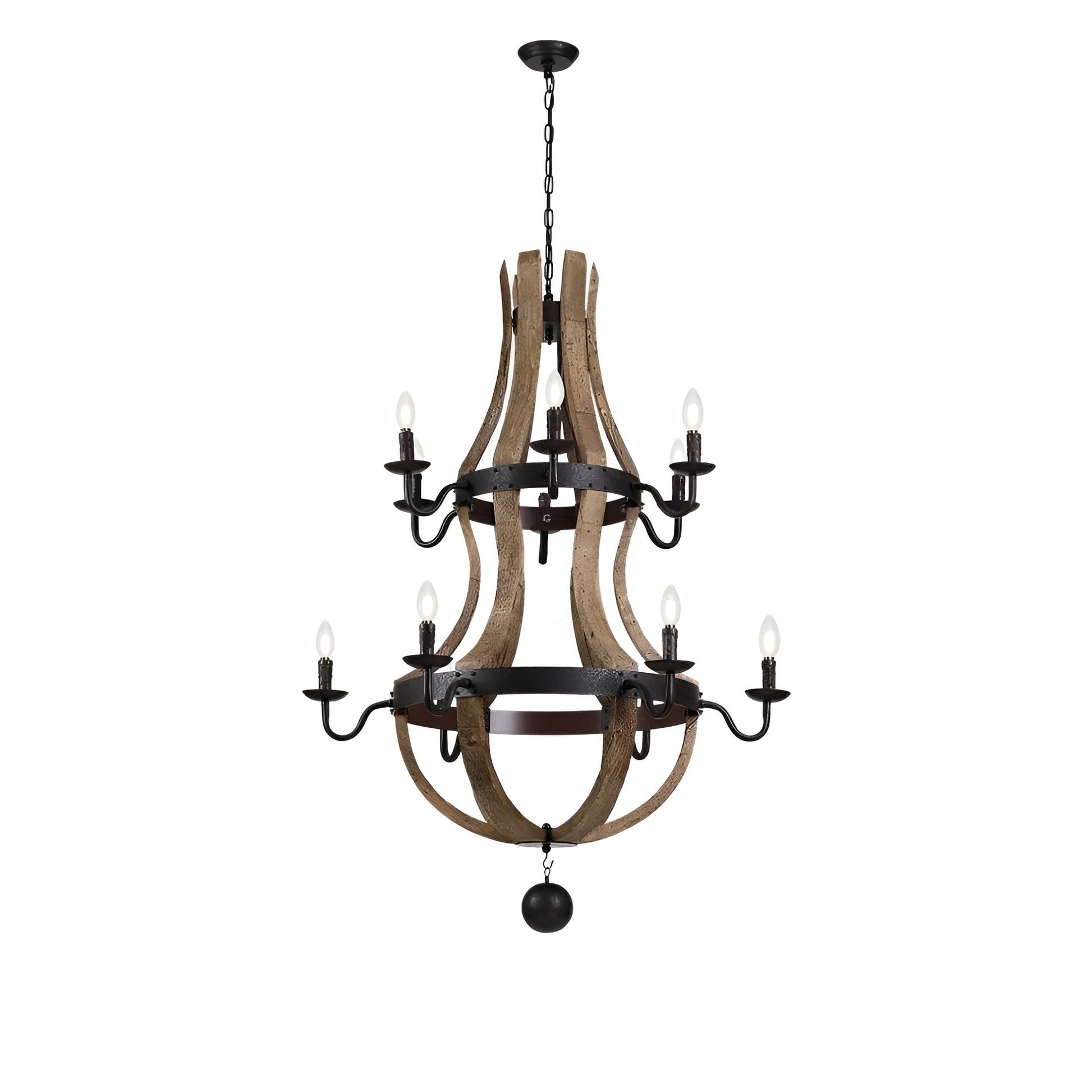 Lustre à deux niveaux de style campagnard français à 12 lumières, fabriqué à partir de tonneaux de vin.