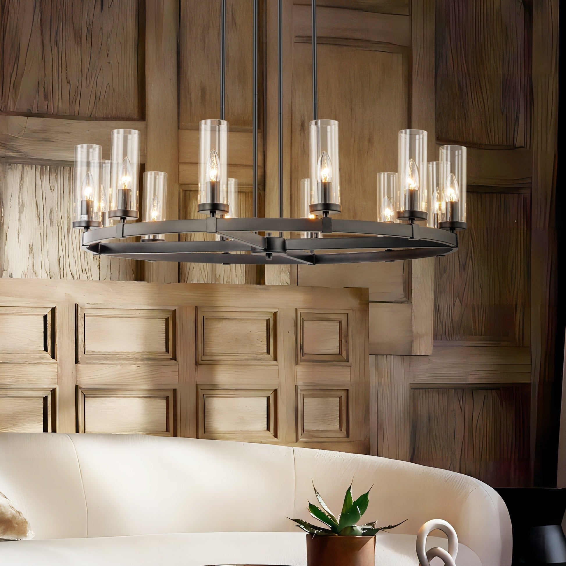 Ce lustre rétro industriel circulaire à 12 lumières, en forme de roue de chariot et abat-jour en verre transparent de 90 cm de diamètre, témoigne d'un savoir-faire et d'une ingéniosité exceptionnels. La lumière, diffusée à travers l'abat-jour en verre pur, procure un éclairage doux et généreux, créant une aura lumineuse qui enveloppe avec élégance votre espace de vie. Ce luminaire opulent se distingue par sa structure en forme de roue et ses ampoules cylindriques élégantes (non incluses), lui conférant une présence imposante et une esthétique industrielle vintage affirmée.