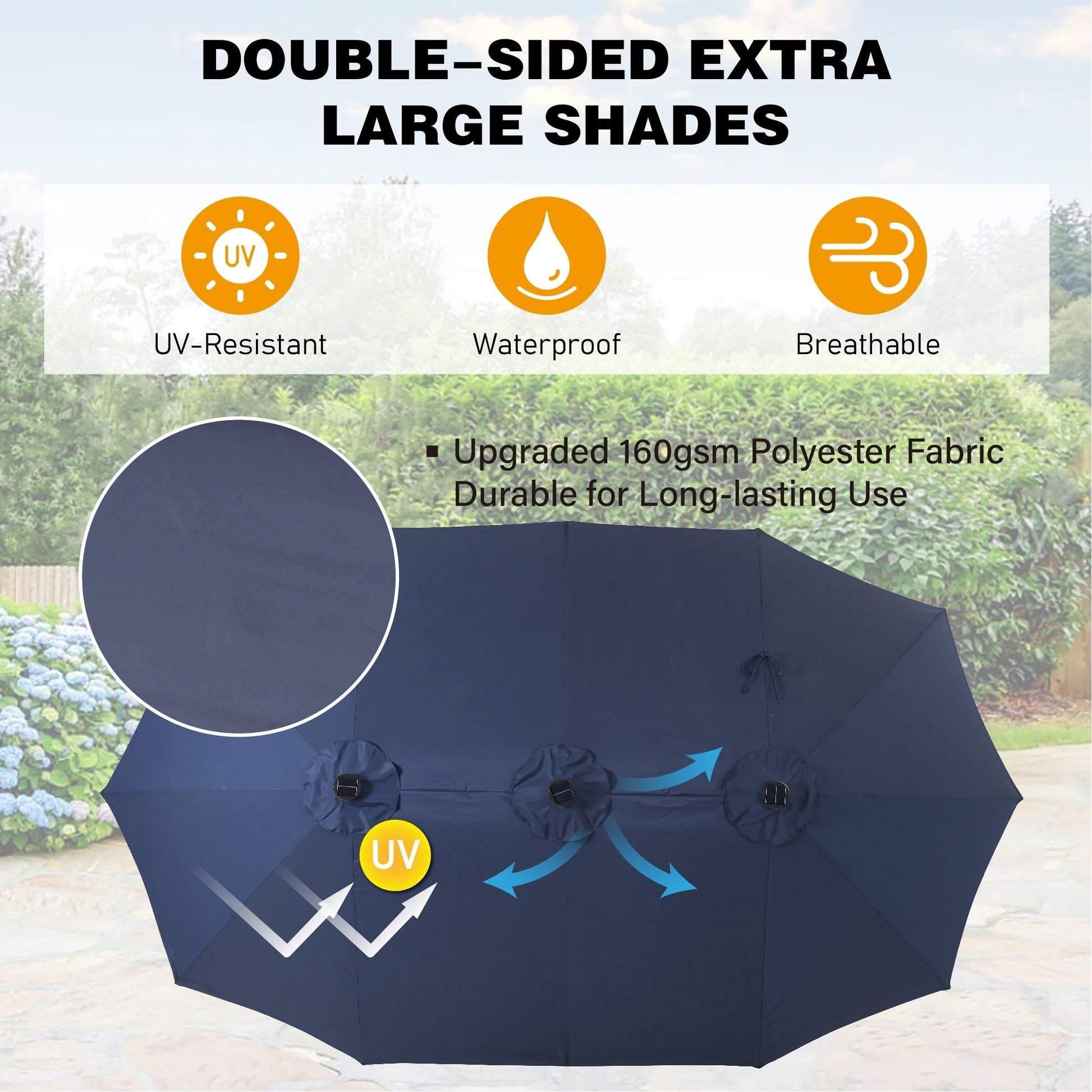Parasol de marché d'extérieur rectangulaire de 4,57 m (15 pieds) à manivelle, double face, avec éclairage solaire LED et base incluse.