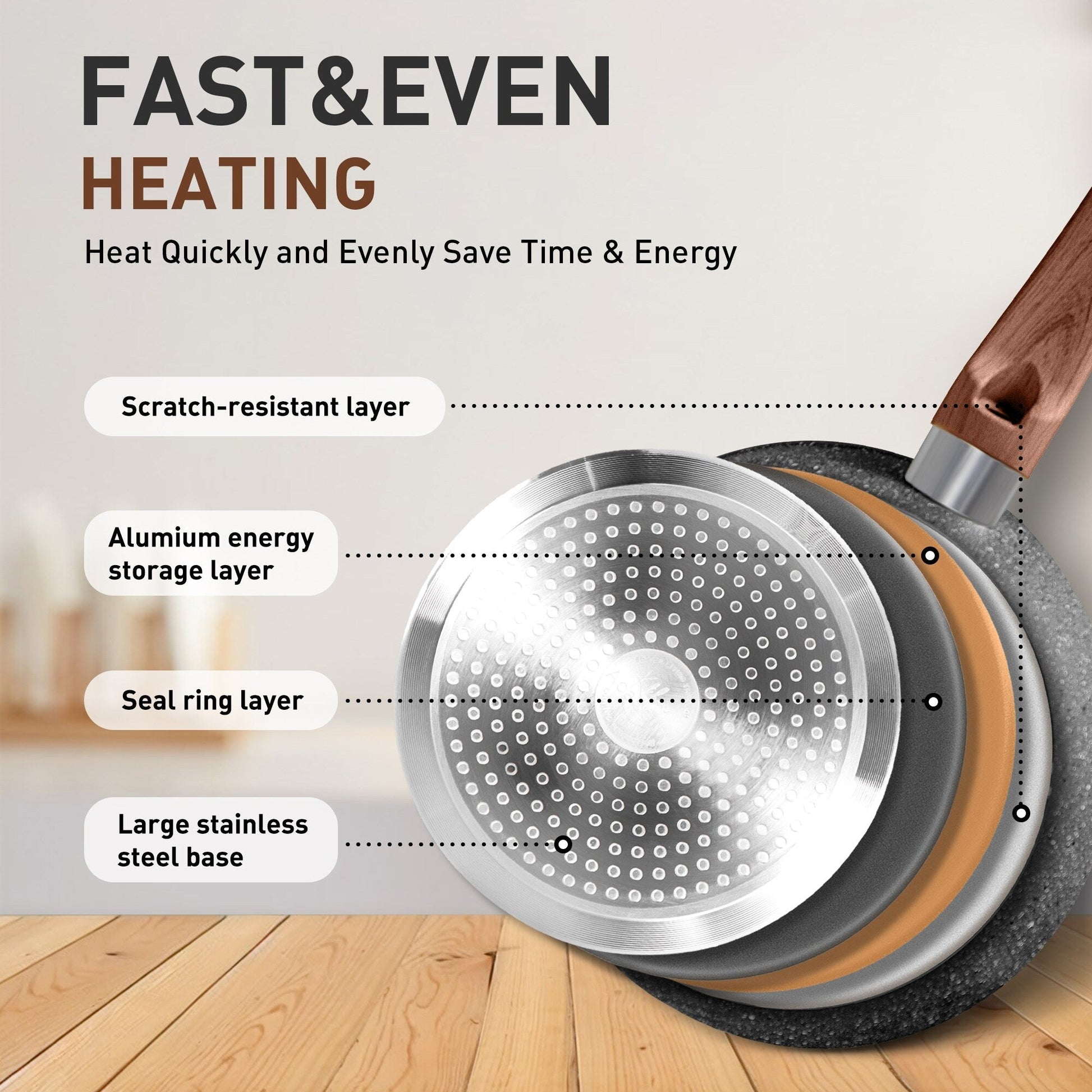 Ensemble de casseroles et poêles antiadhésives : Lors de l’achat d’ustensiles de cuisine, la propriété antiadhésive est primordiale. Le revêtement en granit empêche efficacement les aliments de coller. De plus, vous pourrez cuisiner des repas plus sains pour votre famille en utilisant moins d’huile. Vous pouvez préparer de la sauce tomate en toute sécurité dans ces ustensiles en granit ; le goût et l’odeur de vos plats resteront intacts, même avec des ingrédients acides ou odorants.