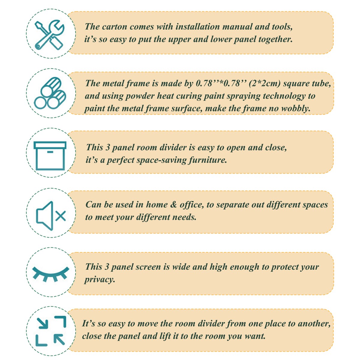 Transformez votre espace de vie avec notre magnifique paravent à 3 panneaux, un ajout polyvalent et élégant à votre décoration intérieure. Fabriqué en métal et bois de paulownia de haute qualité, ce séparateur de pièce autoportant arbore une belle esthétique rustique qui s'intègre harmonieusement à tous les styles d'intérieur. Idéal pour créer des espaces distincts pour travailler, jouer ou se détendre, notre paravent est incroyablement facile à déplacer et peut être utilisé dans différentes pièces, notamment le salon, la chambre, la salle à manger, le bureau et le balcon.