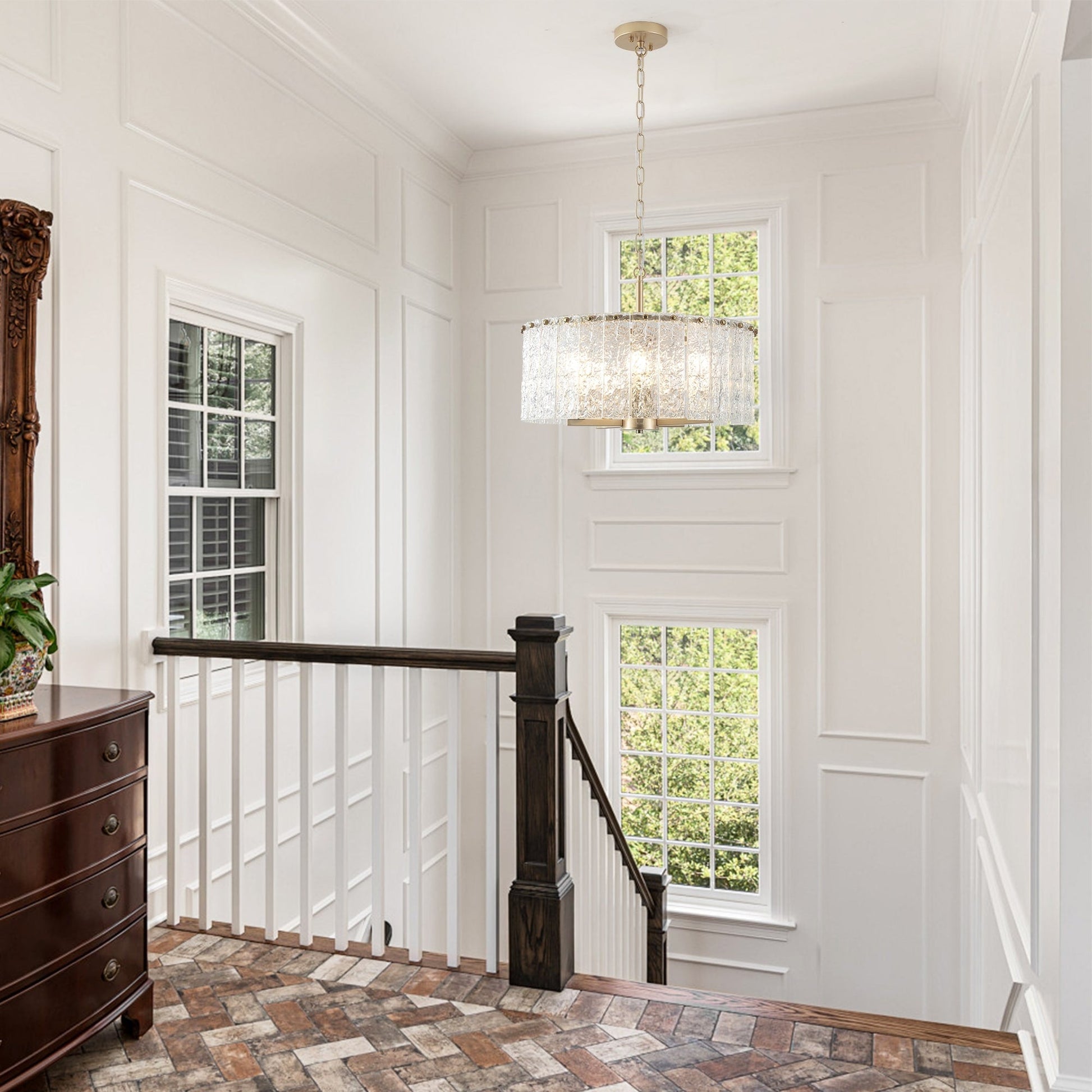 Illuminez votre îlot de cuisine avec élégance grâce à notre suspension cylindrique. Son design raffiné, rehaussé de cristaux, confère sophistication et luxe à votre espace. Dotée de cinq ampoules et d'un éclairage dirigé vers le haut, elle offre une luminosité optimale tout en apportant une touche de glamour à votre cuisine. Fabriquée à partir de métal, de verre et de véritable cristal K9 de Chine de haute qualité, elle allie durabilité et esthétique luxueuse. Sa longueur ajustable permet un positionnement flexible, tandis que sa compatibilité avec les plafonds inclinés offre de multiples possibilités d'installation. Idéale pour les pièces sèches, cette suspension allie style et fonctionnalité pour sublimer l'ambiance de votre cuisine. Veuillez noter : les ampoules ne sont pas incluses.