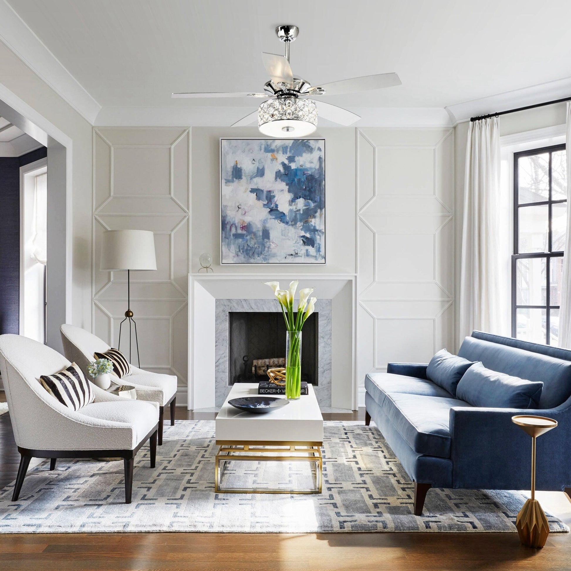 Apportez une touche de modernité et d'élégance à votre intérieur avec ce ventilateur de plafond de 132 cm (52 pouces) à quatre lumières et à cristaux, doté d'une télécommande. Sa structure en métal chromé et ses pales en bois argenté lui confèrent un style épuré et contemporain, idéal pour toutes les pièces de votre maison. Profitez des avantages d'un moteur réversible à trois vitesses, parfait pour l'hiver et les économies d'énergie. La télécommande vous permet d'allumer et d'éteindre facilement la lumière et de régler la vitesse du ventilateur selon vos préférences.