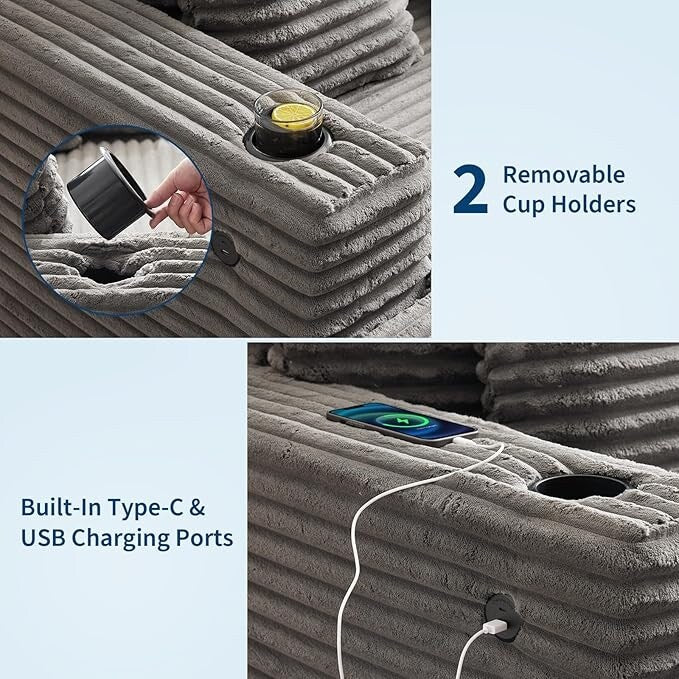 [Confort spacieux pour se détendre] Profitez d'une relaxation exceptionnelle avec cette méridienne surdimensionnée, dotée d'une assise généreuse de 137 cm de large et de 119 cm de profondeur. Parfaite pour lire, faire une sieste ou regarder des films, elle offre un espace généreux pour vous et vos proches. Son design spacieux garantit une expérience d'assise haut de gamme, ce qui en fait un ajout idéal aux salons, chambres ou espaces de divertissement. [Revêtement en velours côtelé haut de gamme et résistant] Confectionné en velours côtelé respirant de haute qualité, ce canapé-lit allie luxe et durabilité. Sa texture douce apporte une sensation de confort, tandis que la mousse haute densité et les ressorts ensachés à l'intérieur maintiennent la forme du fauteuil et offrent un soutien moelleux. Que vous jouiez, vous détendiez ou vous reposiez, le revêtement haut de gamme vous offre un confort et un style durables. [Soutien ergonomique complet du corps] Conçue pour votre confort, la méridienne surdimensionnée est dotée d'une assise profonde et ergonomique qui soutient tout votre corps. Ce fauteuil favorise la détente pour lire, méditer ou décompresser après une journée chargée. Sa structure encourage une posture saine et réduit la fatigue, vous procurant une sensation de fraîcheur et de confort même lors d'une utilisation prolongée. [Fonctionnalités pratiques intégrées] Restez connecté sans effort grâce aux ports de chargement intégrés au fauteuil, vous permettant de recharger vos appareils tout en vous relaxant. Les porte-gobelets amovibles ajoutent de la praticité, vous permettant de savourer vos boissons préférées sans avoir besoin de meubles supplémentaires. Ces fonctionnalités bien pensées améliorent votre expérience de détente, idéale pour faire plusieurs choses à la fois tout en lisant ou en regardant la télévision. [Montage simple et design moderne et élégant] Ce fauteuil méridienne moderne se monte facilement grâce à un processus d'assemblage simple, vous permettant de vous détendre rapidement. Son design élégant et contemporain s'harmonise avec différents styles d'intérieur, ajoutant sophistication et confort à n'importe quel espace. Que ce soit dans un salon, un bureau ou une chambre, c'est une solution d'assise élégante et pratique.
