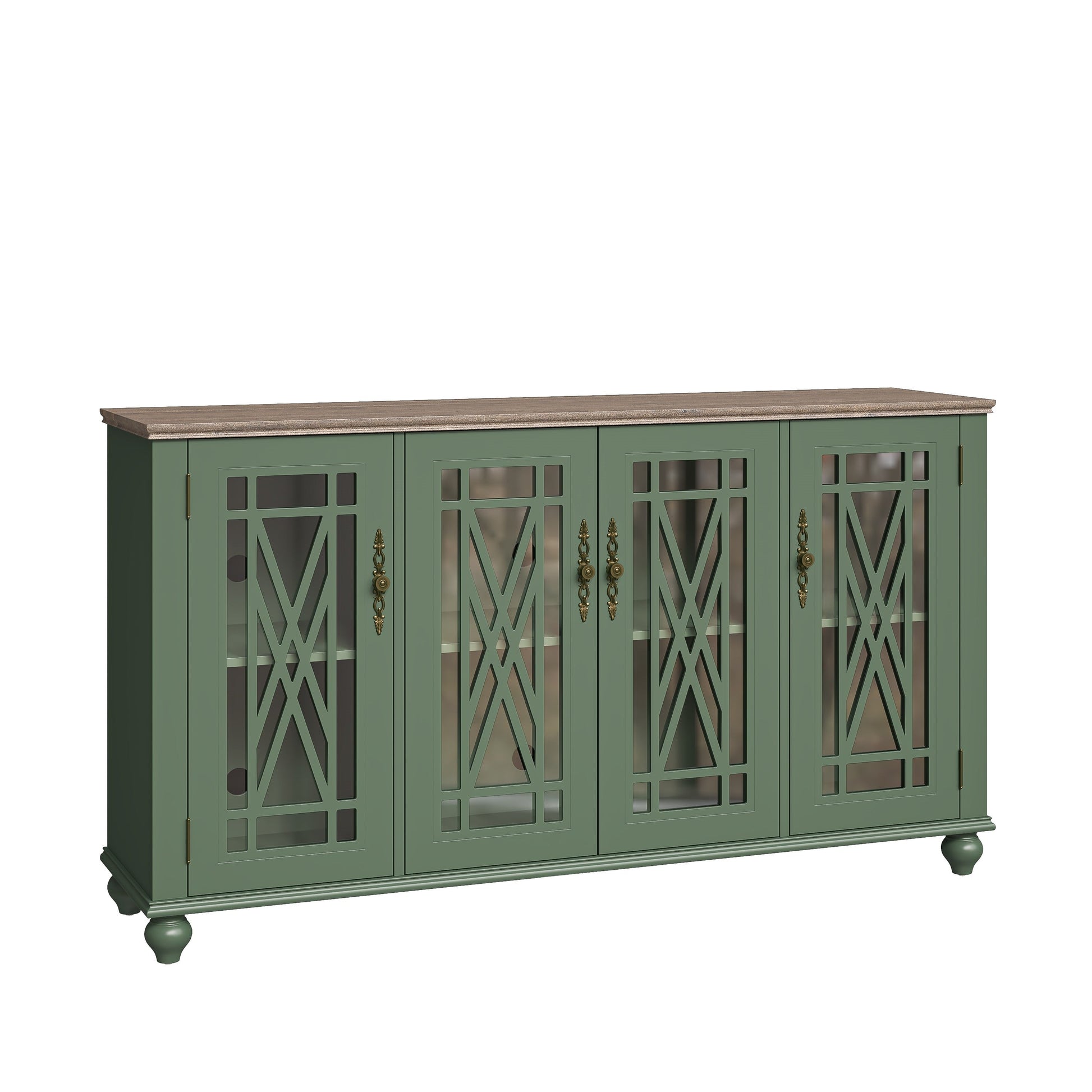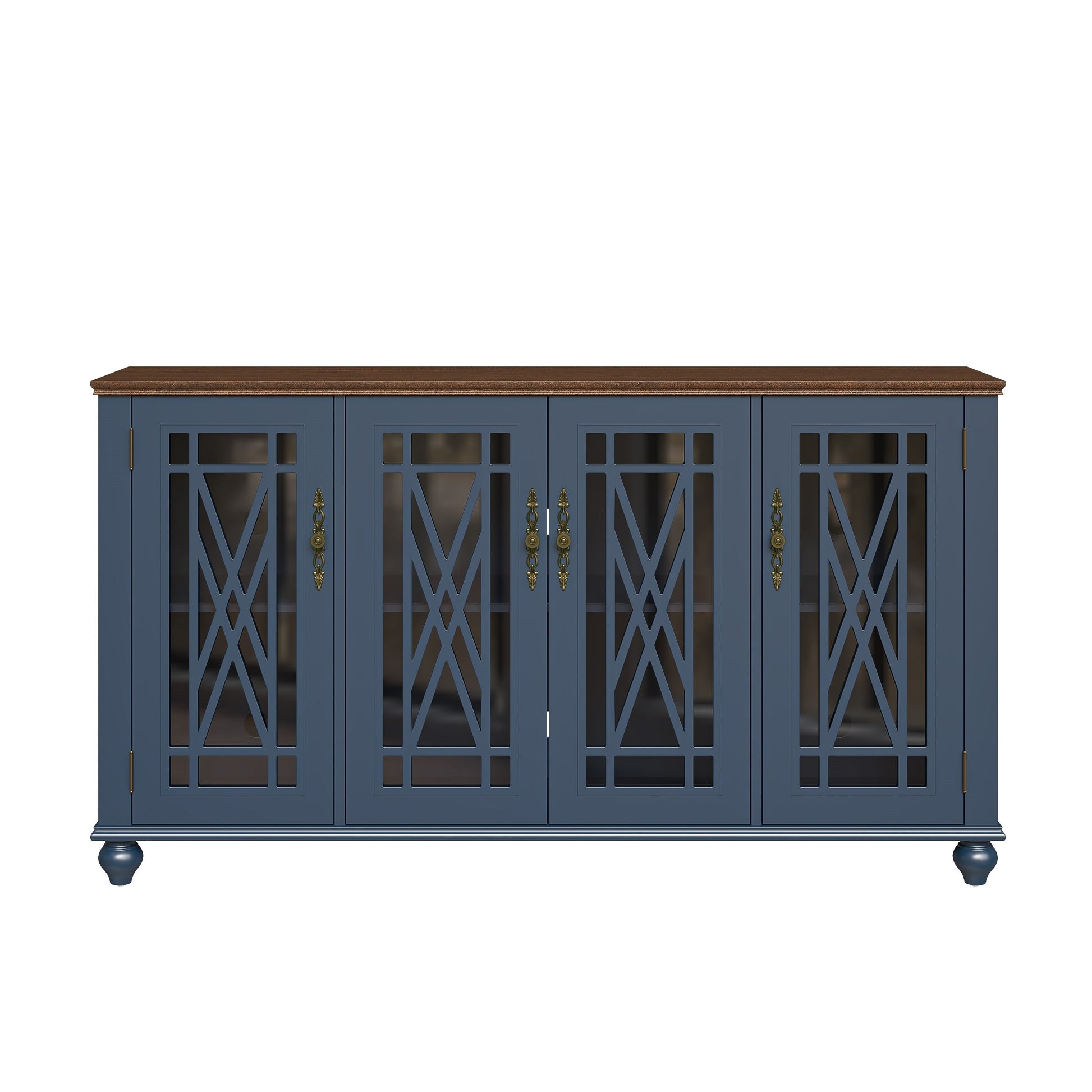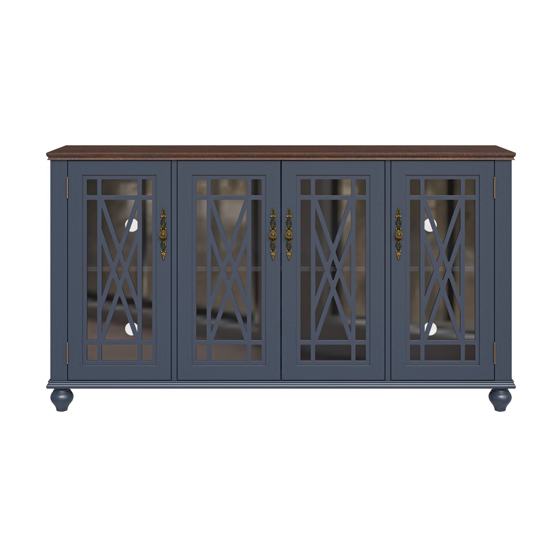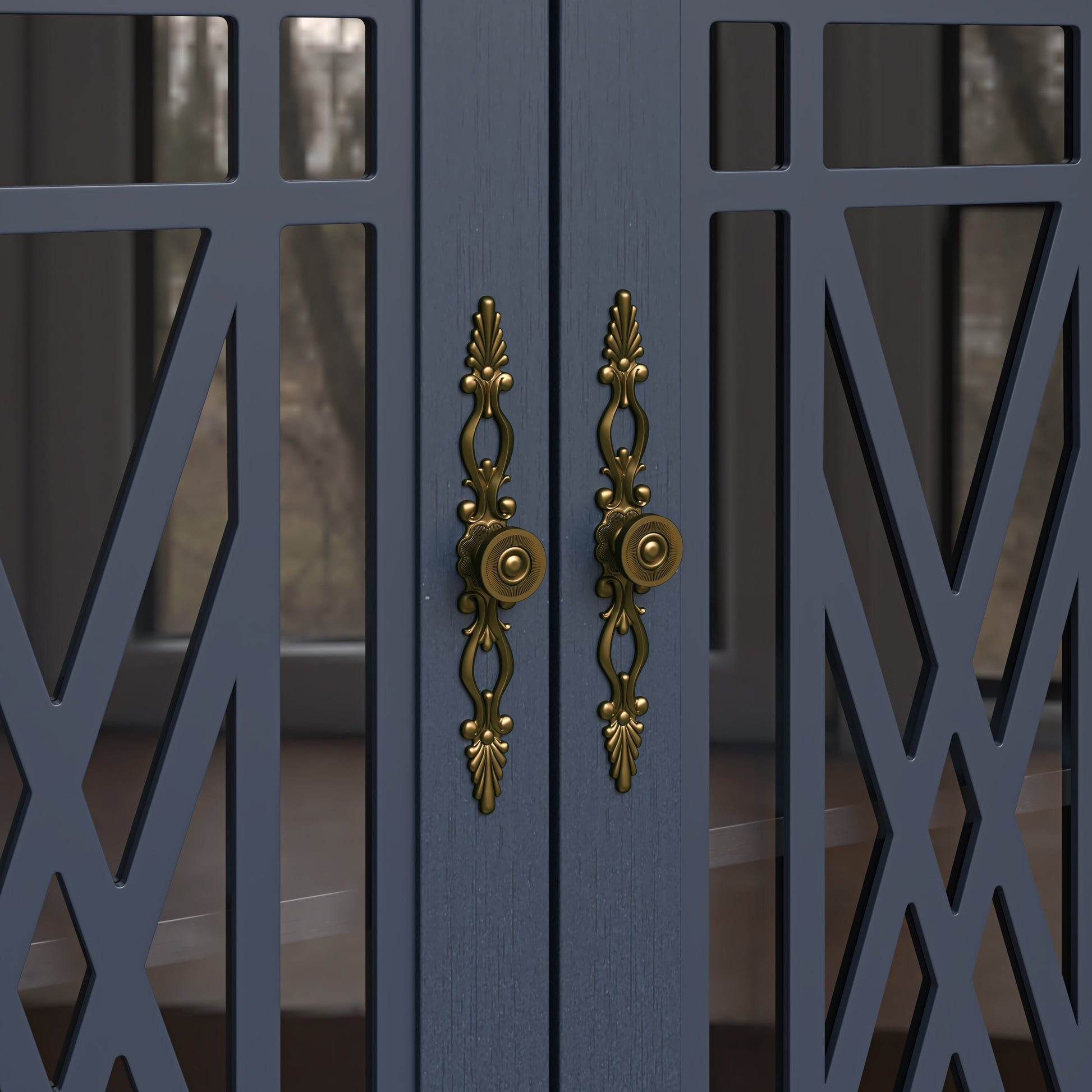 - Quatre portes vitrées avec un revêtement en bois finement travaillé et des poignées en métal de style vintage.