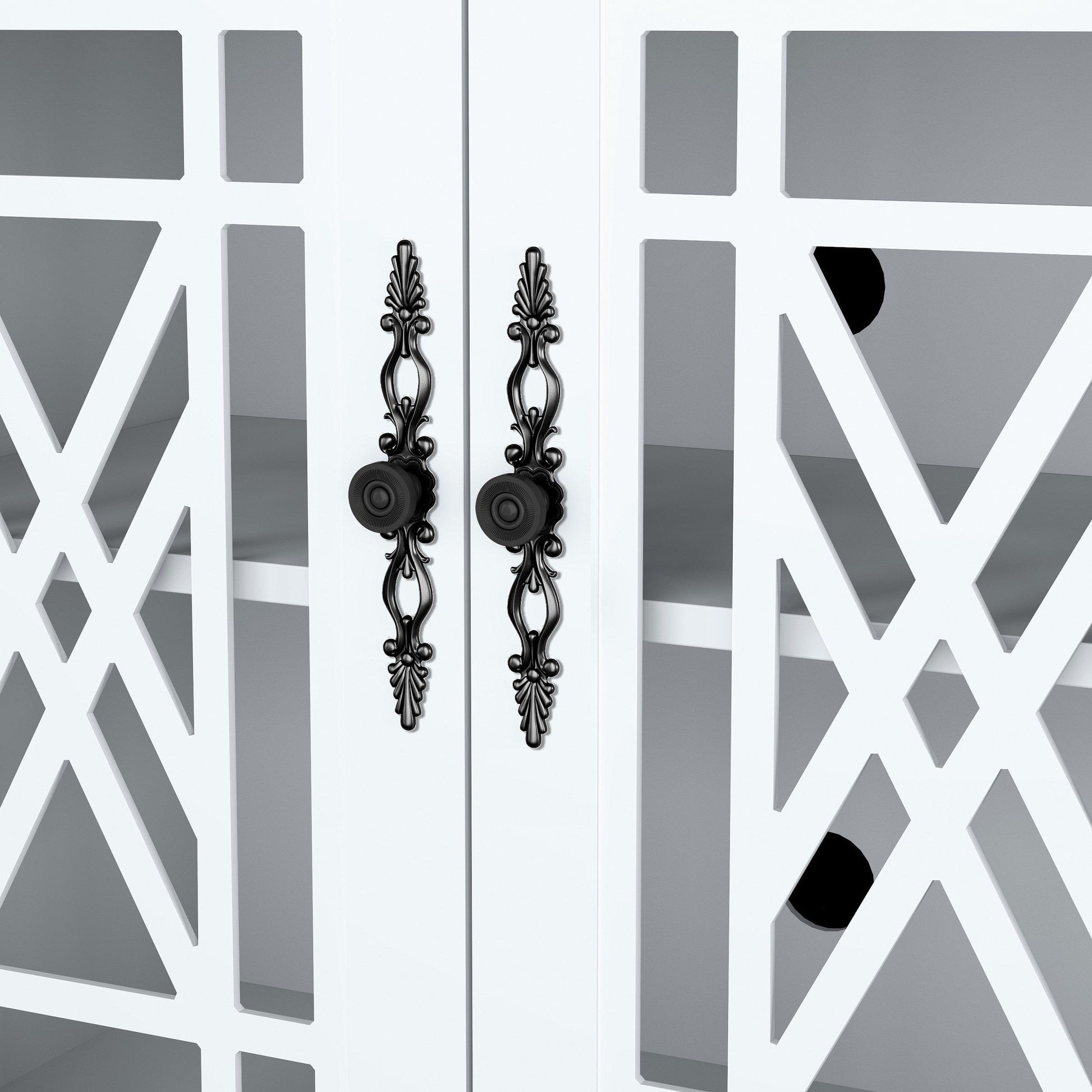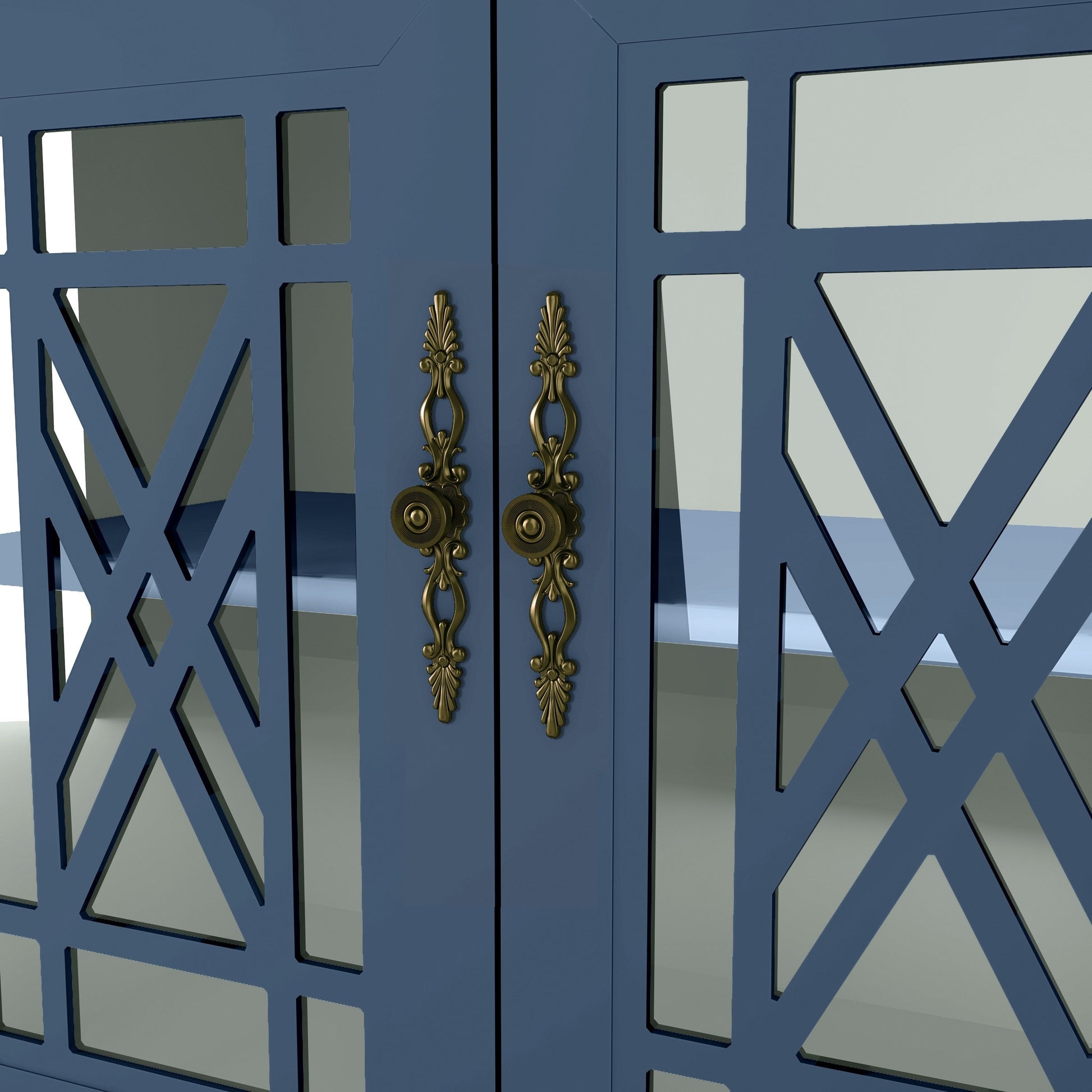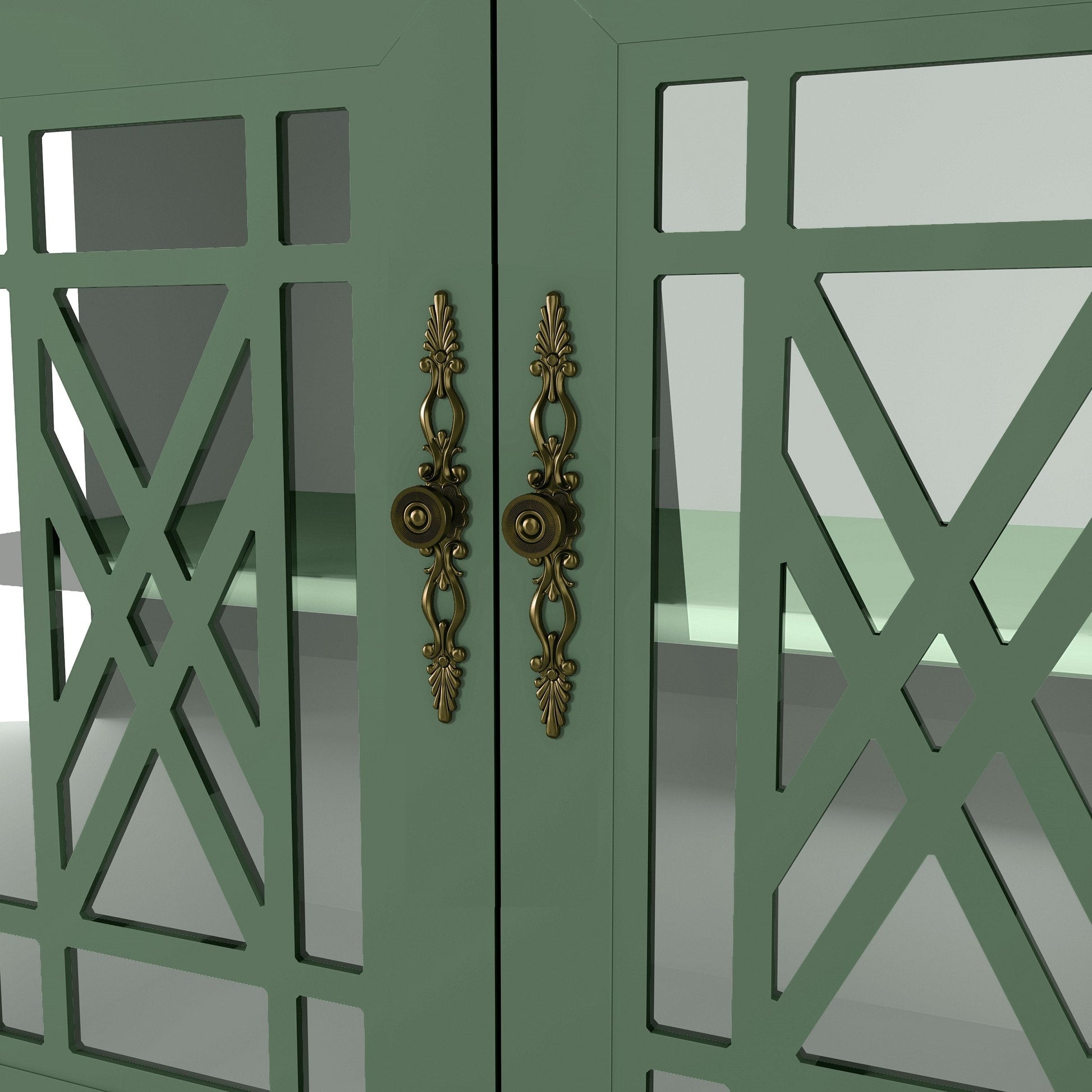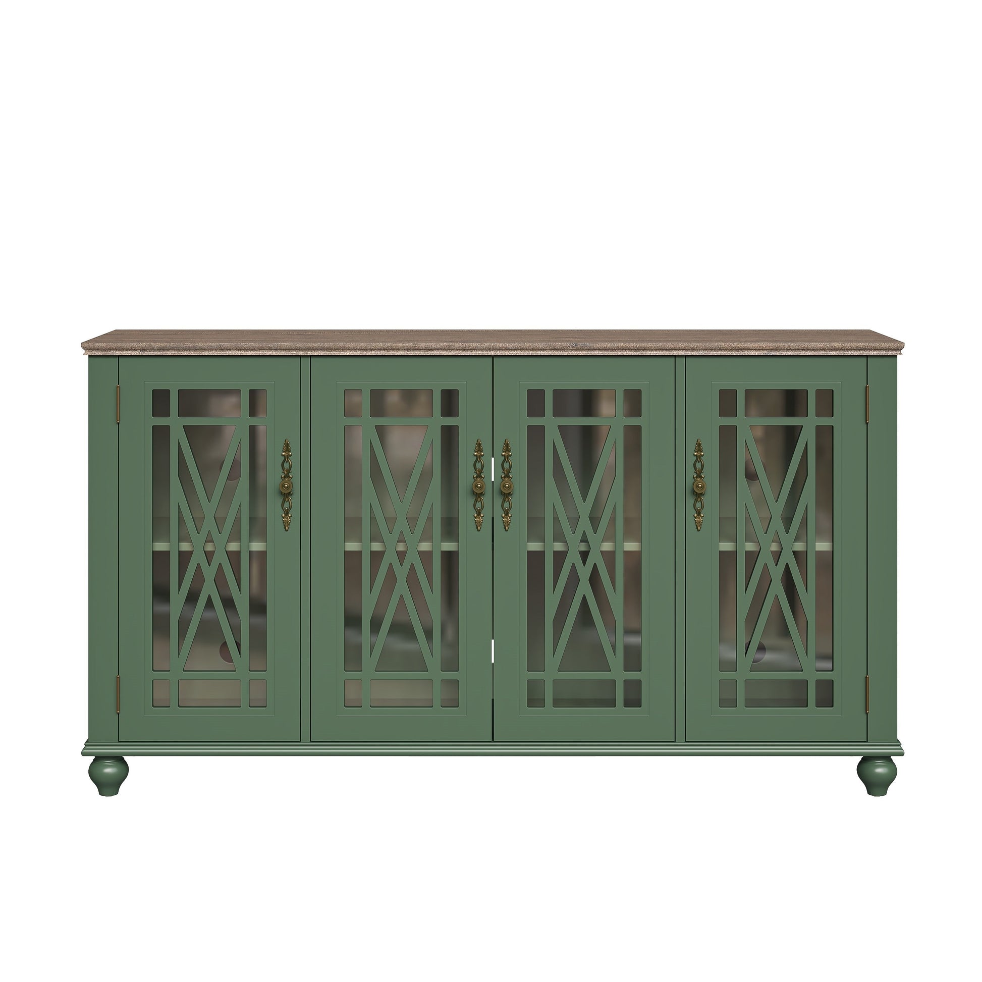 - Quatre portes vitrées avec un revêtement en bois finement travaillé et des poignées en métal de style vintage.
