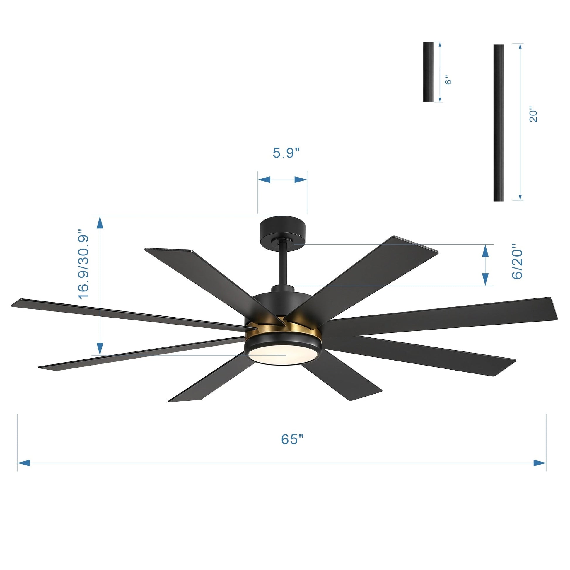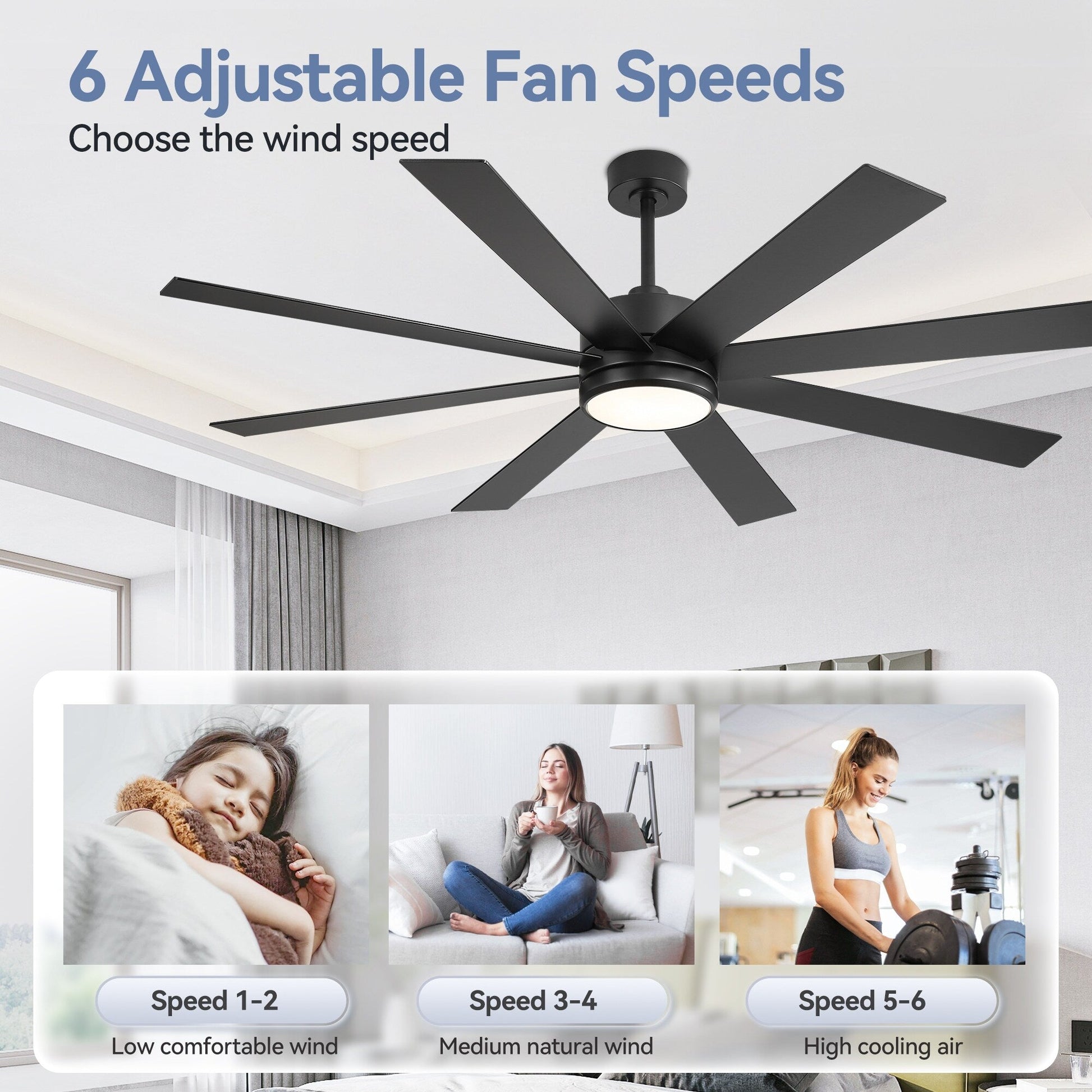 Ventilateur de plafond noir à 8 pales de 65 pouces avec éclairage LED et télécommande