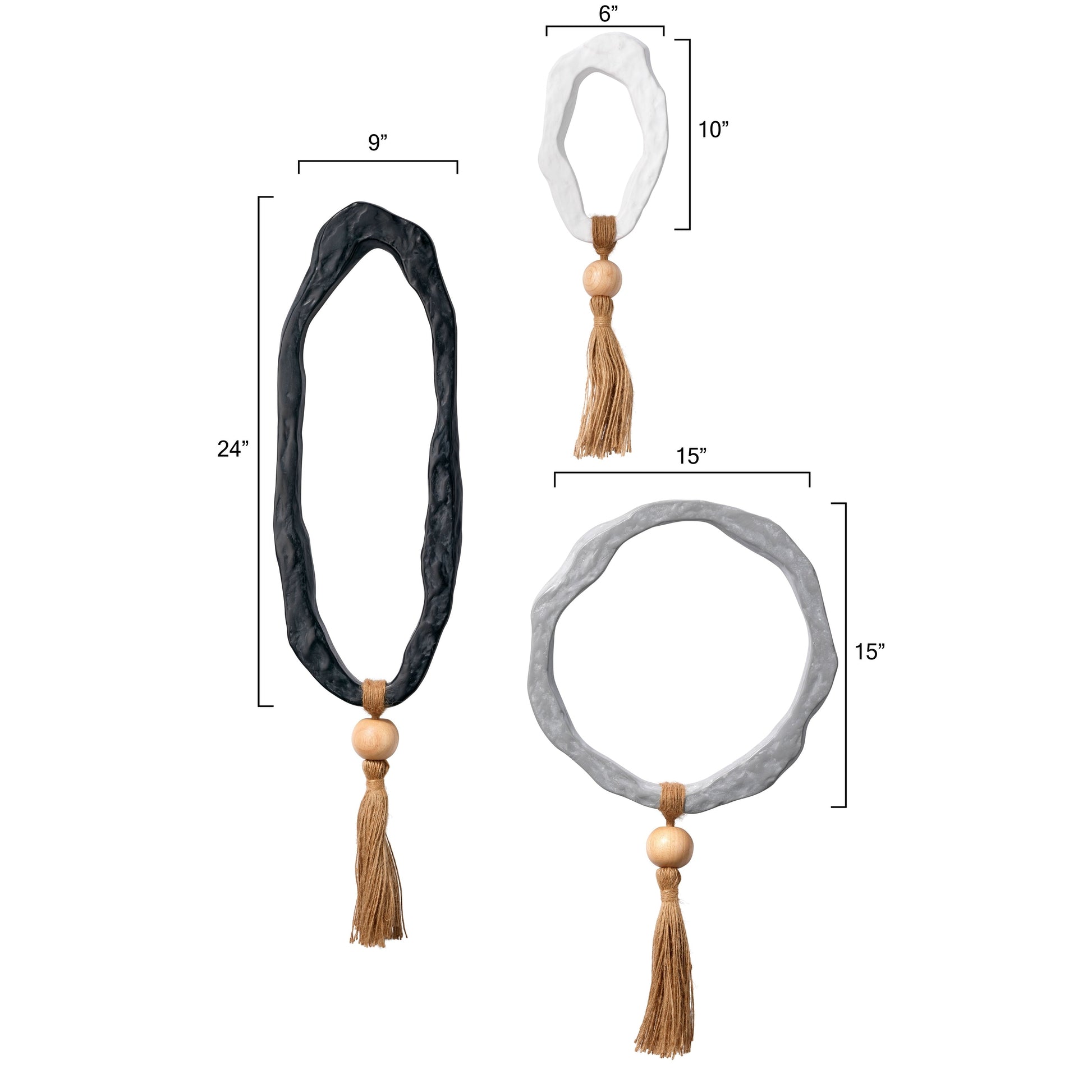 Inspiré des motifs orientaux, cet ensemble de trois suspensions décoratives crée un point focal saisissant sur votre mur. Fabriquées artisanalement en résine, ces anneaux organiques aux formes libres sont ornés de perles de bois et de corde de sisal. Accrochez-les en rangée décorative ou individuellement comme éléments décoratifs disséminés dans n'importe quelle pièce.
