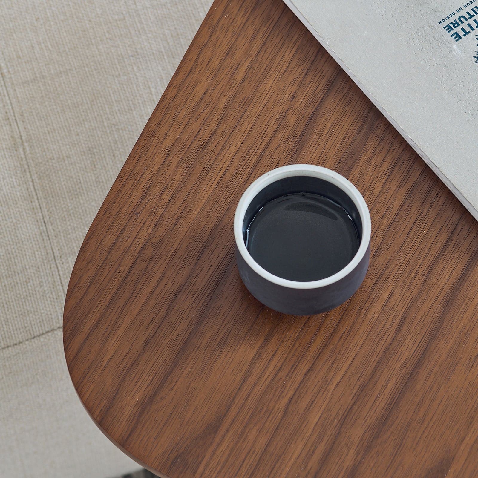 La table d'appoint Almond est ornée d'un placage en noyer et d'un piètement en métal noir. Son cylindre métallique relie le plateau supérieur et la base inférieure, offrant un design polyvalent et minimaliste. Cette table d'appoint C est parfaite pour les personnes élégantes et soucieuses de leur style de vie.