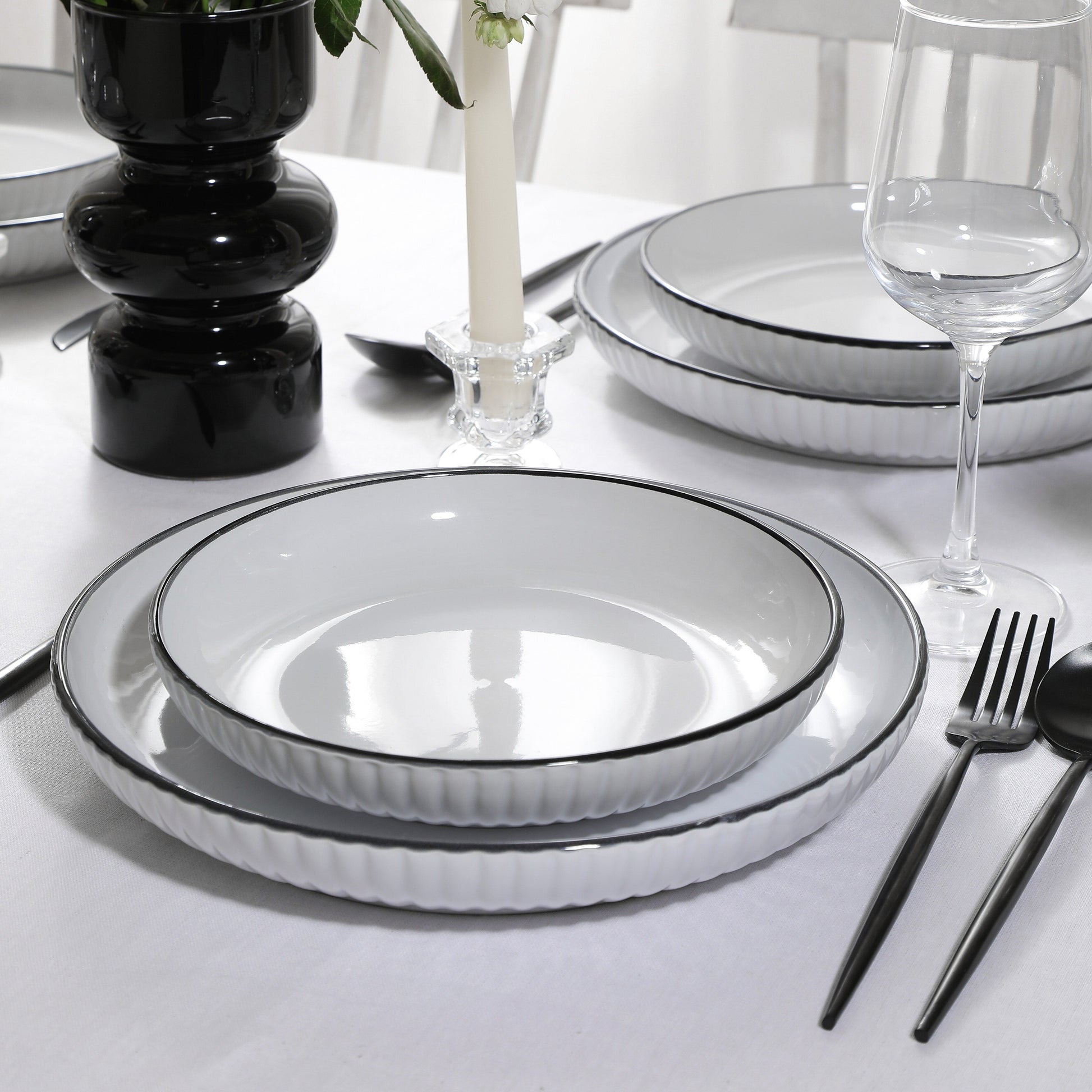 - Bordure blanche et noire : La faïence blanche est classique, tandis que la fine bordure noire ajoute une touche d’intrigue et d’intérêt visuel.
