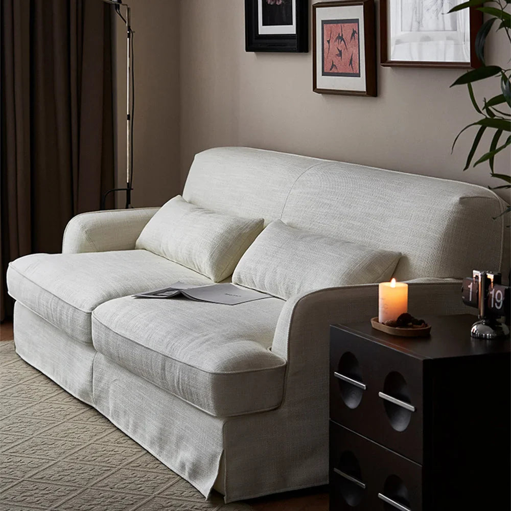 Ce canapé est sophistiqué et épuré. Ses coussins sont garnis de duvet et de mousse, tels des noix de coco moelleuses cuites au four. Ses lignes épurées et fluides, associées au tissu chenille texturé dune, lui confèrent un style américain plus langoureux.