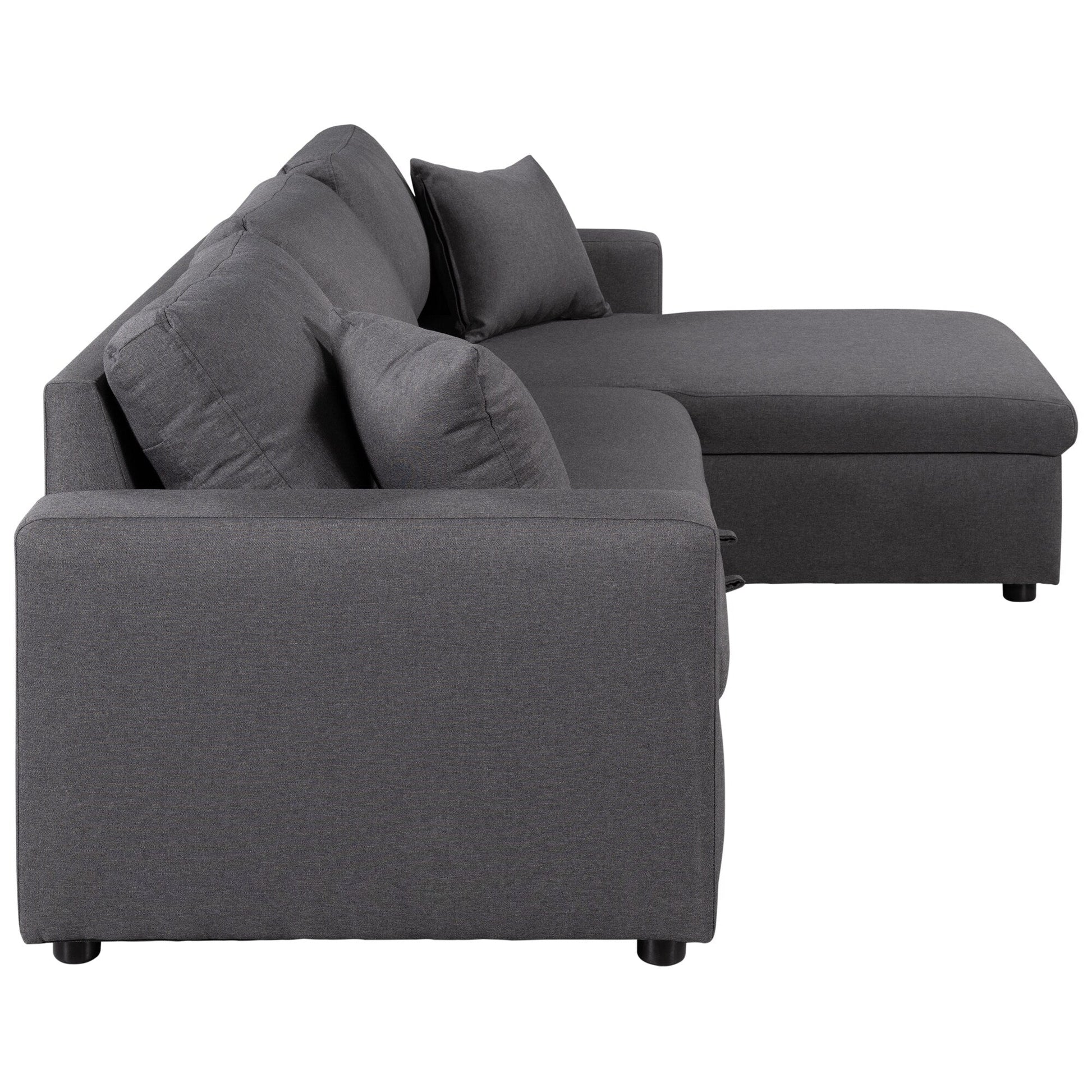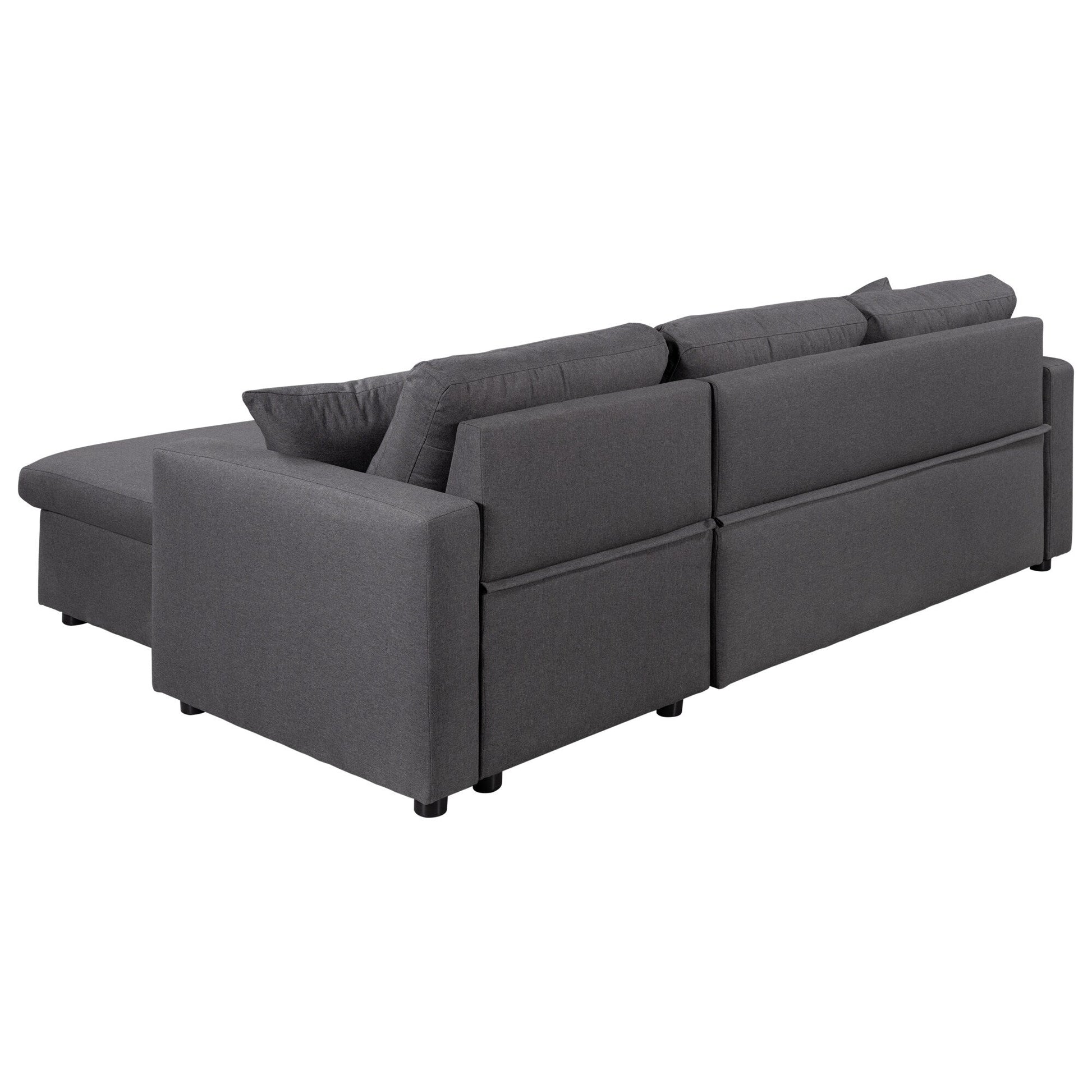 - Ce canapé-lit moderne en forme de L se transforme facilement en lit grâce à une poignée coulissante, offrant un couchage supplémentaire sans encombrer votre espace. Doté de rangements intégrés, de coussins en mousse haute densité et d'un tissu gris doux, il allie confort, fonctionnalité et style pour un usage quotidien.