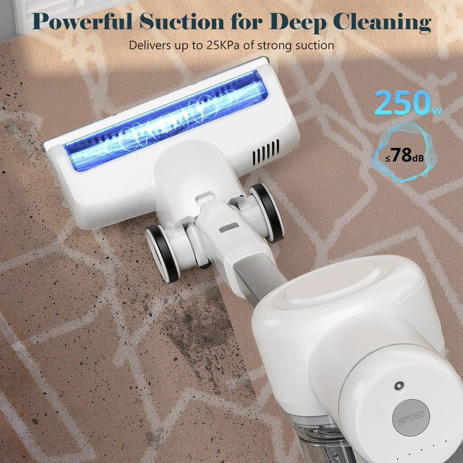 - [Aspiration puissante] : Trois modes d'aspiration permettent une personnalisation pour le nettoyage quotidien (mode éco) ou les tâches plus difficiles (aspiration élevée), facilement commutables à l'aide d'un seul bouton. L'aspirateur balai filaire mis à jour est doté d'un moteur sans balais, offrant une aspiration jusqu'à 25 kPa pour un nettoyage efficace sur tous les types de sols et les tapis à poils courts.