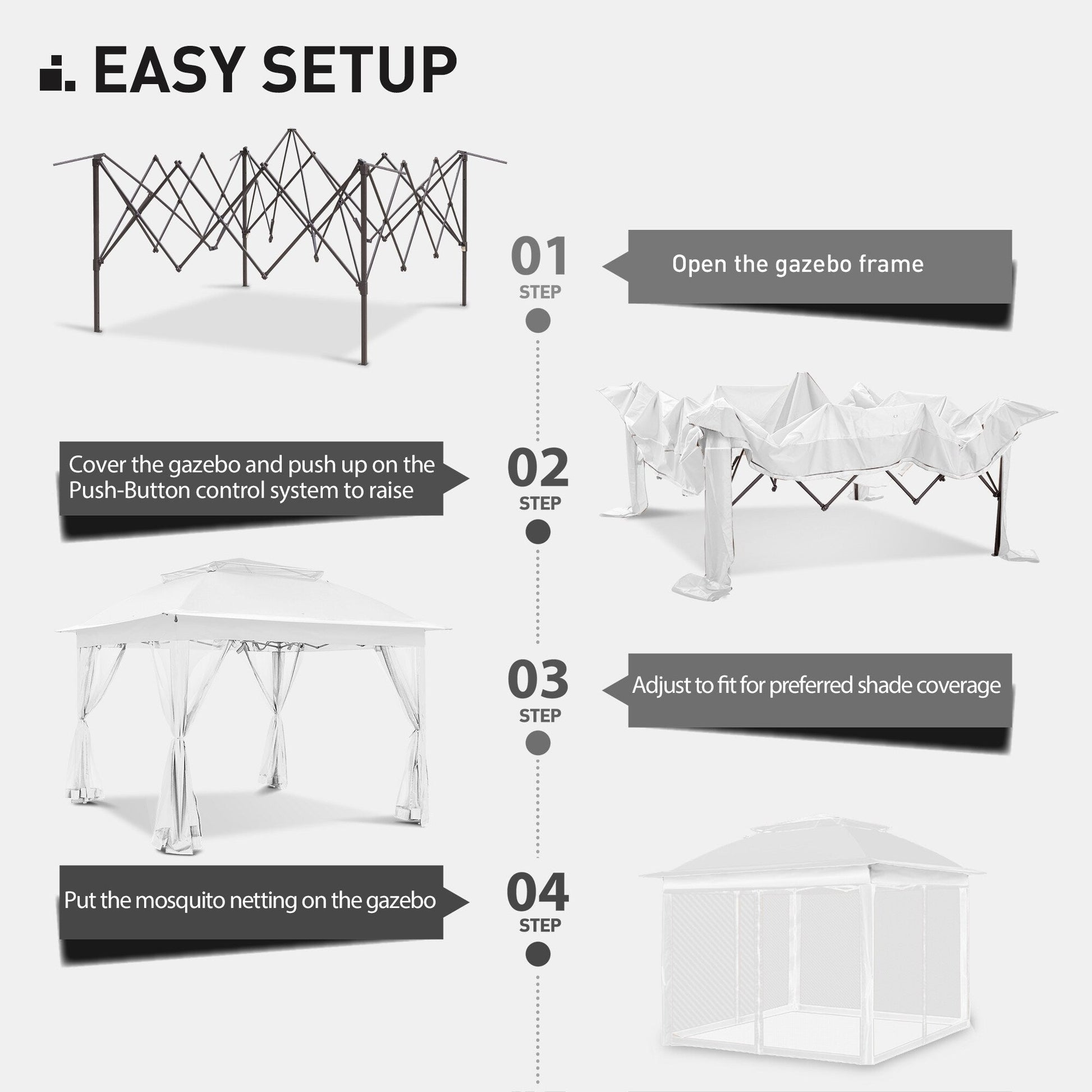 - MONTAGE FACILE ET SANS EFFORT - La tonnelle pliante COZYWOR est conçue avec un mécanisme breveté de déploiement instantané et des poteaux robustes en acier thermolaqué avec système de hauteur réglable, pour un montage rapide et sans tracas (consultez le manuel ; le montage prend moins de 10 minutes). Il est conseillé d'être au moins deux pour le montage.