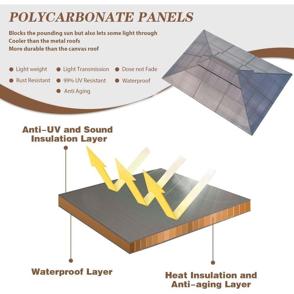 Ce gazebo haut de gamme s'adapte à toutes les occasions : barbecues sur la terrasse, pique-niques sur le jardin, thés de l'après-midi sur la terrasse, grillades dans la cour, réunions entre amis ou détente au bord de la piscine. Son design élégant offre une protection solaire idéale, tandis que sa structure ouverte permet non seulement d'installer un barbecue, mais aussi une table et des chaises pour 7 à 9 personnes , pour un confort optimal et des moments de détente en plein air, du café du matin aux dîners en soirée.
