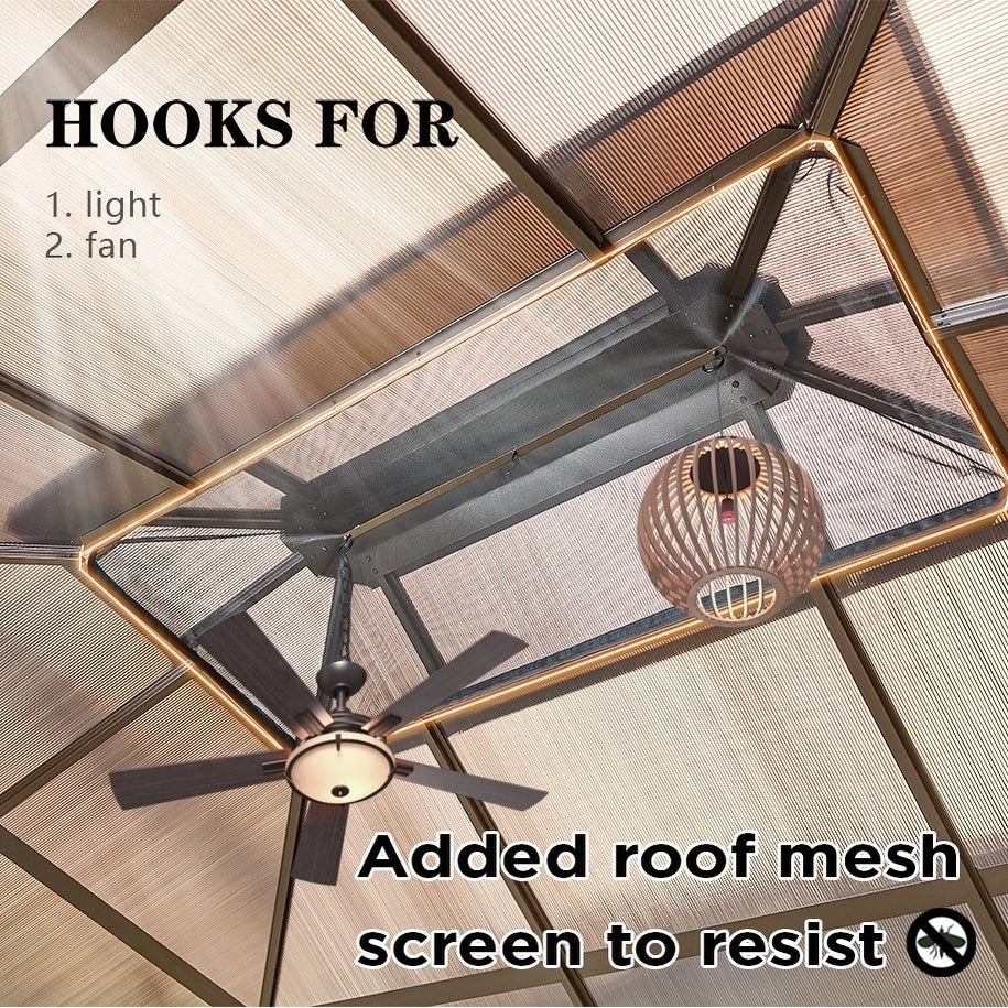 Ce pavillon de jardin est doté d'une conception avancée à double toit avec des ouvertures de ventilation surélevées, optimisant la circulation de l'air pour une sensation de fraîcheur. Son système de ventilation intelligent, associé à des aérations latérales discrètes , assure un renouvellement constant de l'air tout en évacuant l'air chaud vers le haut, vous garantissant une fraîcheur optimale même en plein été. Profitez d'un équilibre parfait entre une protection solaire complète et une agréable brise naturelle, que ce soit pour recevoir ou vous détendre seul, comme sous la canopée rafraîchissante d'un arbre.