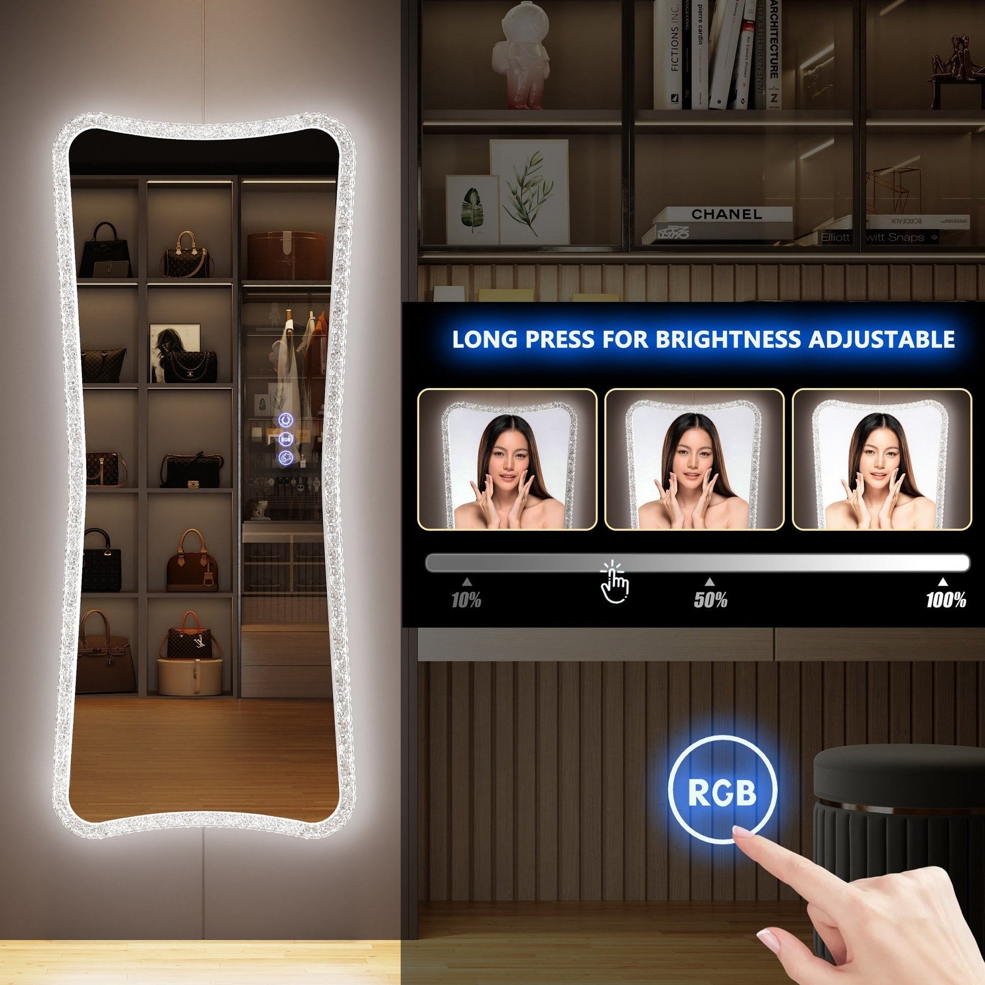 - Le miroir pleine longueur, entouré d'une bande lumineuse LED haute luminosité d'une durée de vie de 50 000 heures, avec 7 modes d'éclairage dynamiques et 7 modes d'éclairage statiques, et une luminosité réglable de 0 % à 100 %, peut répondre à vos besoins personnels en matière de maquillage.