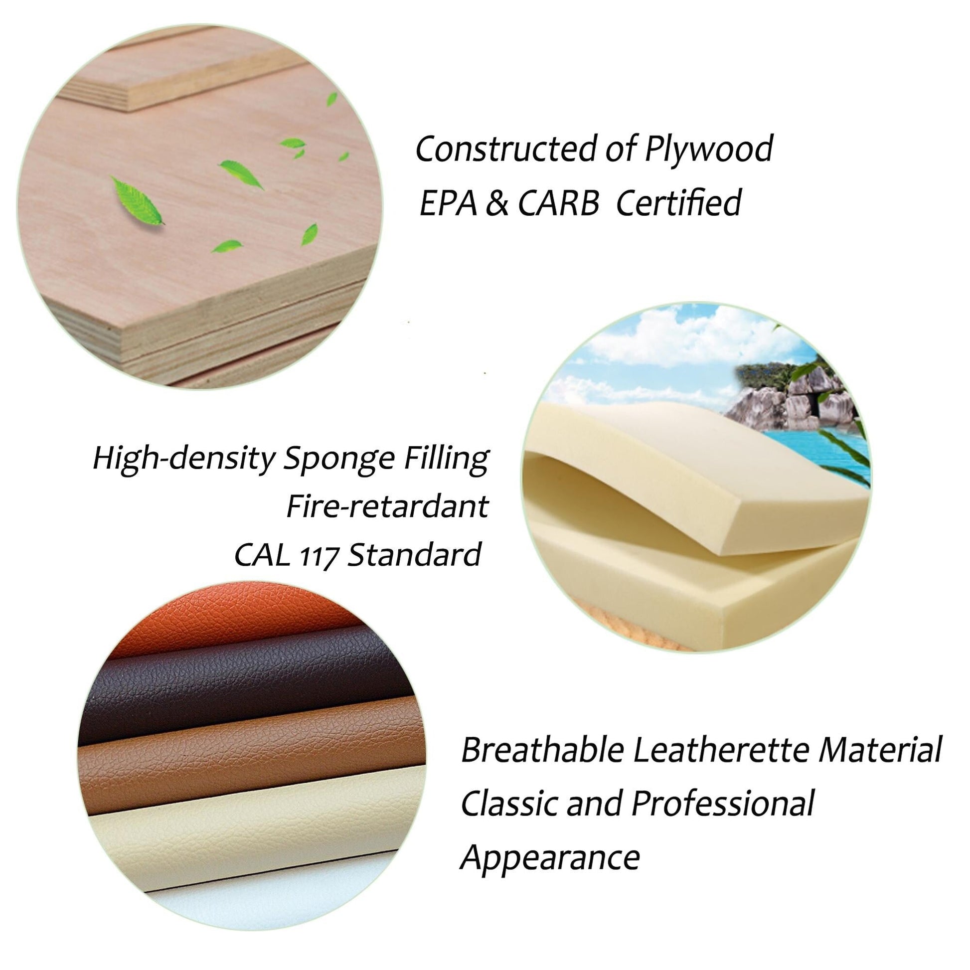 - Matériaux : cuir PU, mousse de polyuréthane, contreplaqué, acier