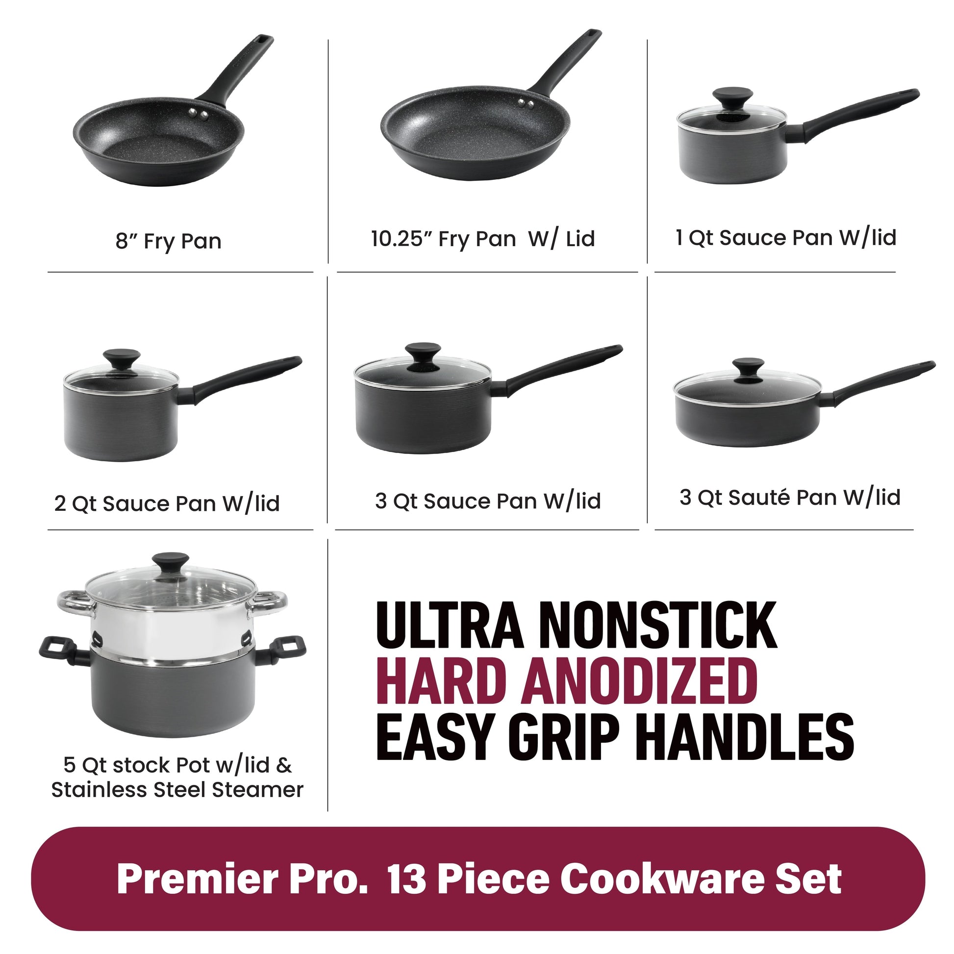 - Ensemble complet de 13 pièces : comprend une poêle de 20 cm, une poêle à frire de 26 cm avec couvercle, des casseroles de 1,5 L, 2 L et 3 L avec couvercles, une sauteuse de 3 L avec couvercle, une marmite de 5 L avec couvercle et un panier vapeur en acier inoxydable pour une solution de cuisine complète.