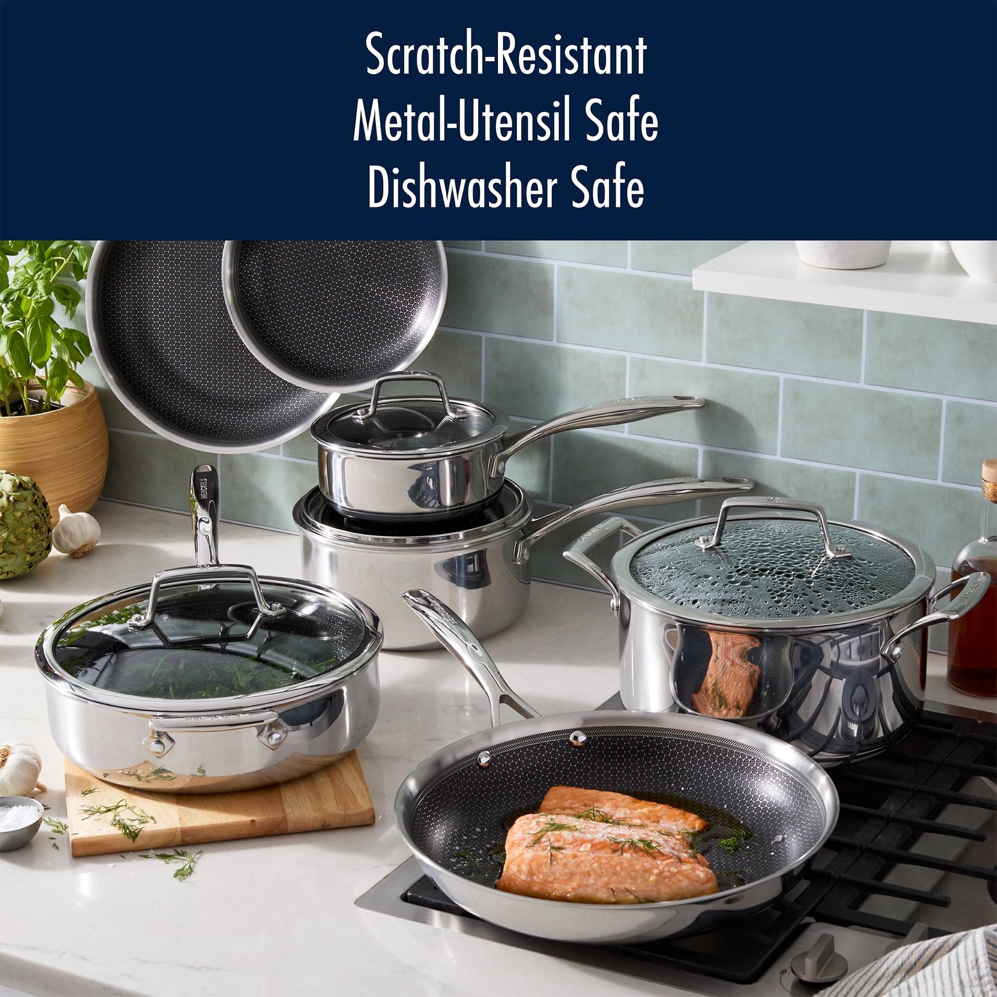 Saisissez et dorez vos aliments en toute sérénité, tout en profitant d'un démoulage et d'un nettoyage faciles grâce à la batterie de cuisine antiadhésive hybride HENCKELS Paradigm. Cet ensemble de poêles comprend 3 poêles indispensables pour la cuisine de tous les jours. Préparez des œufs brouillés dans la poêle de 20 cm, saisissez la viande et faites sauter les légumes dans celle de 25 cm, et cuisinez pour un grand nombre de convives dans celle de 28 cm. Un motif en relief en acier inoxydable et un revêtement antiadhésif triple couche s'associent pour offrir la polyvalence et la durabilité de l'acier inoxydable à la praticité de l'antiadhésif. Le revêtement innovant et la construction robuste en acier inoxydable triple couche garantissent des performances exceptionnelles, que vous fassiez dorer vos protéines préférées ou prépariez des omelettes légères et moelleuses. Parmi les caractéristiques pensées pour les chefs, on retrouve une poignée ergonomique en forme de V qui reste froide et qui est munie d'un anneau de suspension pour un rangement pratique, ainsi qu'un bord évasé pour verser sans éclaboussures. Compatible avec tous les types de feux et utilisable au four, vous pouvez saisir vos aliments sur la plaque de cuisson puis les transférer facilement au four. Compatible avec le lave-vaisselle, la gamme HENCKELS Paradigm est facile à nettoyer, ce qui rend la cuisine simple d'utilisation particulièrement agréable.