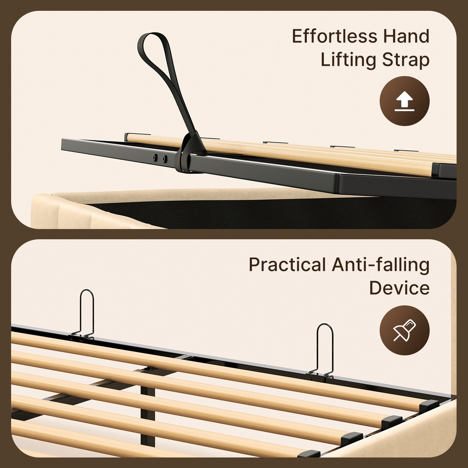 - Rangement optimisé : Le mécanisme de levage offre un grand espace de rangement pour la literie, les vêtements, les chaussures ou tout autre objet que vous souhaitez cacher, contribuant ainsi à désencombrer votre chambre.