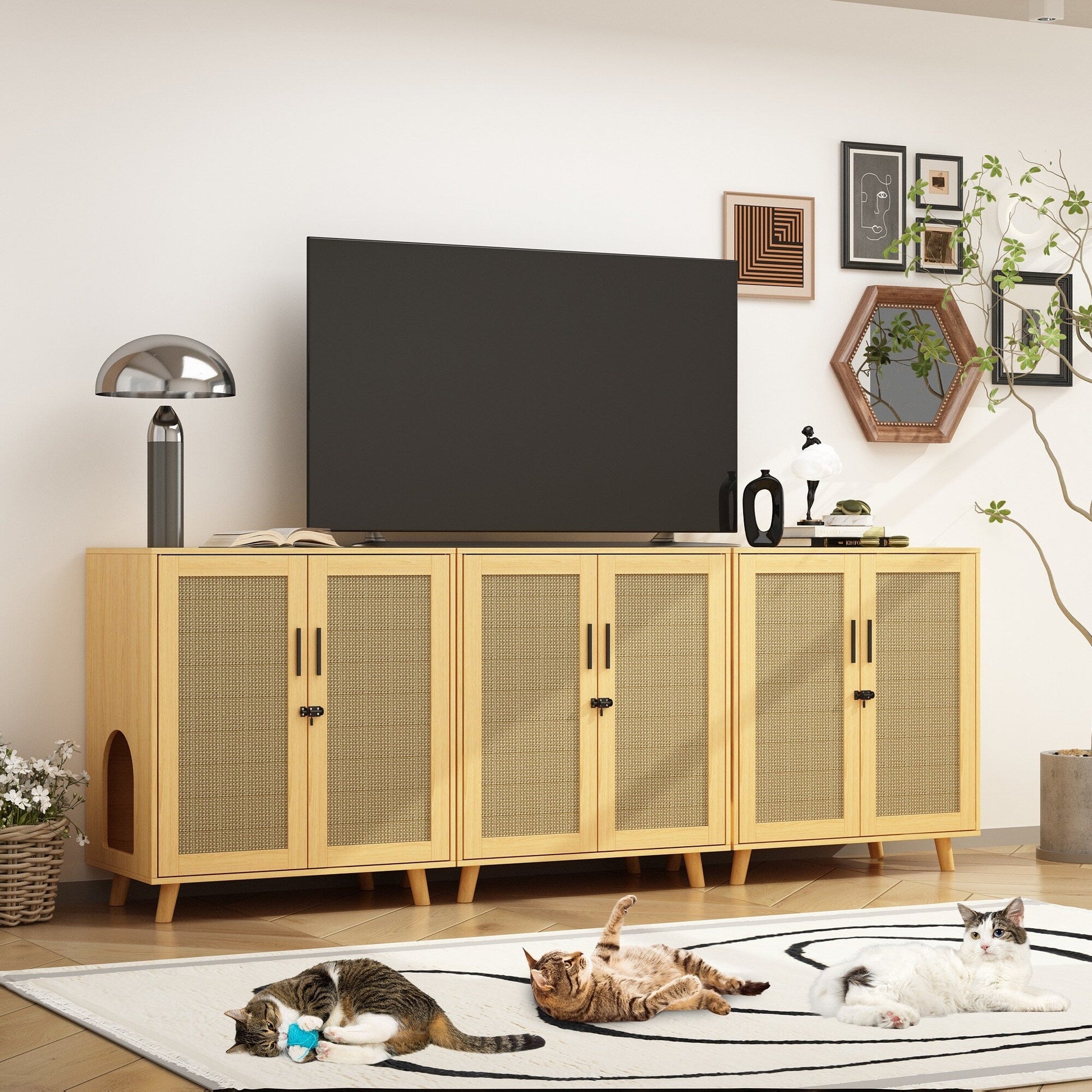 【Maison pour chat multifonctionnelle 4 en 1 :】 Ce meuble en rotin à 2 portes se transforme en une maison pour chat polyvalente répondant à divers besoins. Il dissimule la litière et offre un espace privé et confortable à votre compagnon à quatre pattes. De plus, il sert de rangement pour les friandises et les jouets, ainsi que de table d'appoint pratique dans la salle de bain ou de table de chevet, s'intégrant harmonieusement à votre décoration intérieure.