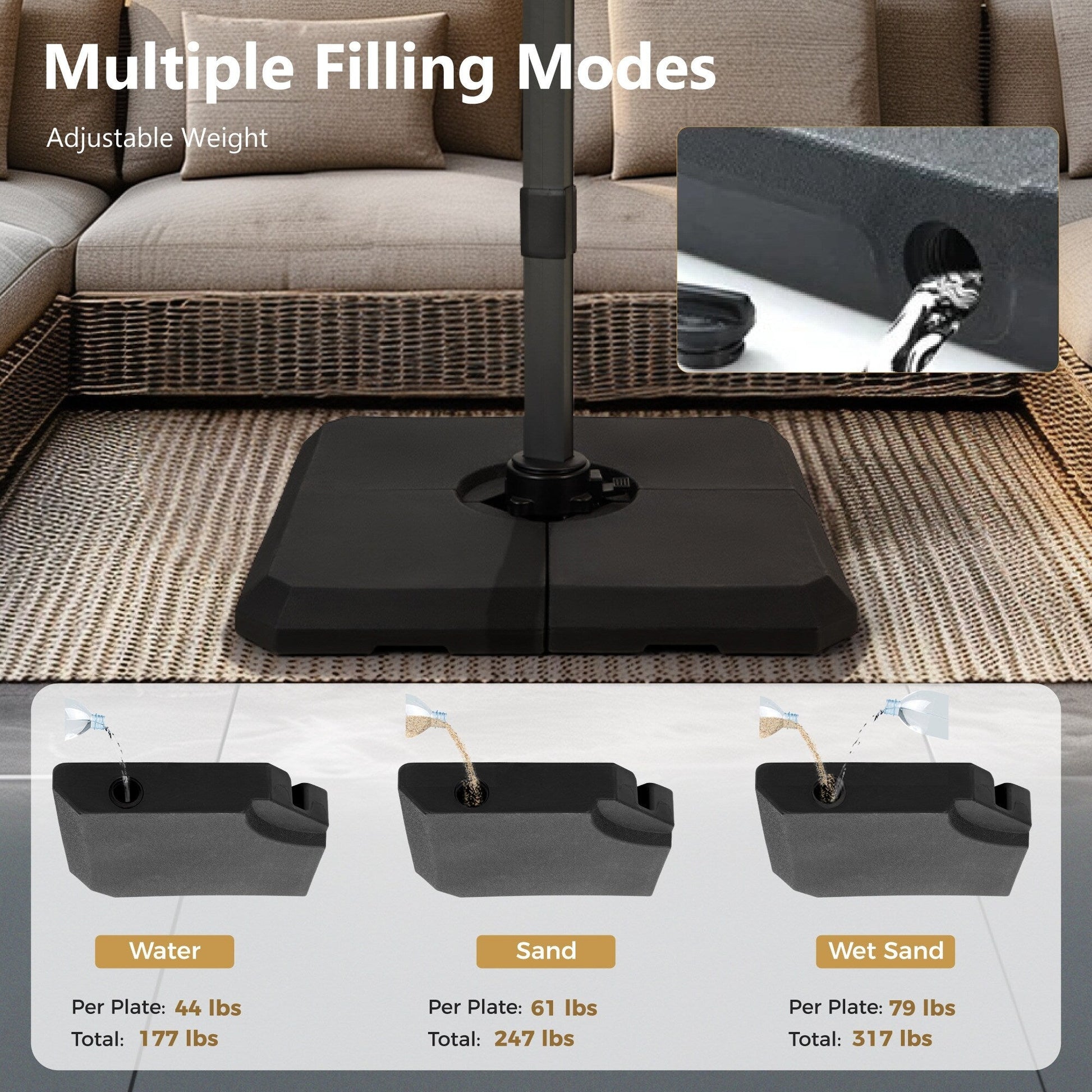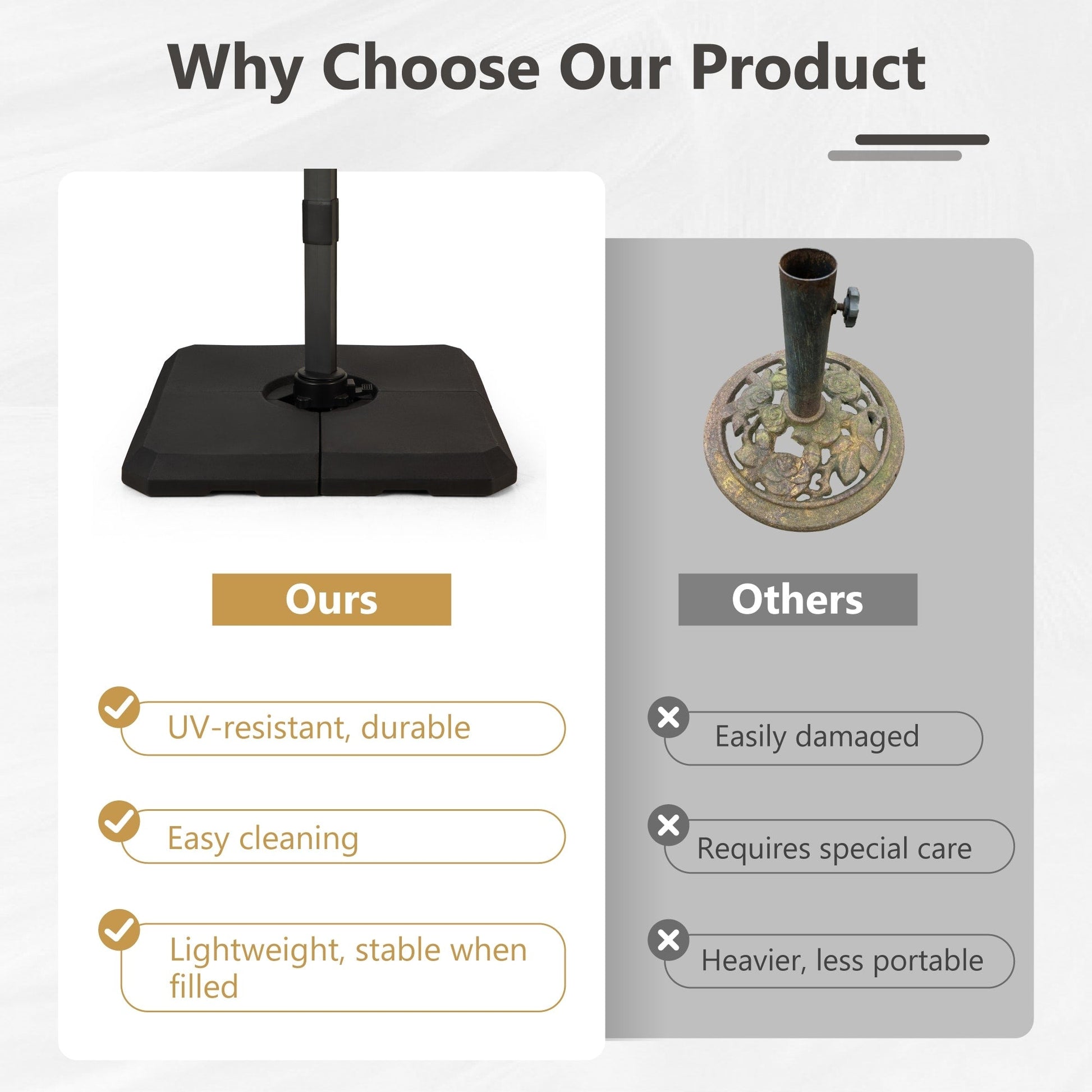 - Veuillez noter que tous les parapluies sont fournis avec un pied en croix, et vous pouvez choisir de l'acheter avec ou sans pied lesté.
