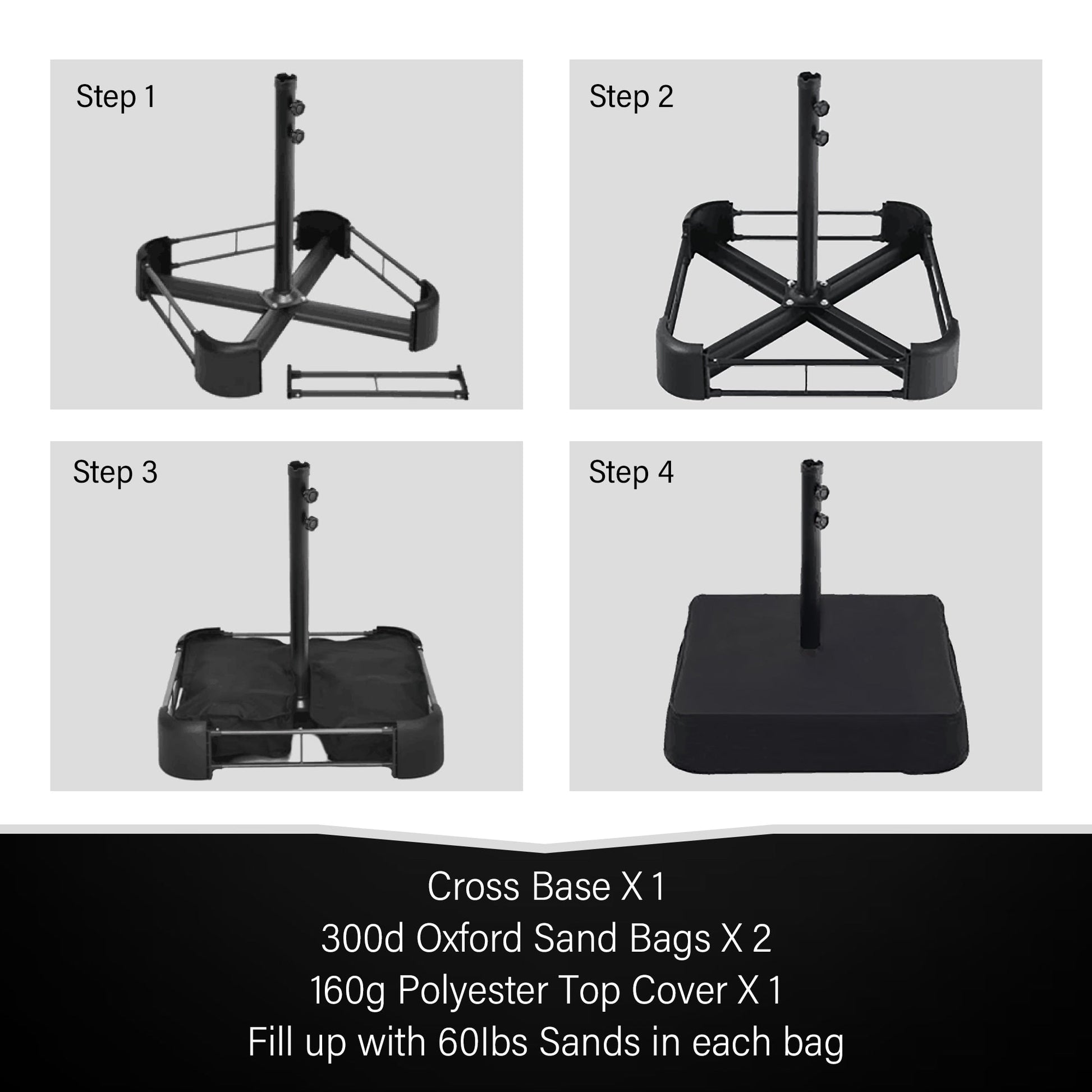 - Pied de parasol inclus pour une installation facile : Livré avec un pied en croix robuste en acier, deux sacs de sable résistants en tissu Oxford 300D et une housse de protection en polyester 180 g/m². Nous recommandons d’utiliser 45 kg de sable dans chaque sac pour une stabilité optimale.