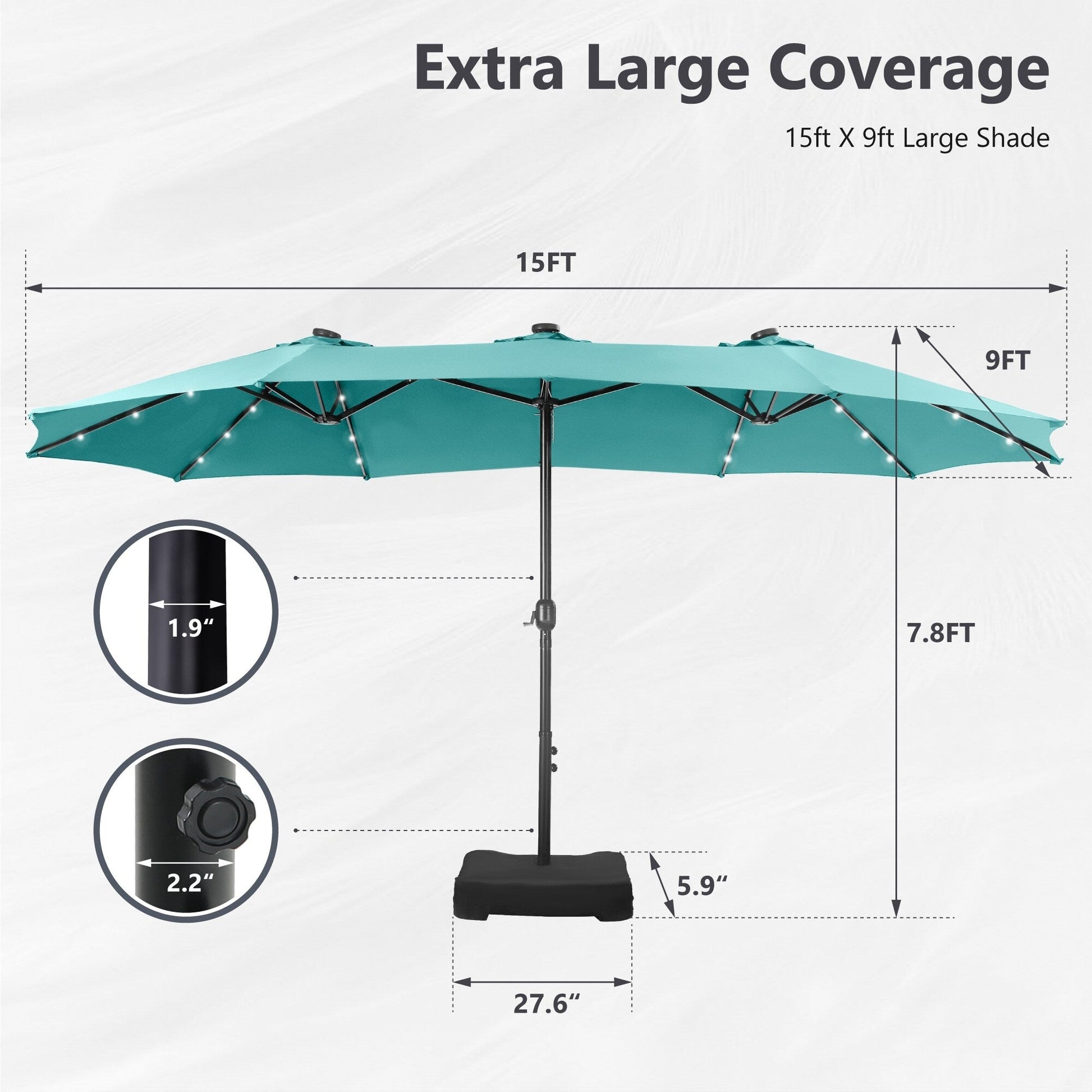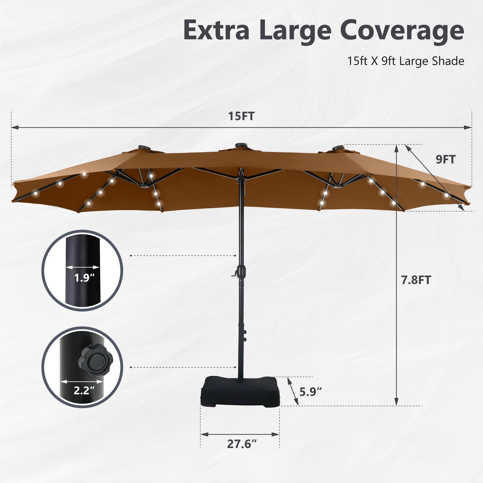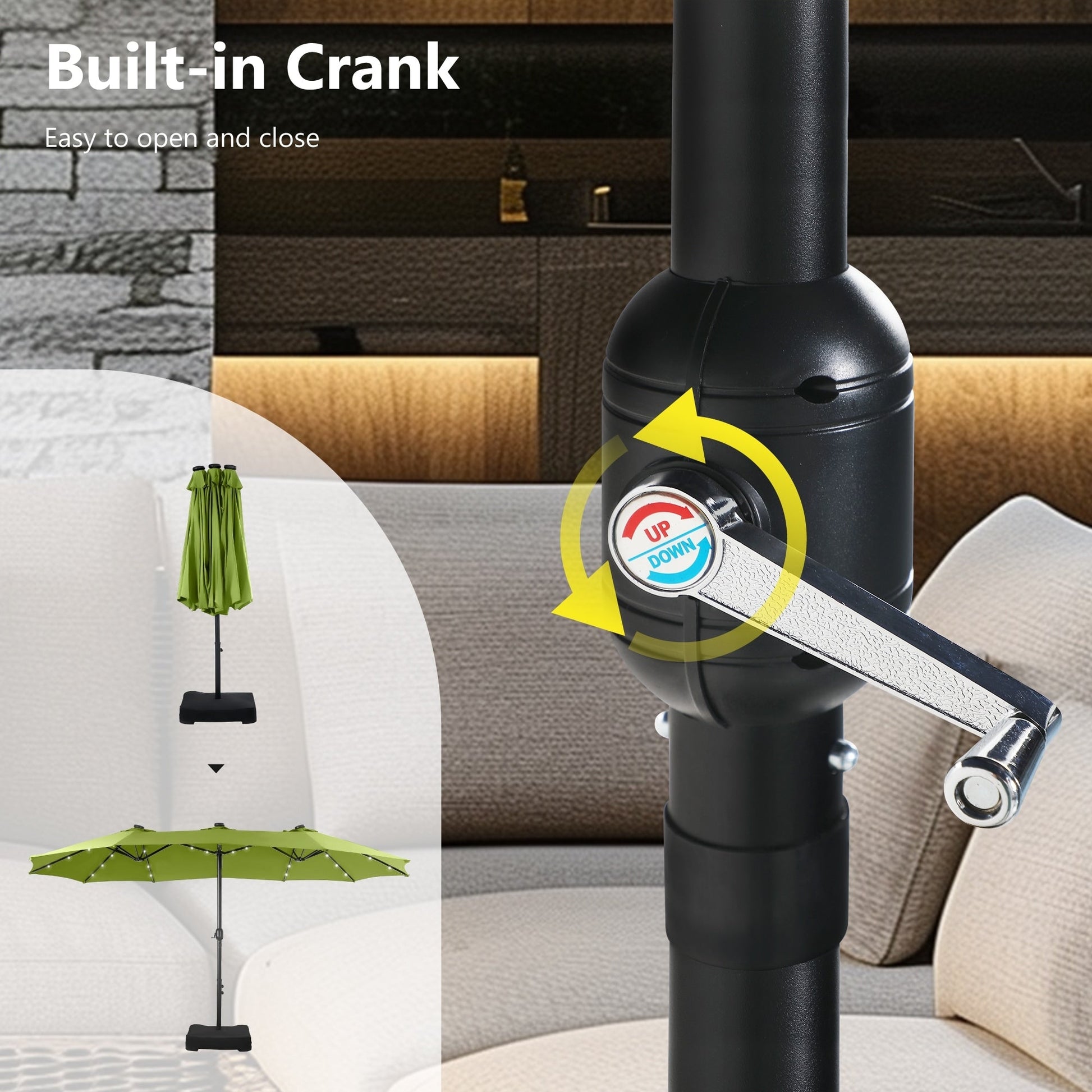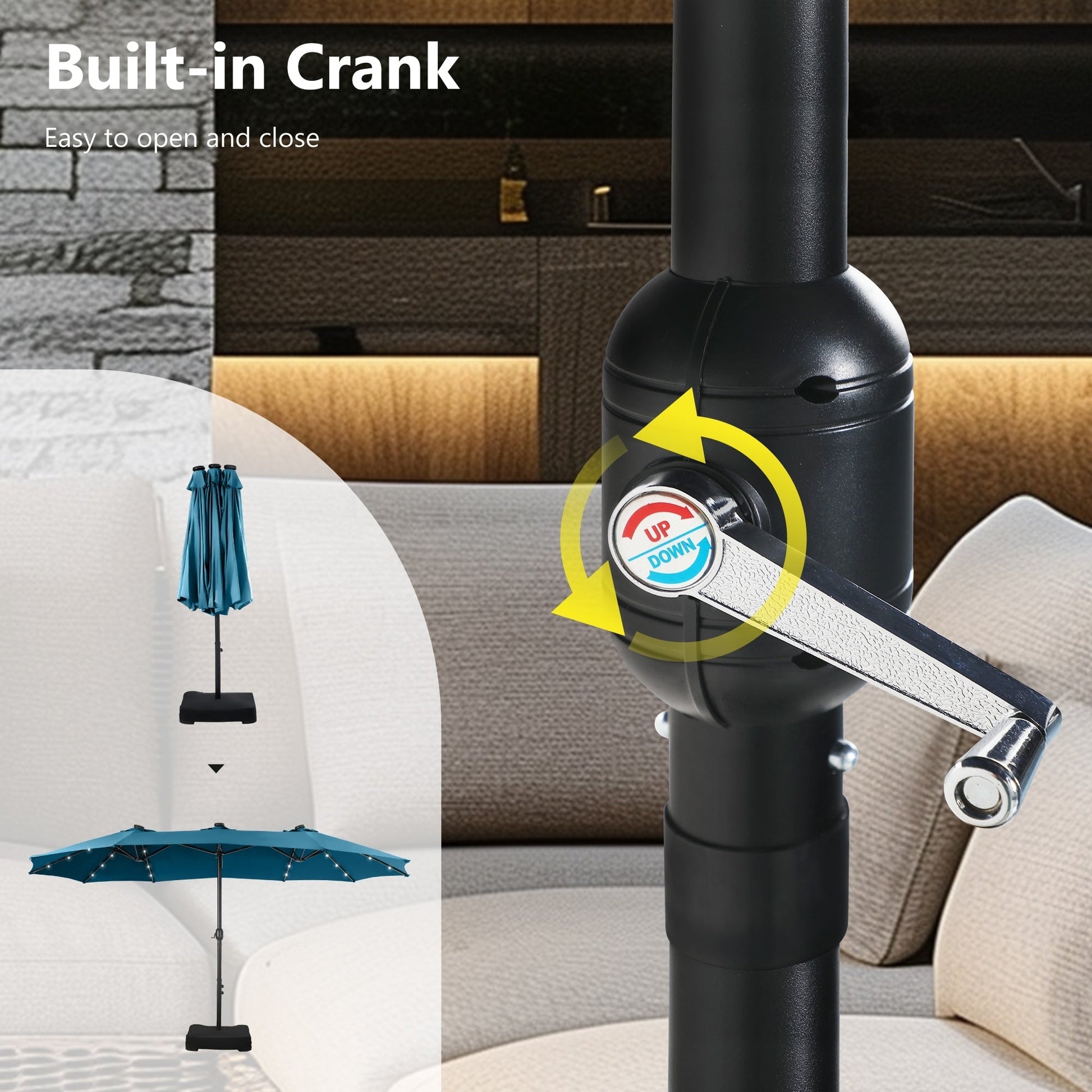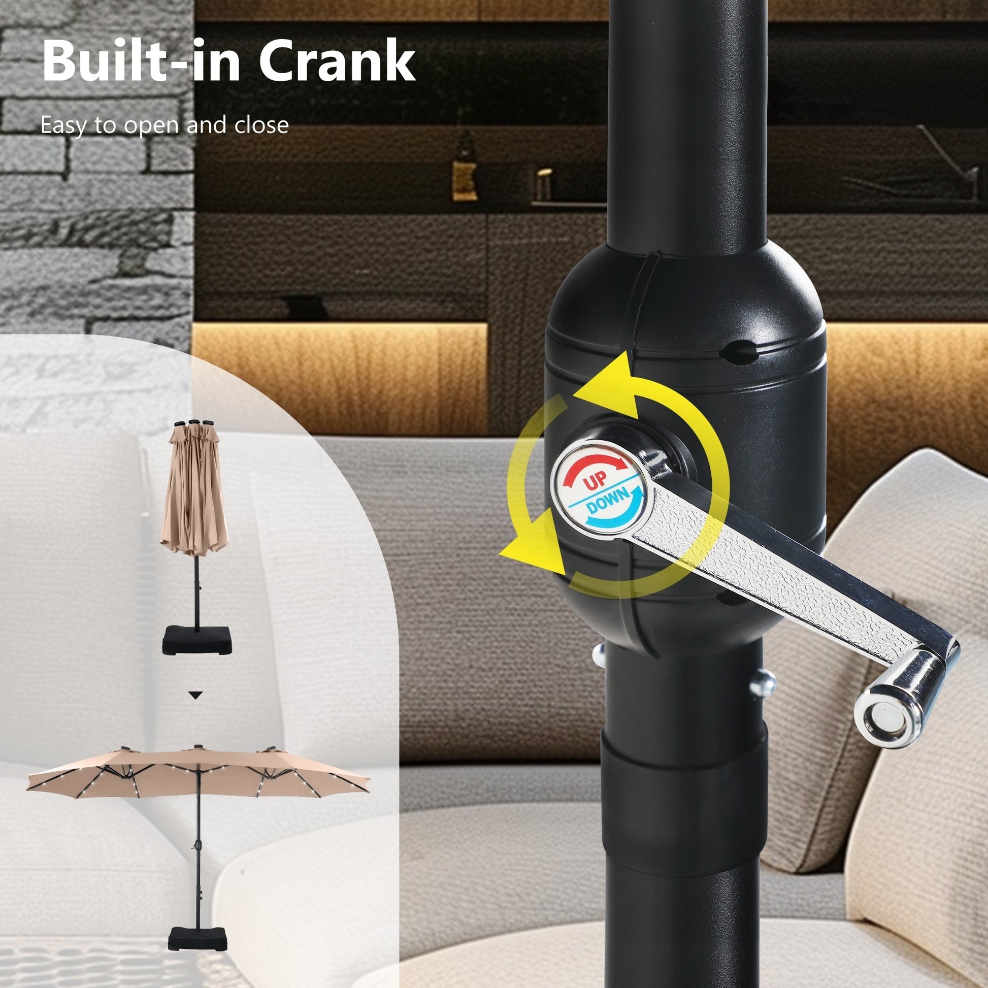 Parasol de marché d'extérieur rectangulaire à manivelle double face MAISON ARTS de 4,57 m (15 pi), avec éclairage solaire à DEL et base incluse