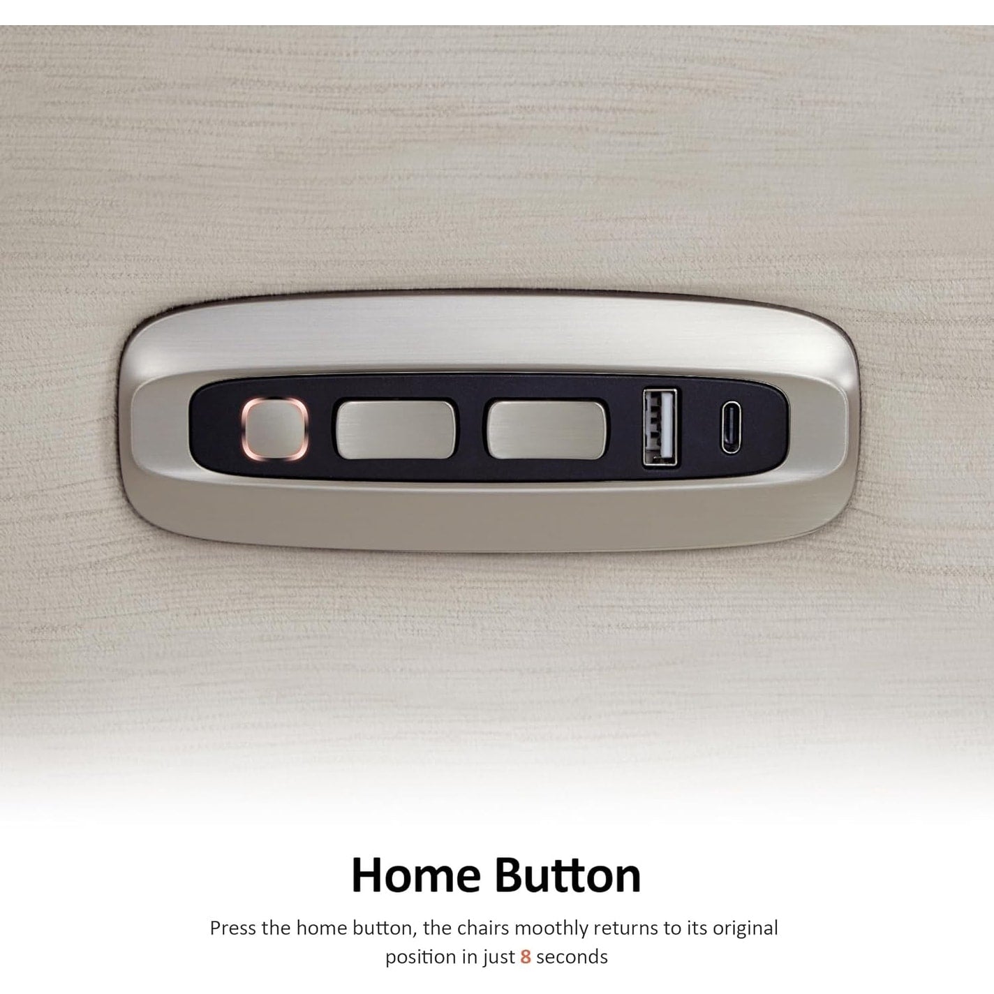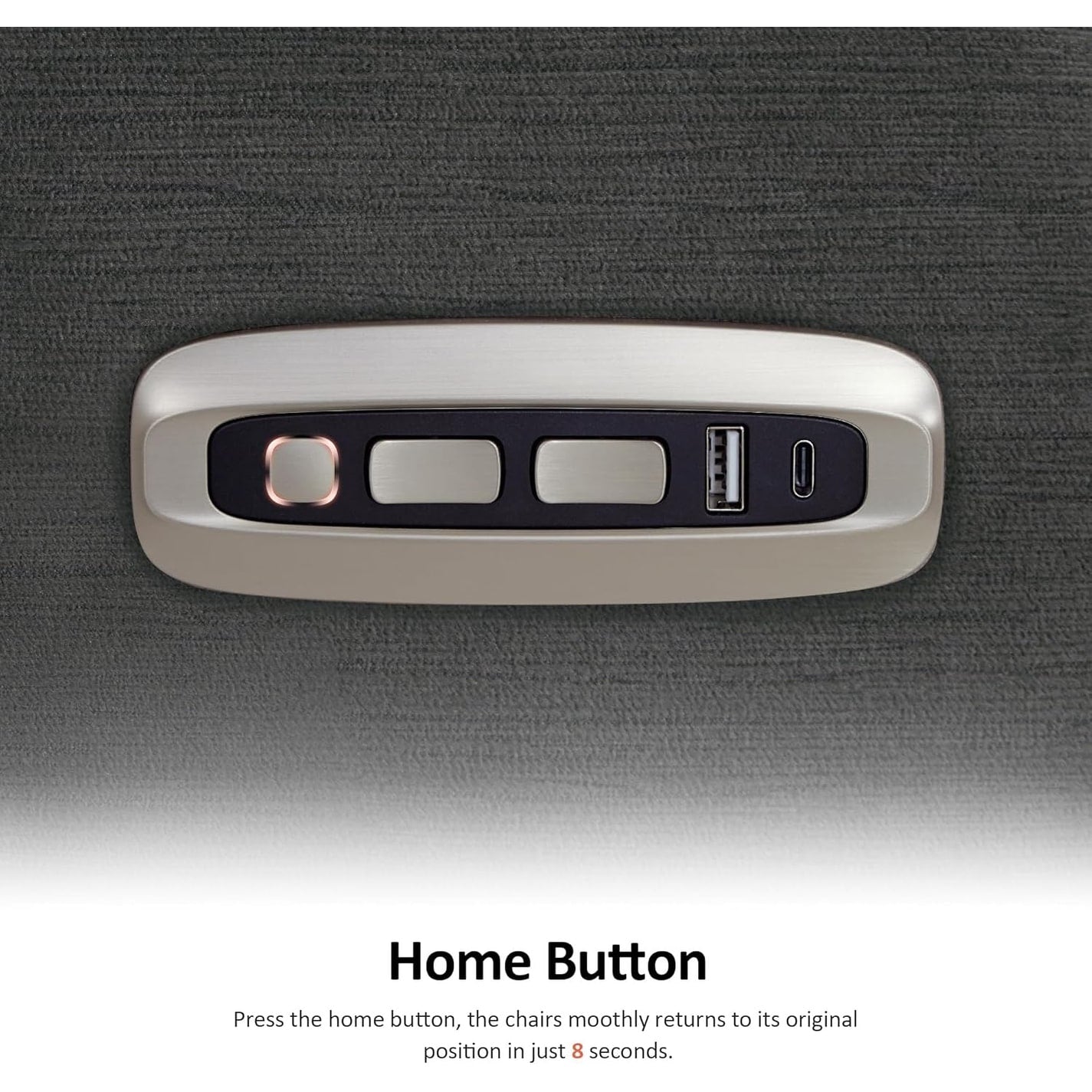 - Commande intuitive. Appuyez sur le bouton d'accueil et le fauteuil reprend sa position initiale en seulement 8 secondes. Les deux ports de charge USB et Type-C situés sur l'accoudoir permettent de recharger n'importe quel téléphone ou tablette.