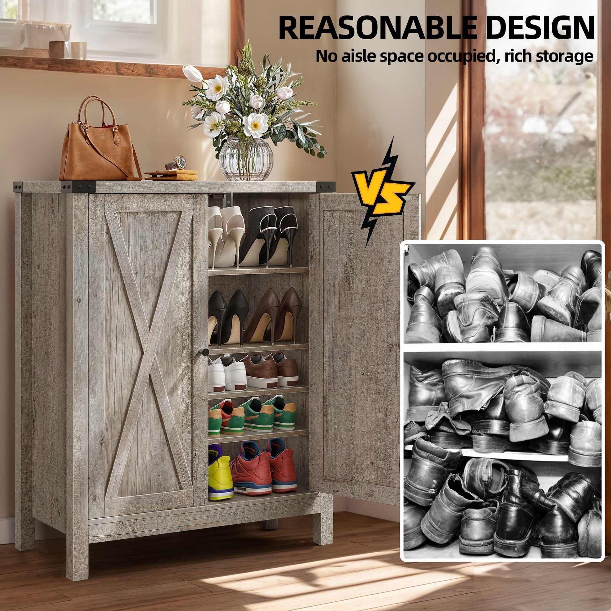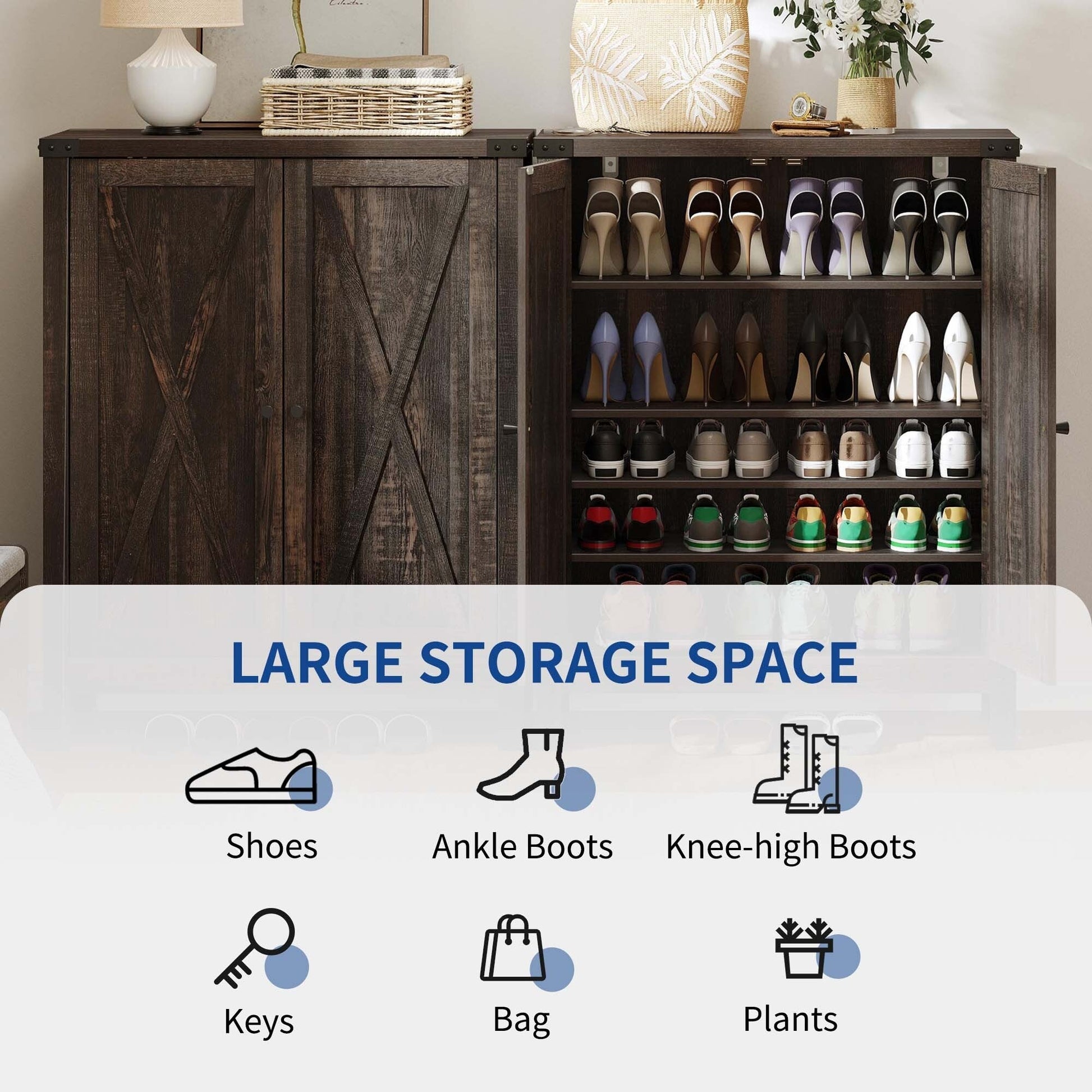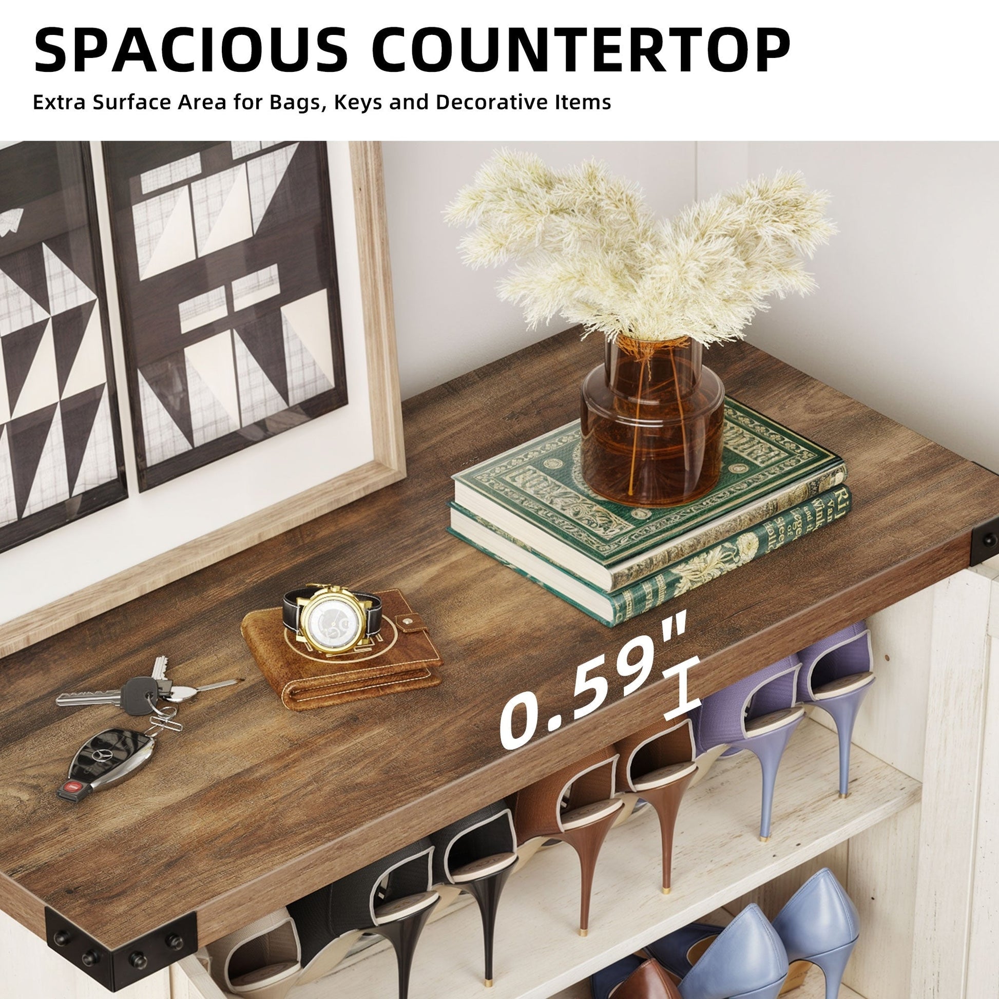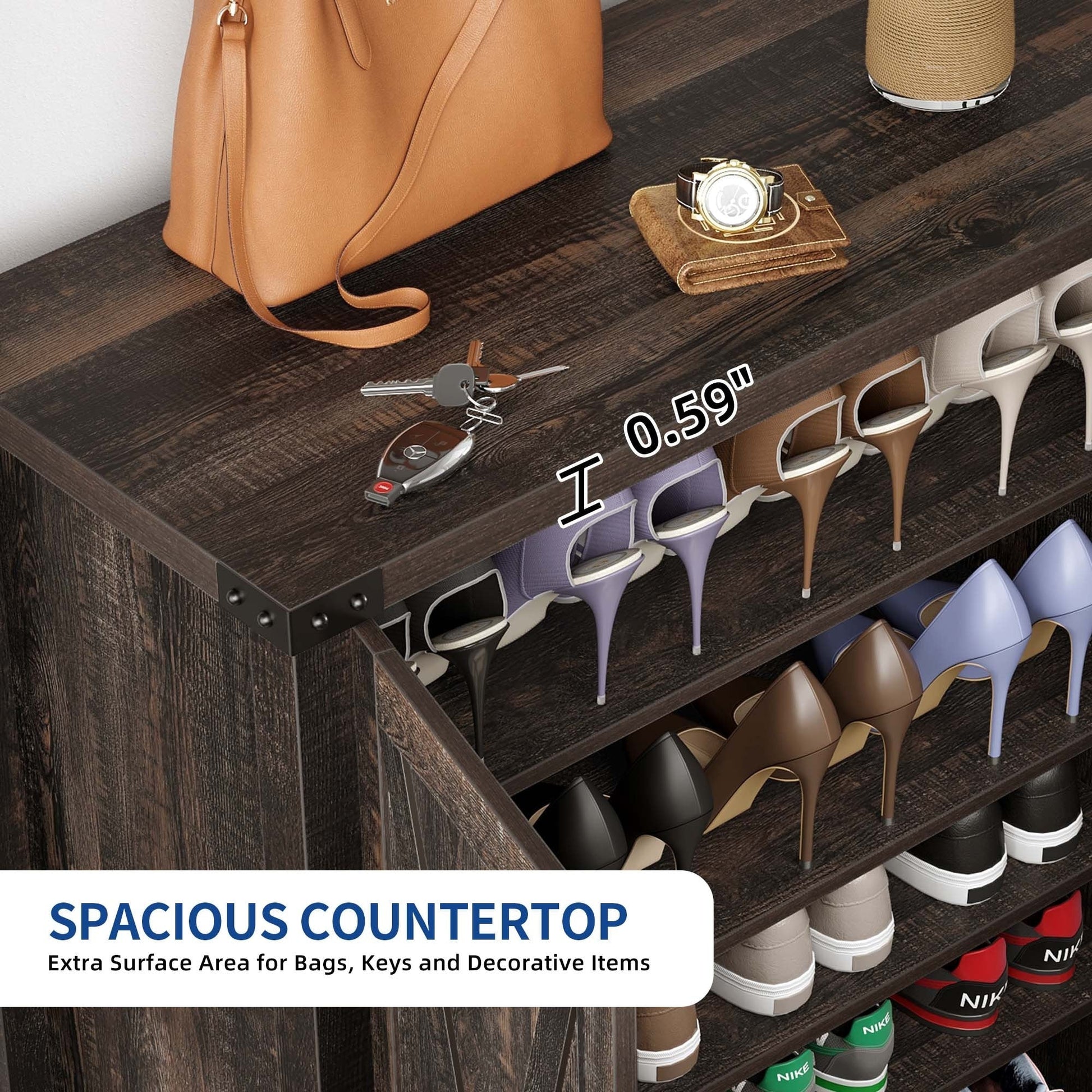- Un grand espace de rangement peut accueillir 15 à 20 paires de chaussures et de petits objets.