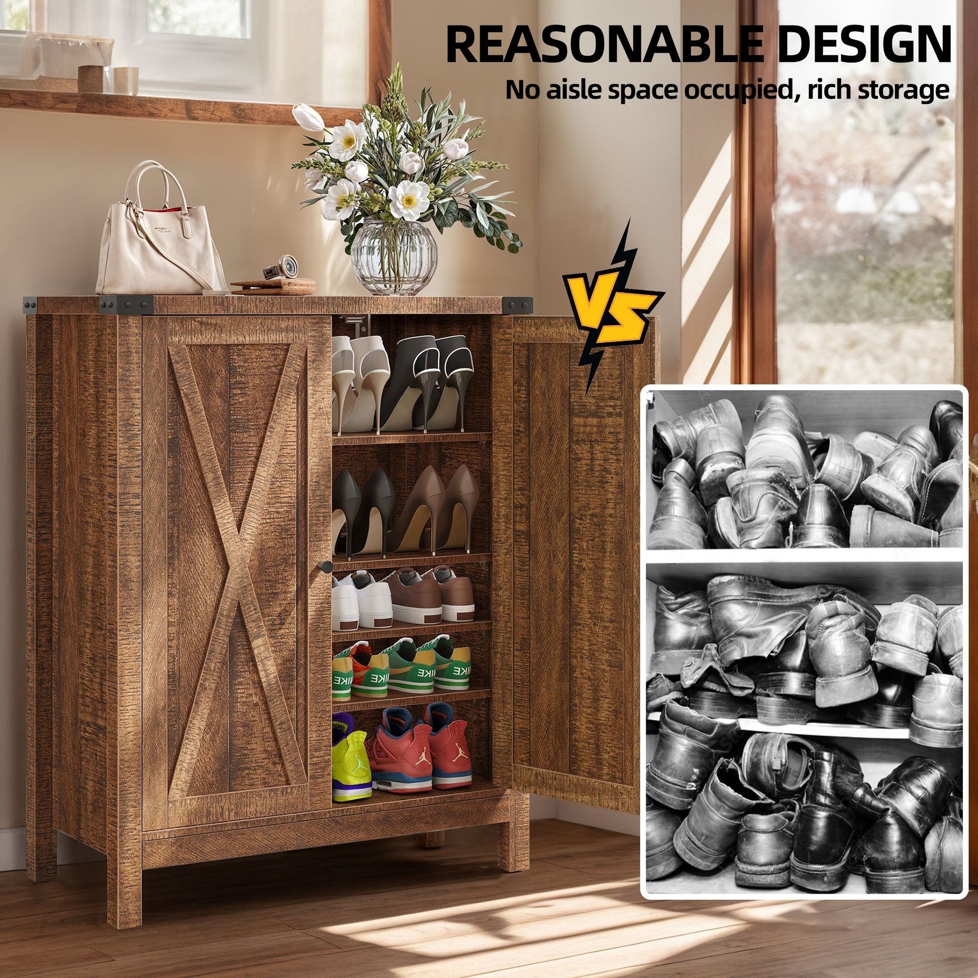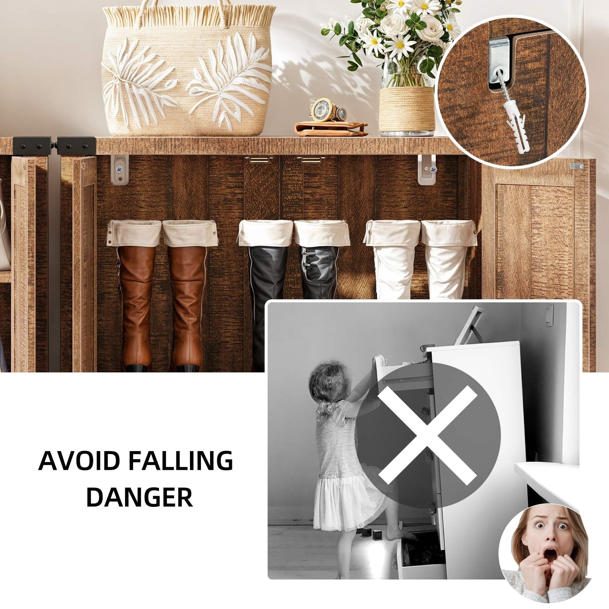 Optimisez le rangement de votre maison avec notre spacieux meuble à chaussures. Doté de 5 étagères pouvant accueillir 15 à 20 paires de chaussures et d'un plateau pratique pour les petits objets, il deviendra vite un indispensable. Son élégant motif en X lui confère un charme rustique, tandis que les 1re et 3e étagères réglables s'adaptent à tous les types de chaussures. Fabriqué en MDF résistant avec des pieds en bois robustes, il est conçu pour une stabilité et une durabilité optimales. N'oubliez pas d'installer le kit anti-basculement fourni pour plus de sécurité.