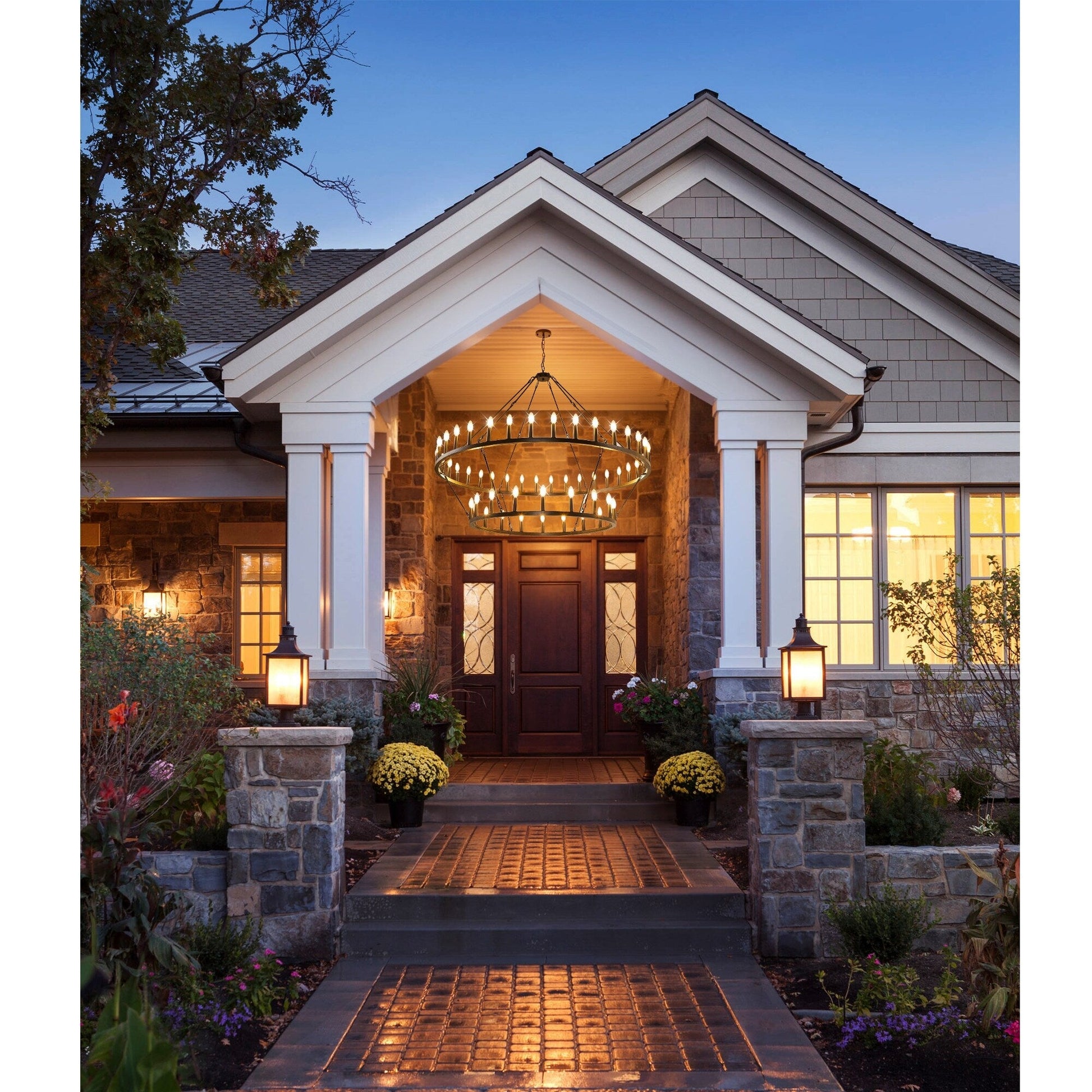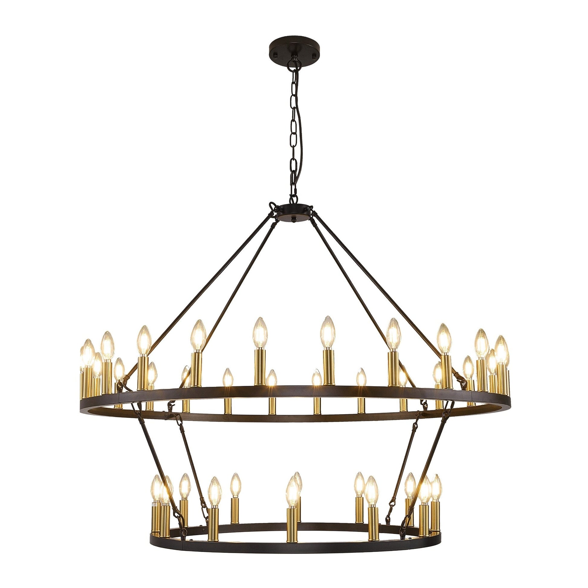 Apportez une touche de style champêtre moderne à votre intérieur avec ce lustre moderne à deux niveaux, inspiré des roues de chariot. Ce lustre classique, fabriqué en fer de haute qualité et sablé pour une finition mate, est très résistant. Ses 36 lumières réparties sur deux niveaux offrent un éclairage à 360°, créant une ambiance chaleureuse. Ce grand lustre est idéal pour illuminer de vastes espaces comme un salon, une salle à manger ou un hall d'entrée sur deux niveaux.