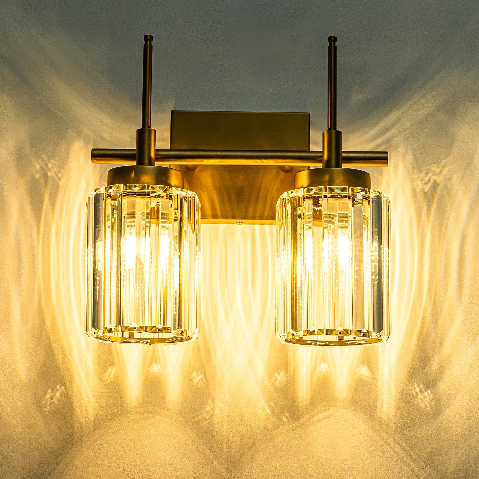 Sublimez l'élégance et le raffinement de votre salle de bain avec notre applique murale en cristal. Cette applique en laiton brossé est dotée d'une structure métallique robuste et d'un abat-jour en cristal taillé avec précision, garantissant sa durabilité et son charme intemporel. Elle promet de rehausser l'esthétique de votre pièce avec raffinement et élégance. Des abat-jour en cristal de qualité supérieure sont suspendus à une tige métallique dorée, complétant ainsi son allure élégante. Chaque abat-jour cylindrique en cristal dissimule un charmant spectre de couleurs irisées, captivant le regard même à la lumière naturelle et devenant un point focal fascinant pour votre miroir de salle de bain ou de dressing.