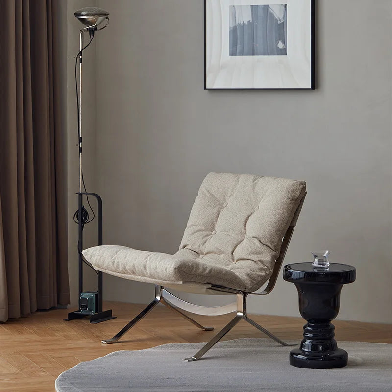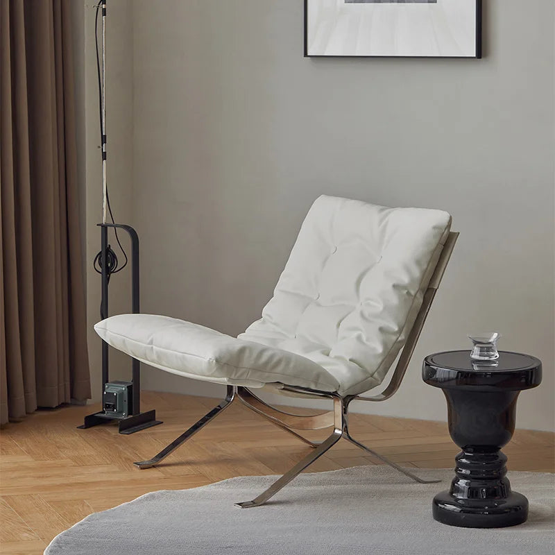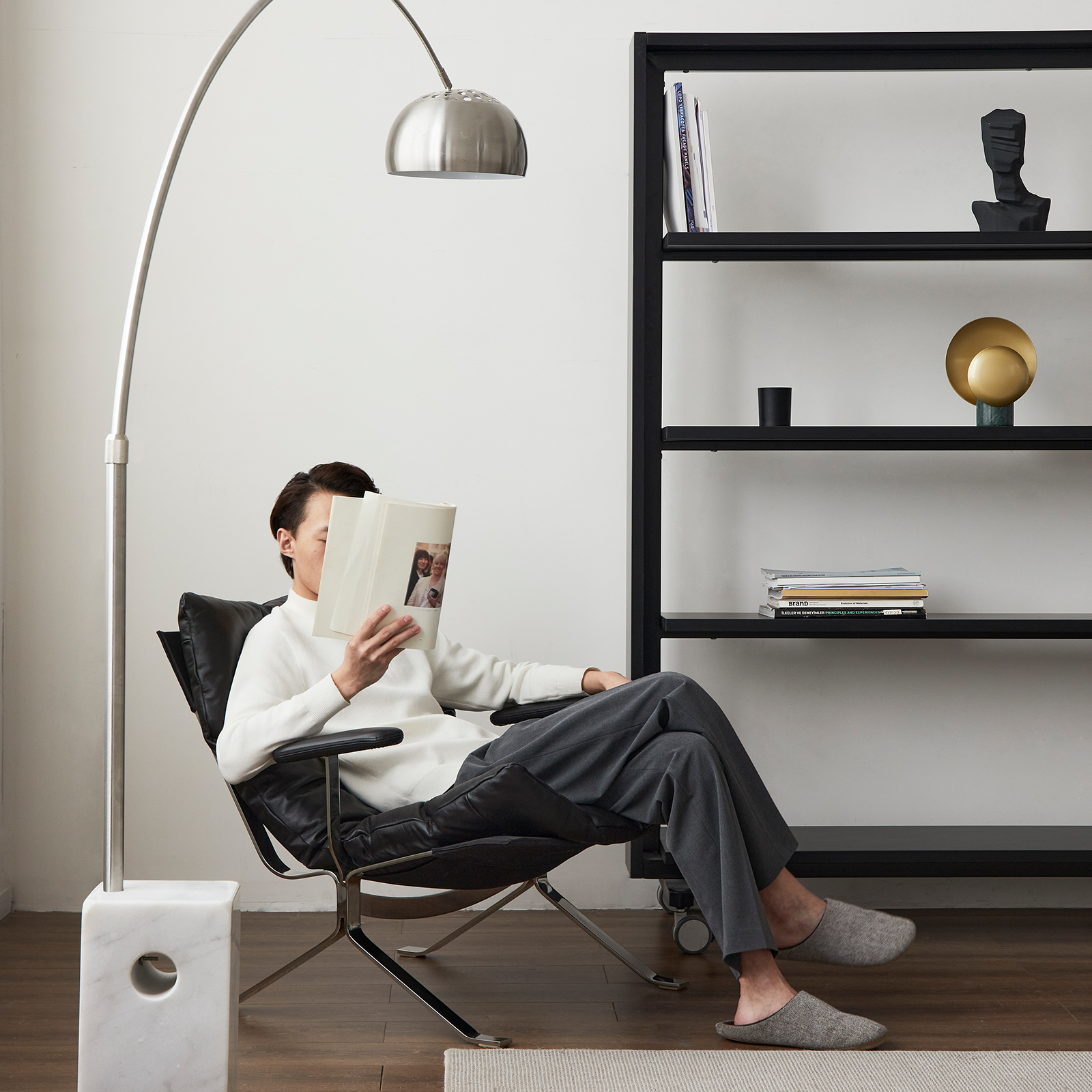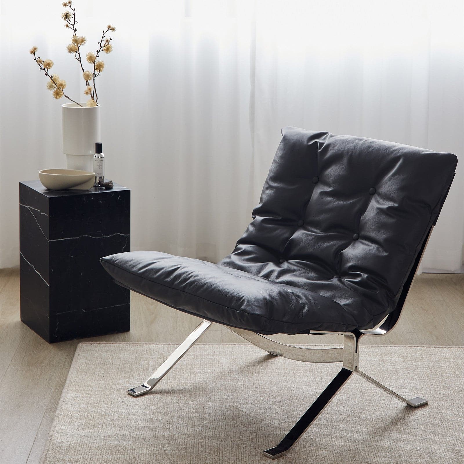 Il est doté d'une assise en cuir rembourrée de duvet d'oie et d'un piètement en acier poli miroir. Son élégance, fruit de l'éclat métallique et du cuir véritable, s'accorde à un style de vie résolument contemporain.