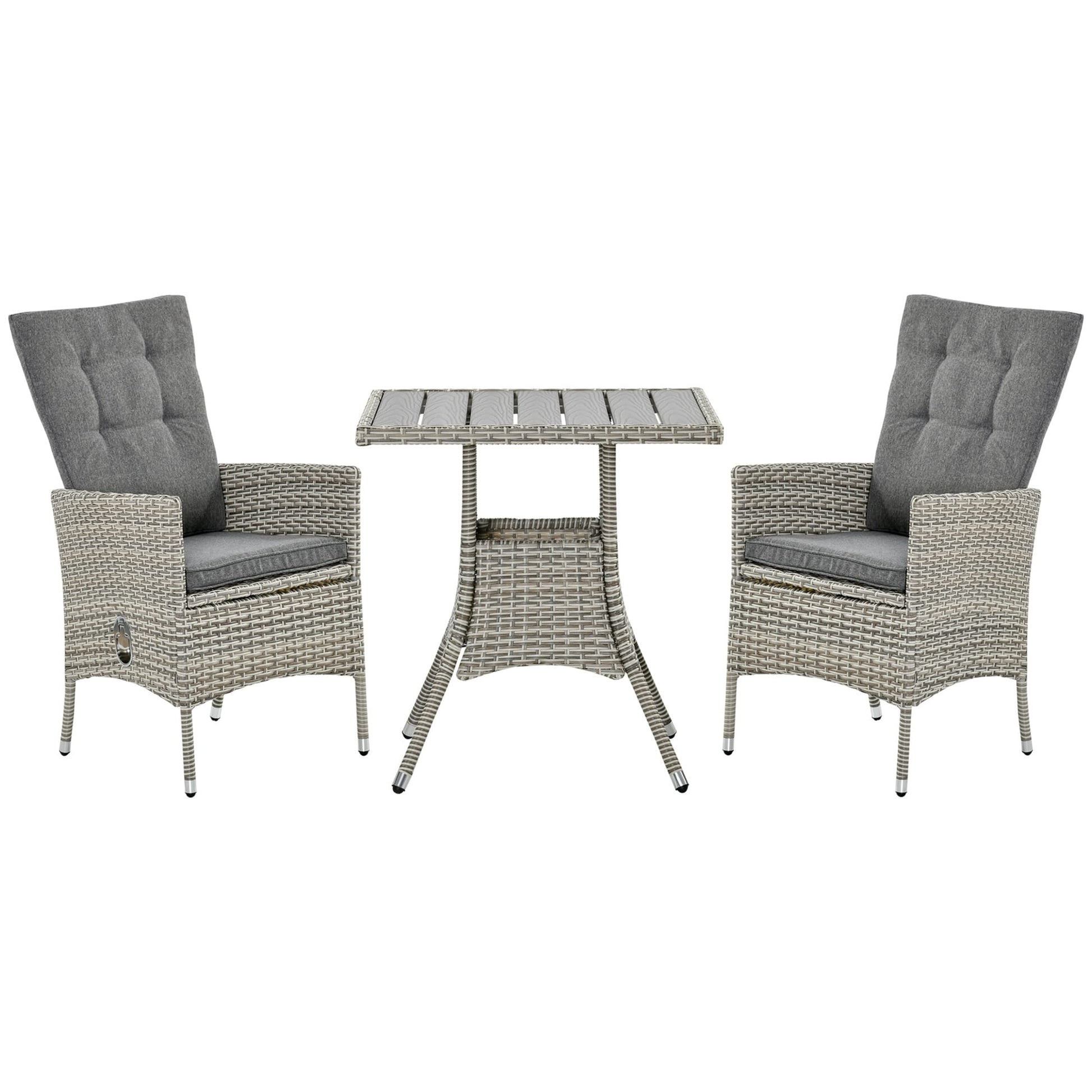 Apportez le confort de votre intérieur à l'extérieur avec Outsunny. Notre ensemble de mobilier de jardin trois pièces comprend deux fauteuils inclinables en résine tressée et une table basse d'extérieur. Installez-vous confortablement dans l'assise moelleuse et le dossier haut inclinable. La table basse arbore un élégant design en imitation bois, agencé en lattes pour faciliter l'écoulement de l'eau après la pluie. Notre rotin PE offre tout le charme du rotin tressé traditionnel, avec une meilleure résistance à l'eau et aux intempéries. Sortez, installez-vous confortablement, choisissez Outsunny.