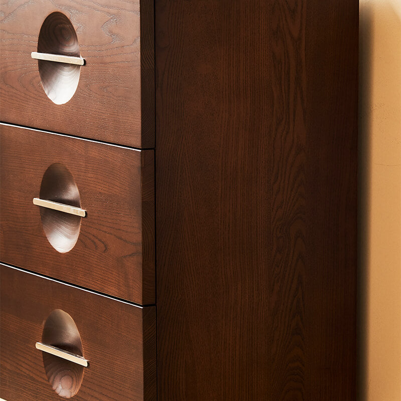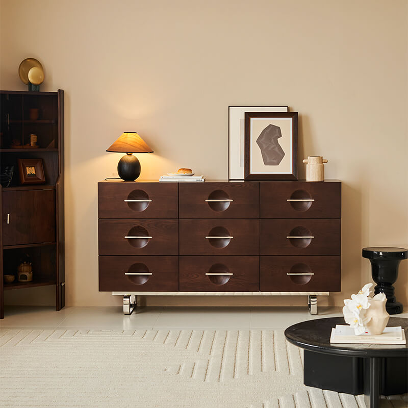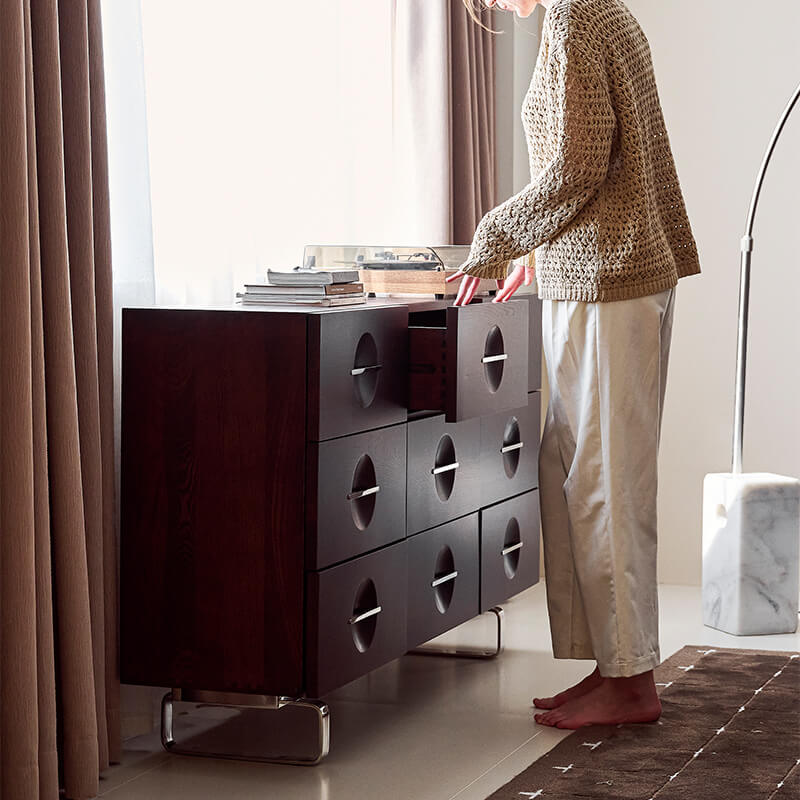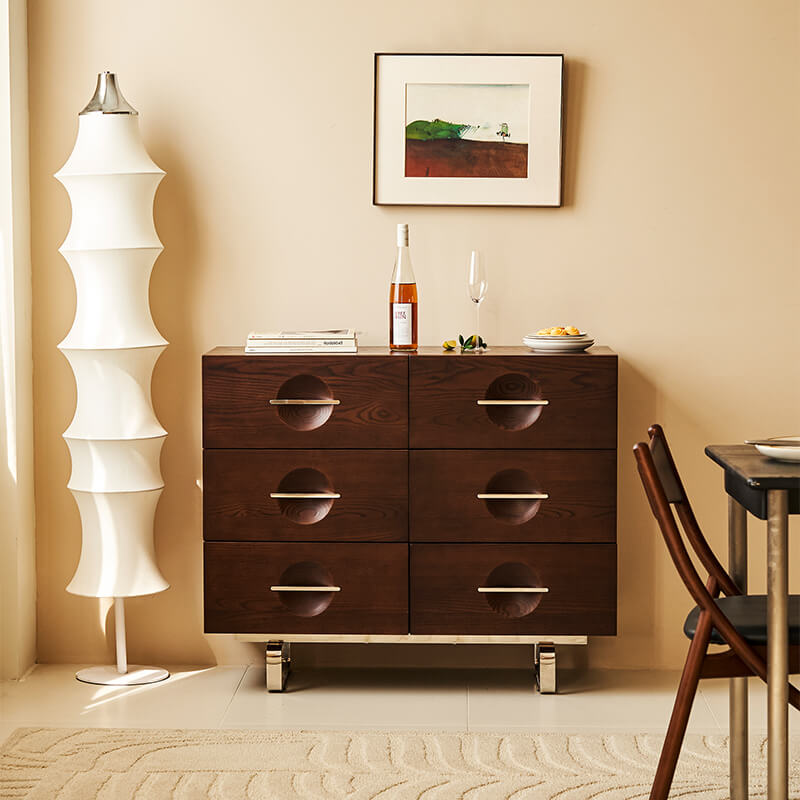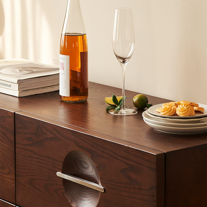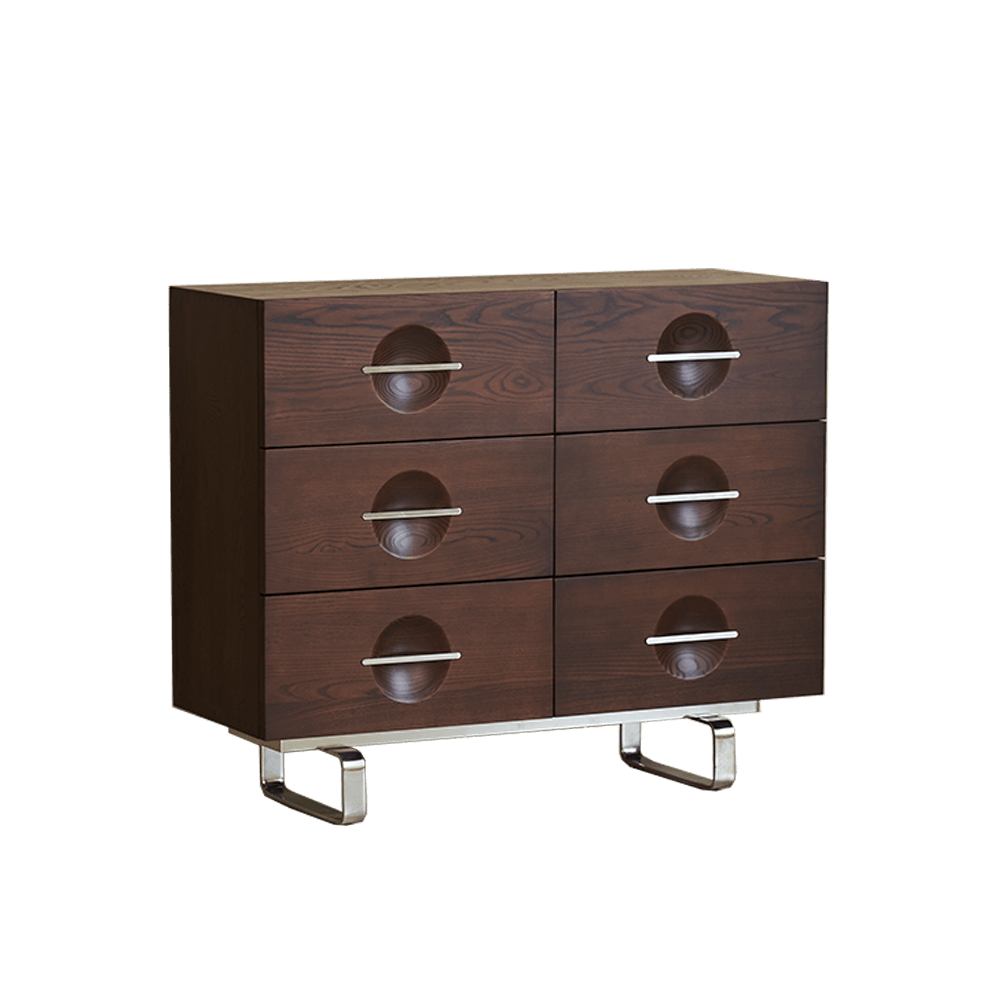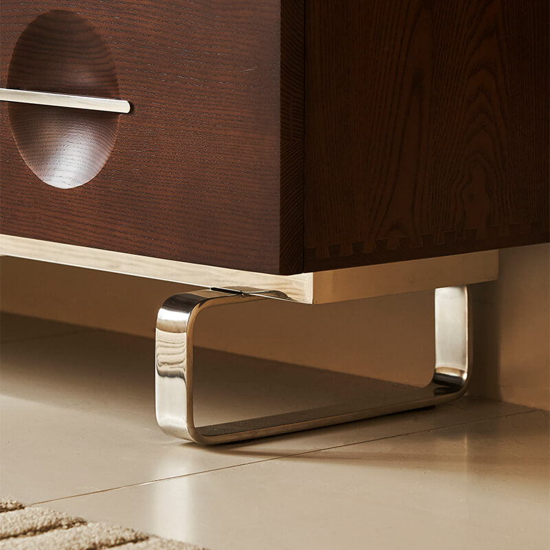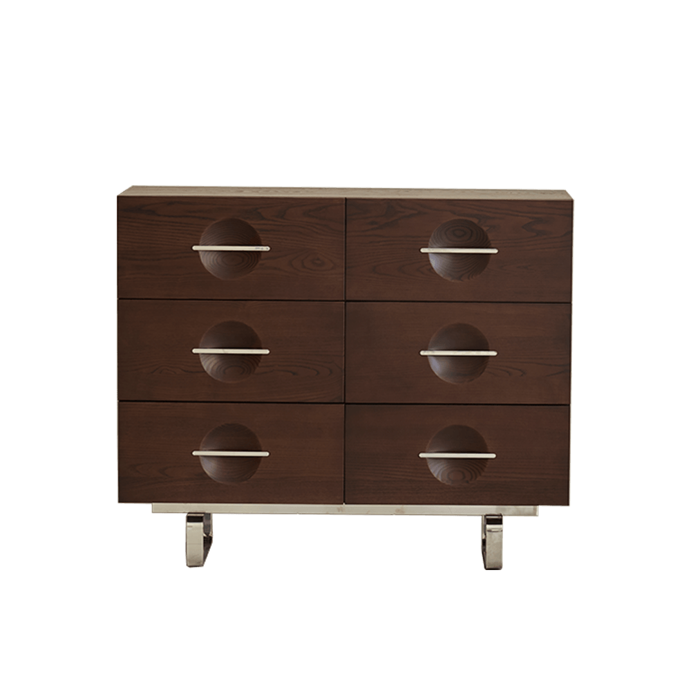 Inspirée des planètes de l' univers , la forme géométrique de ce buffet et les surfaces concaves arrondies des portes créent un effet visuel soigné et élégant . Les poignées en métal , soigneusement taillées et polies , soulignent le langage de la découpe .