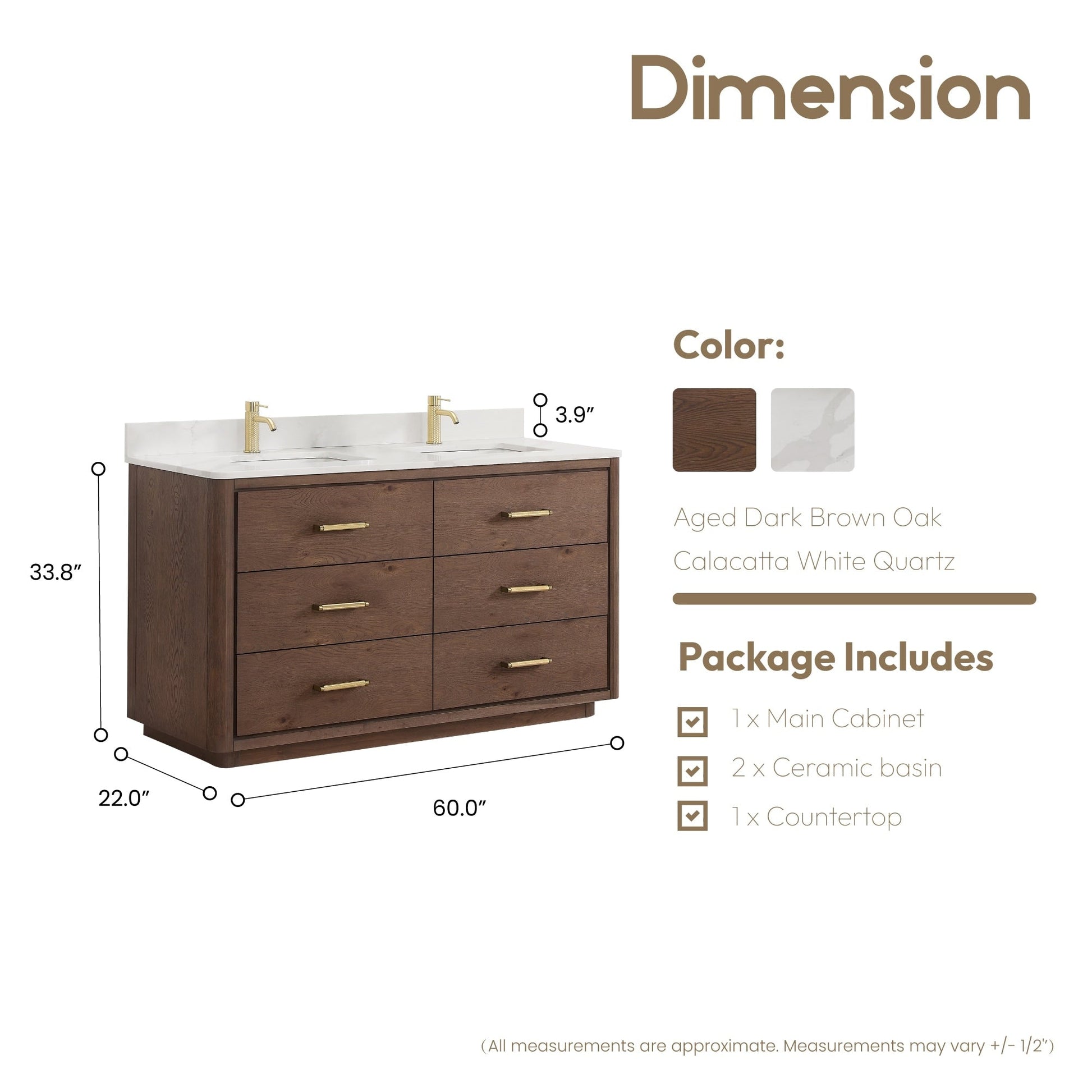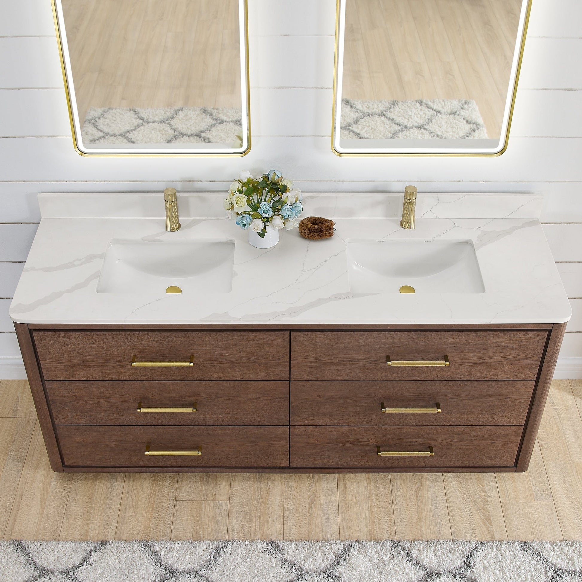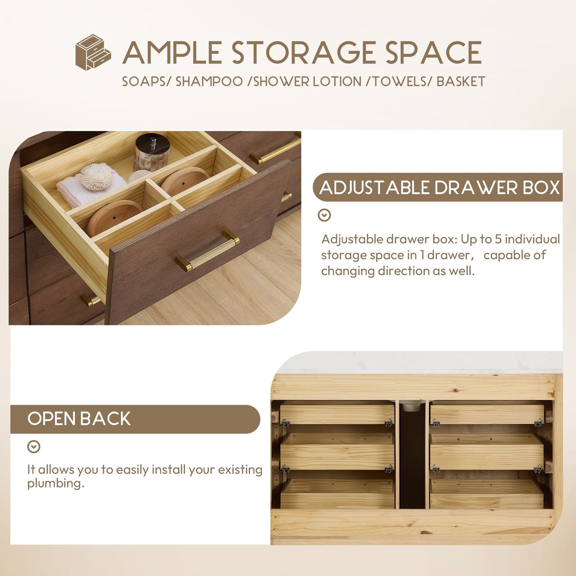 60 pouces - Six tiroirs robustes à fermeture douce et à queue d'aronde sont dotés de séparations intégrées pour un accès facile à tous vos articles de toilette.