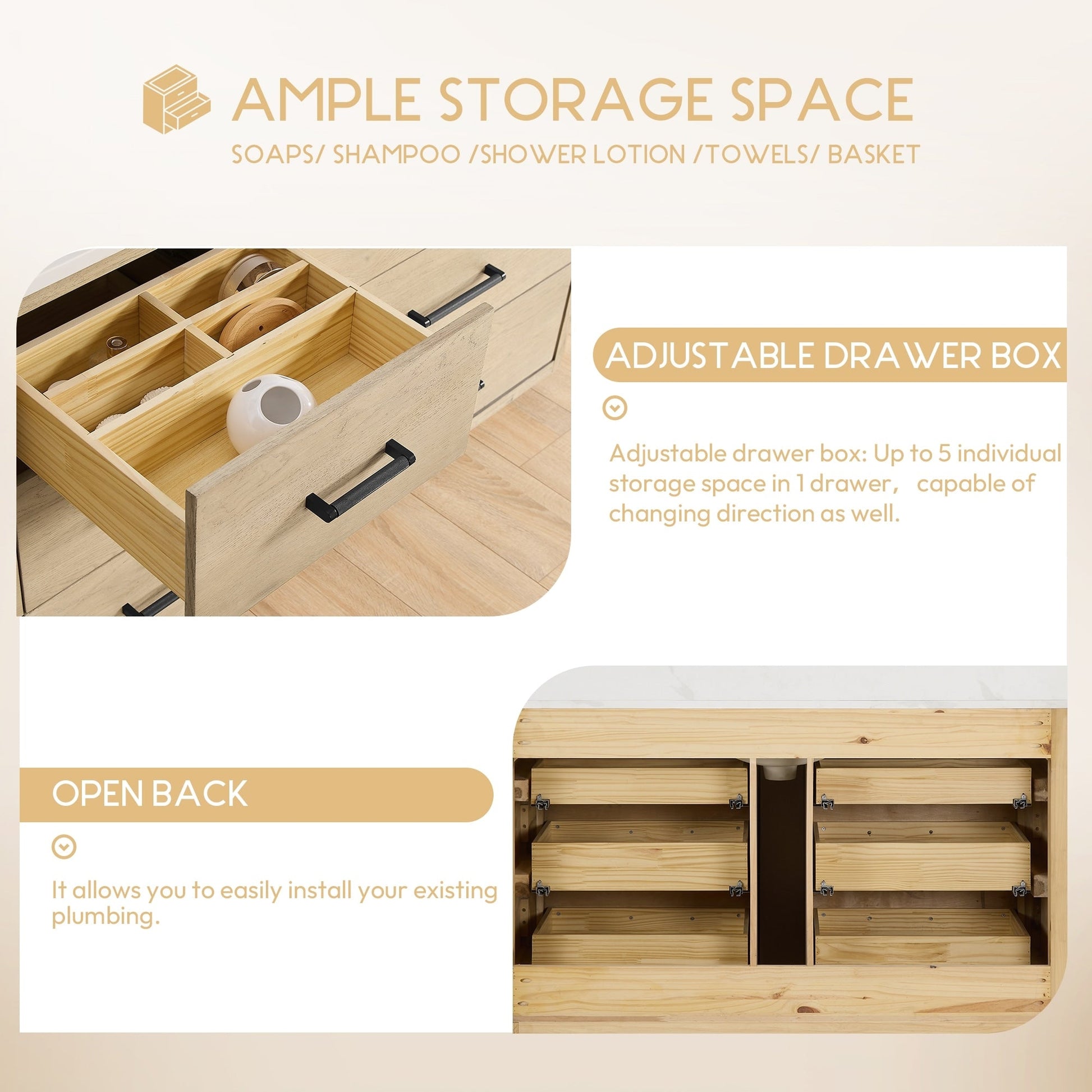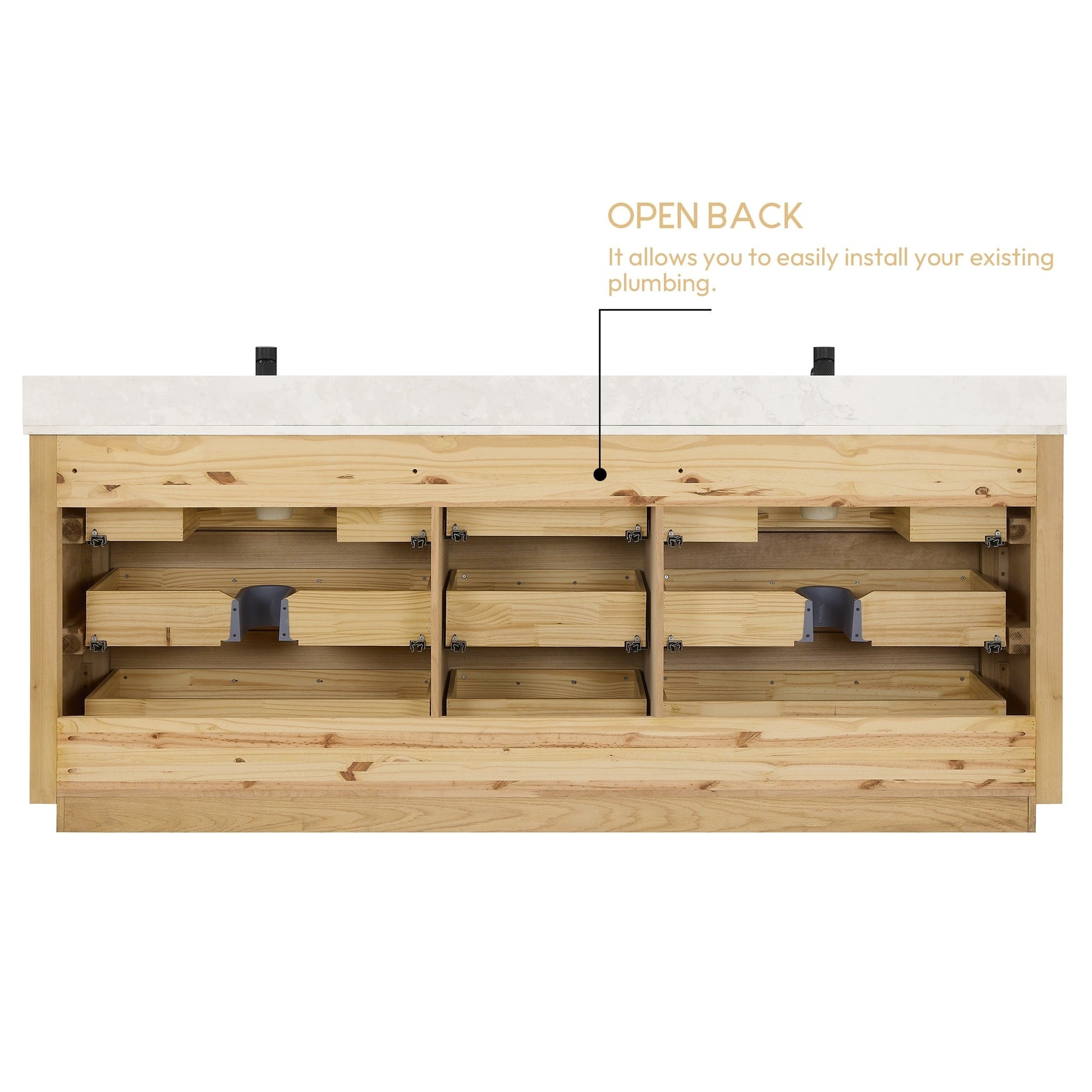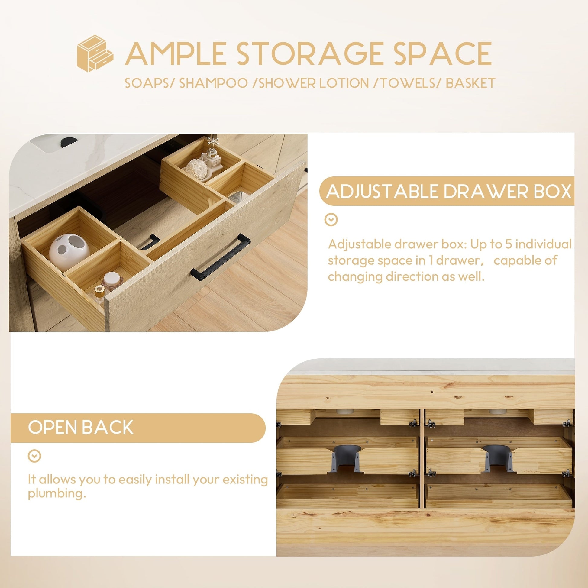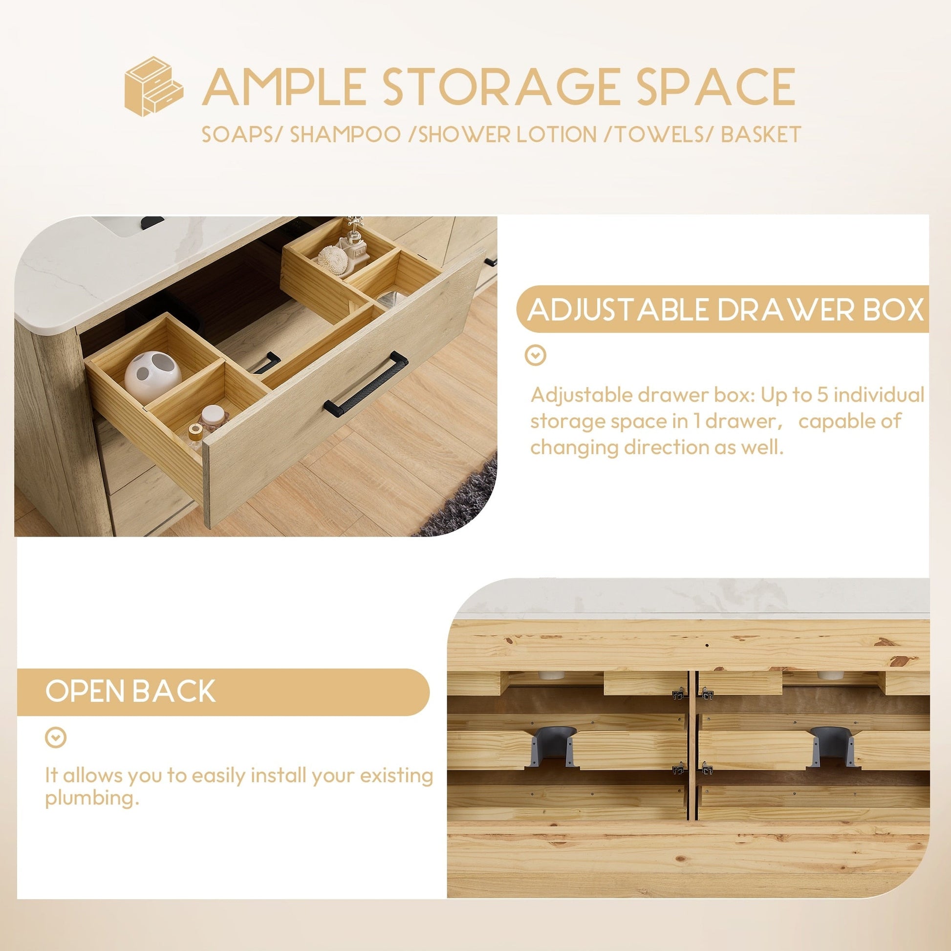 ● Installation requise : Le meuble-lavabo autoportant est livré entièrement assemblé pour votre commodité (sans panneau arrière). Conçu pour une installation facile et sans tracas de la plomberie et de la robinetterie.