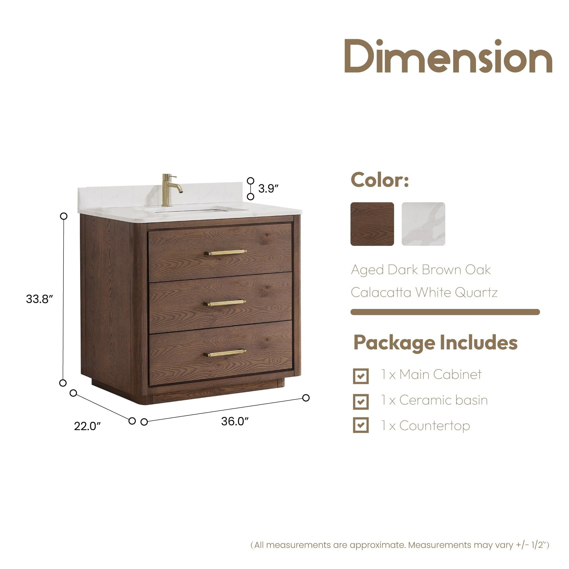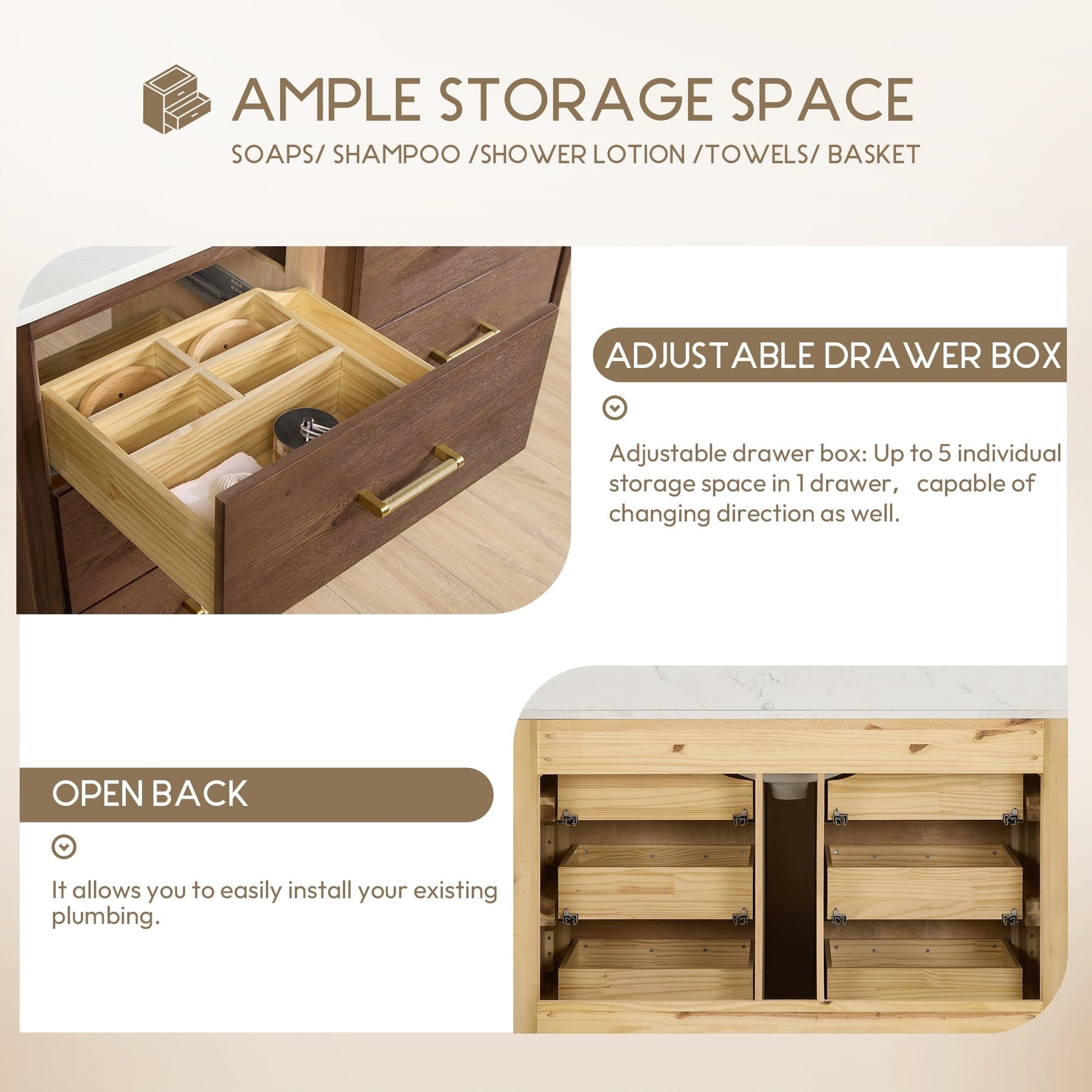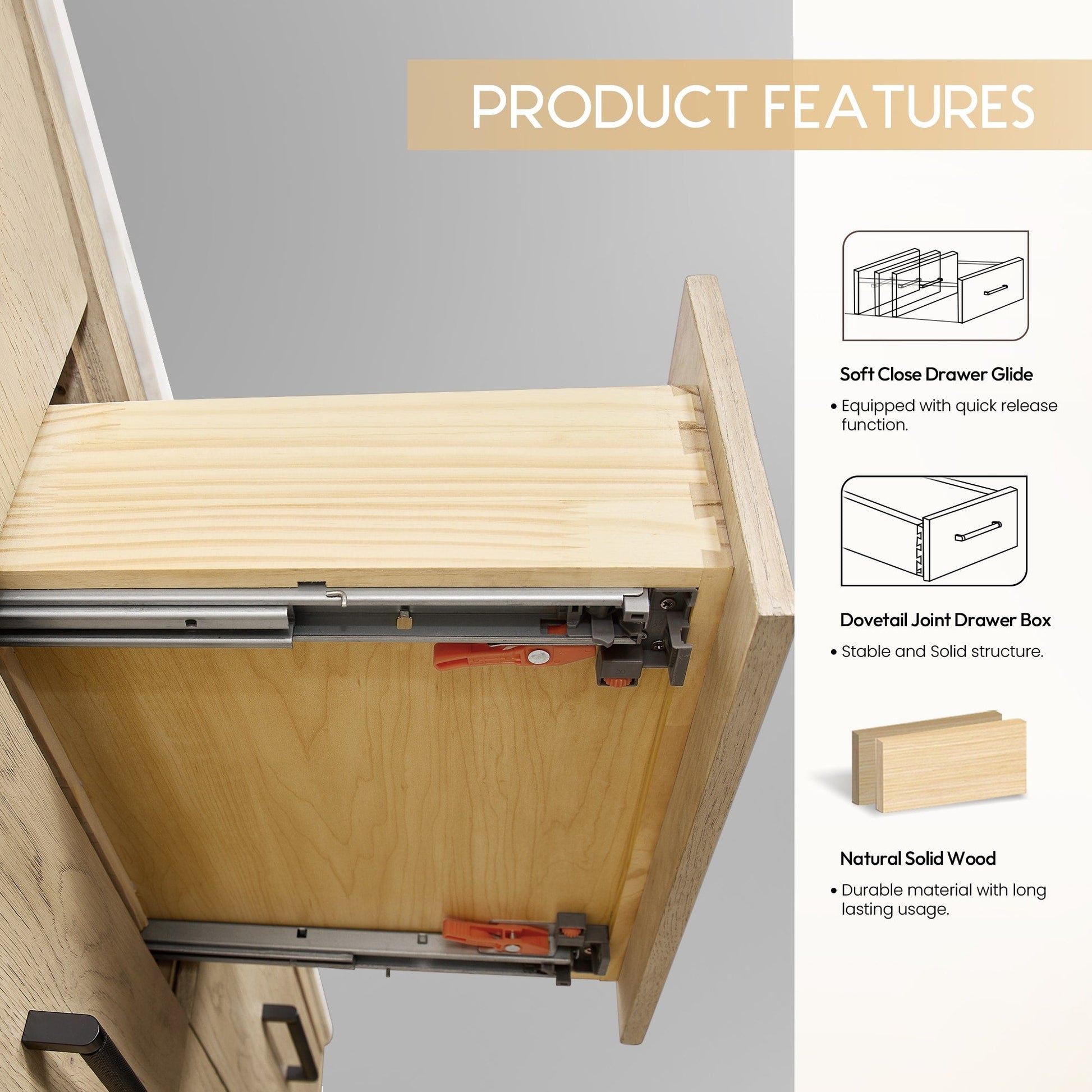 36 pouces - Trois tiroirs robustes à fermeture douce et à queue d'aronde sont dotés de séparateurs intégrés pour un accès facile à tous vos articles de toilette.