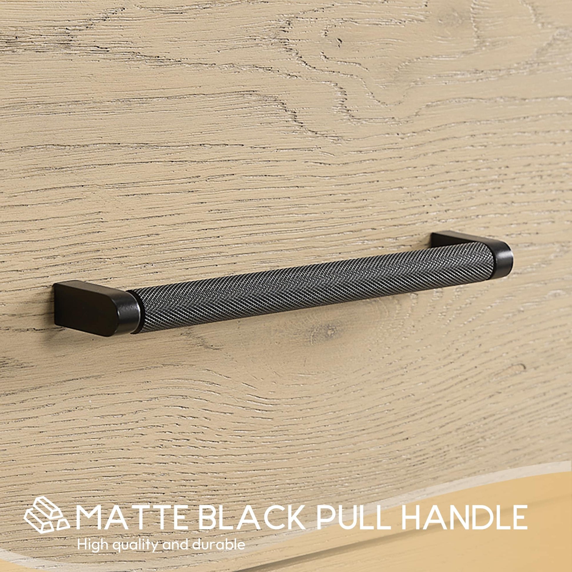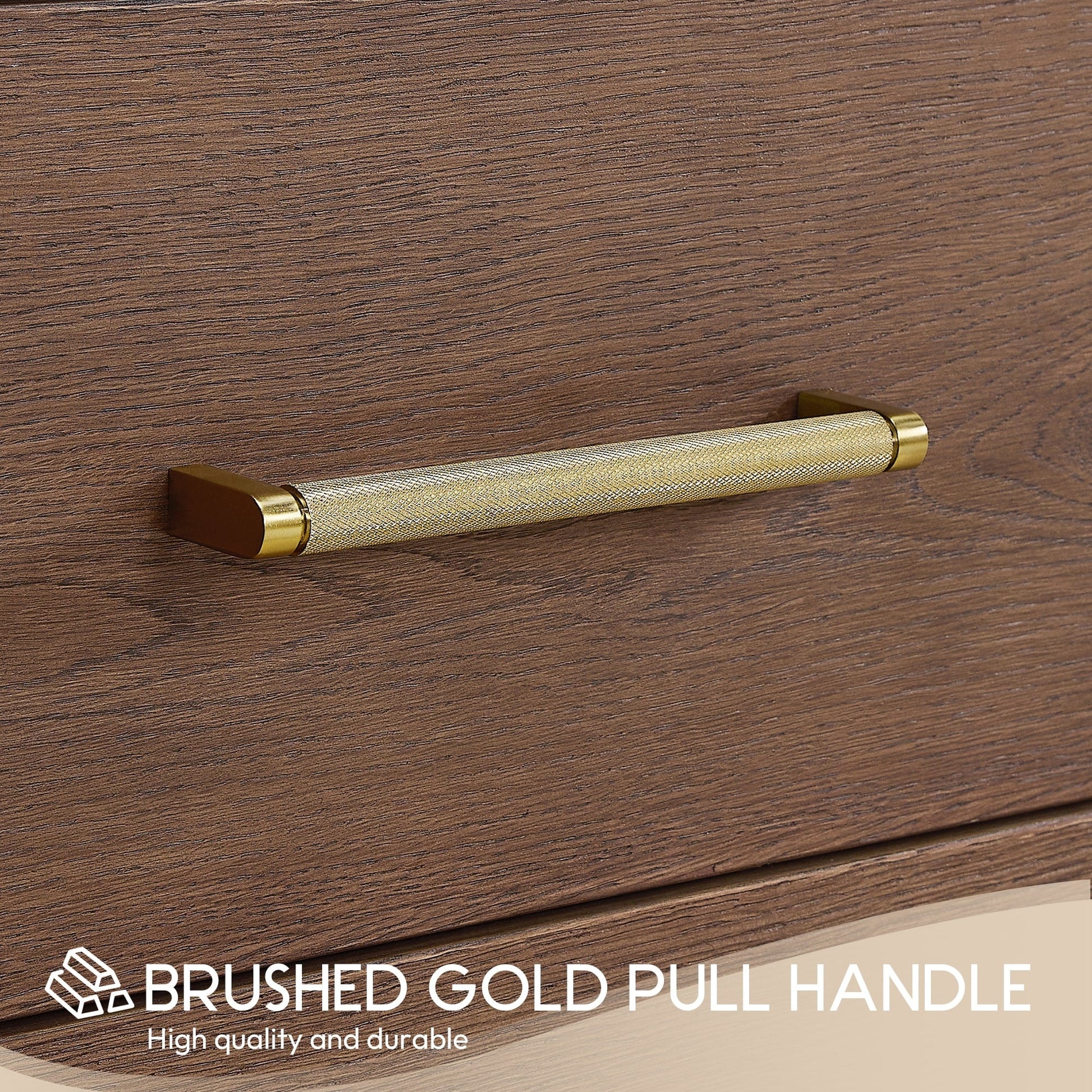 ● Quincaillerie : La quincaillerie en finition or brossé ou noir mat apporte une touche d’élégance et de contraste. La poignée moletée en alliage de zinc robuste ajoute une touche de style classique et un contraste saisissant avec le bois texturé.