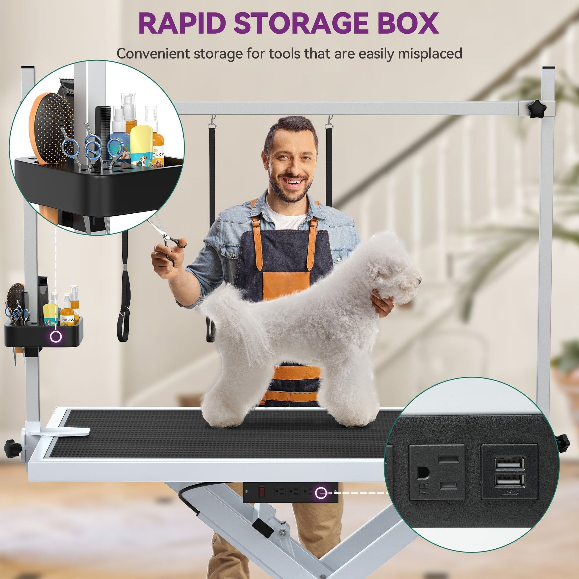 Le plan de travail en silicone antidérapant et imperméable de qualité supérieure offre un toucher doux et agréable aux pattes de votre animal et facilite le nettoyage des poils. Utilisez-le avec une laisse et un anneau de contention pour maintenir votre animal en place lors d'un toilettage prolongé, tout en évitant les blessures. Toilettez votre animal à tout moment grâce à cette table de toilettage électrique robuste. Adaptée à tous les types d'animaux, des plus grands aux plus petits, y compris les caniches, les schnauzers, les golden retrievers, les samoyèdes, les chats, etc., elle est idéale pour le toilettage, le brossage, la coupe et l'habillage.