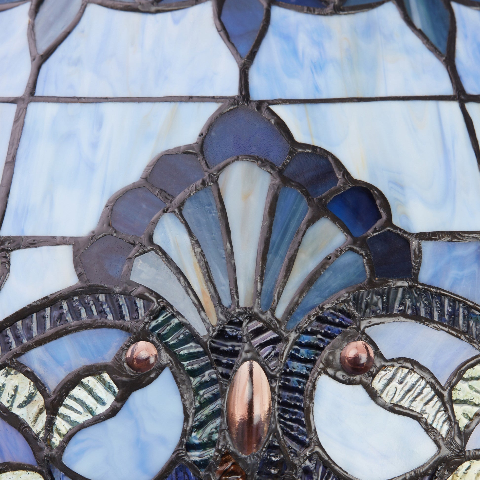 Ce lampadaire élégant, orné de vitraux traditionnels, s'intègre harmonieusement à tous les intérieurs. Le verre bleu, le métal et la polyrésine se marient à merveille avec toutes les palettes de couleurs, tandis que la finition vieillie apporte une touche de raffinement. Son pied en forme de chandelier soutient un abat-jour en forme de bol, composé de 372 pièces de vitrail et de 51 cabochons, diffusant une lumière douce et tamisée, idéale pour créer un coin lecture cosy ou mettre en valeur un point focal de votre pièce.