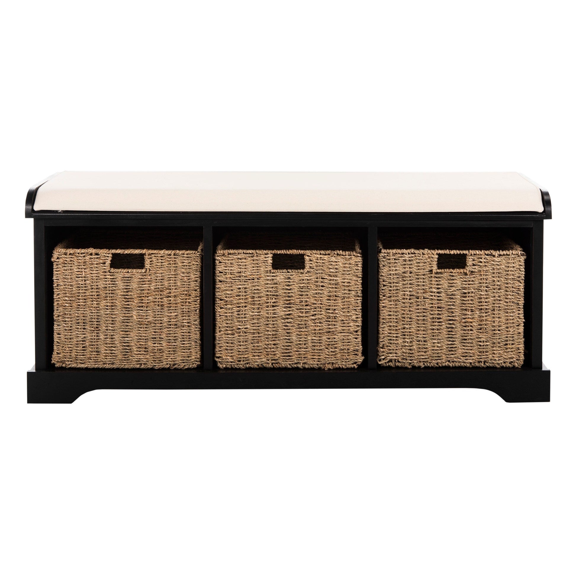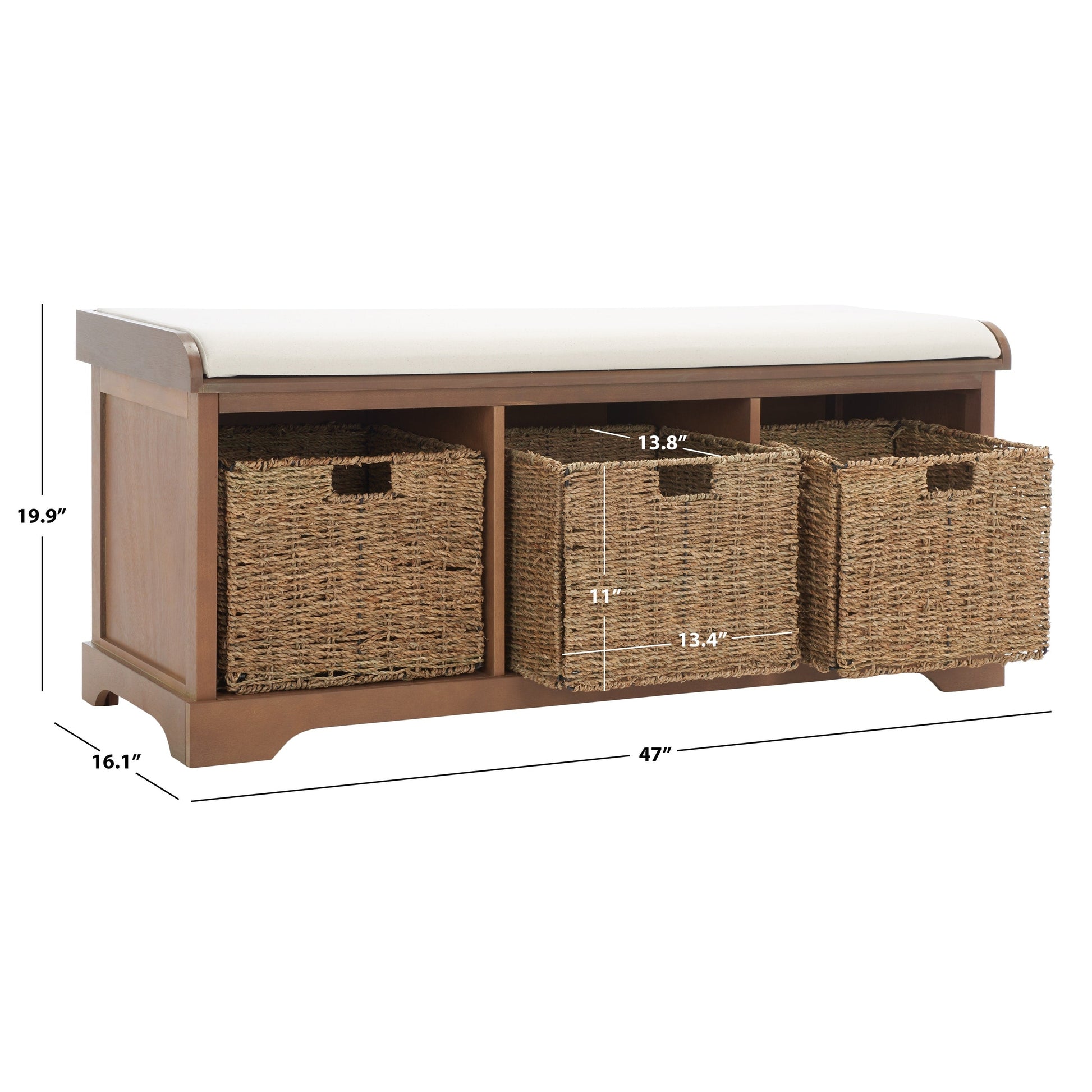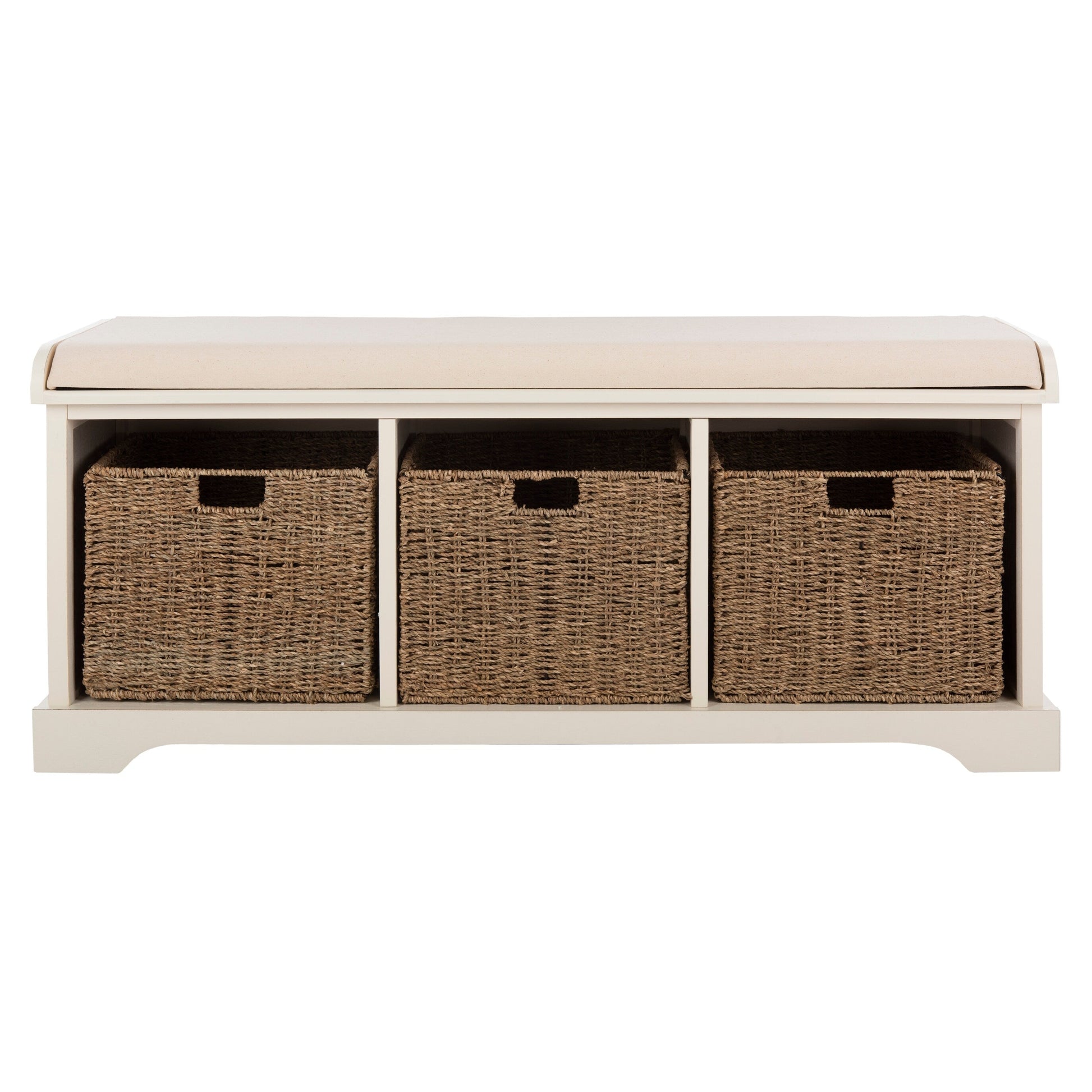 Le banc de rangement est idéal pour se déchausser dans l'entrée ou pour ranger ses chaussures de jardin dans le vestibule. Fabriqué en pin avec une finition lisse, il est doté de trois paniers tressés amovibles pour un rangement pratique, et un coussin en coton blanc apporte confort et charme rustique.