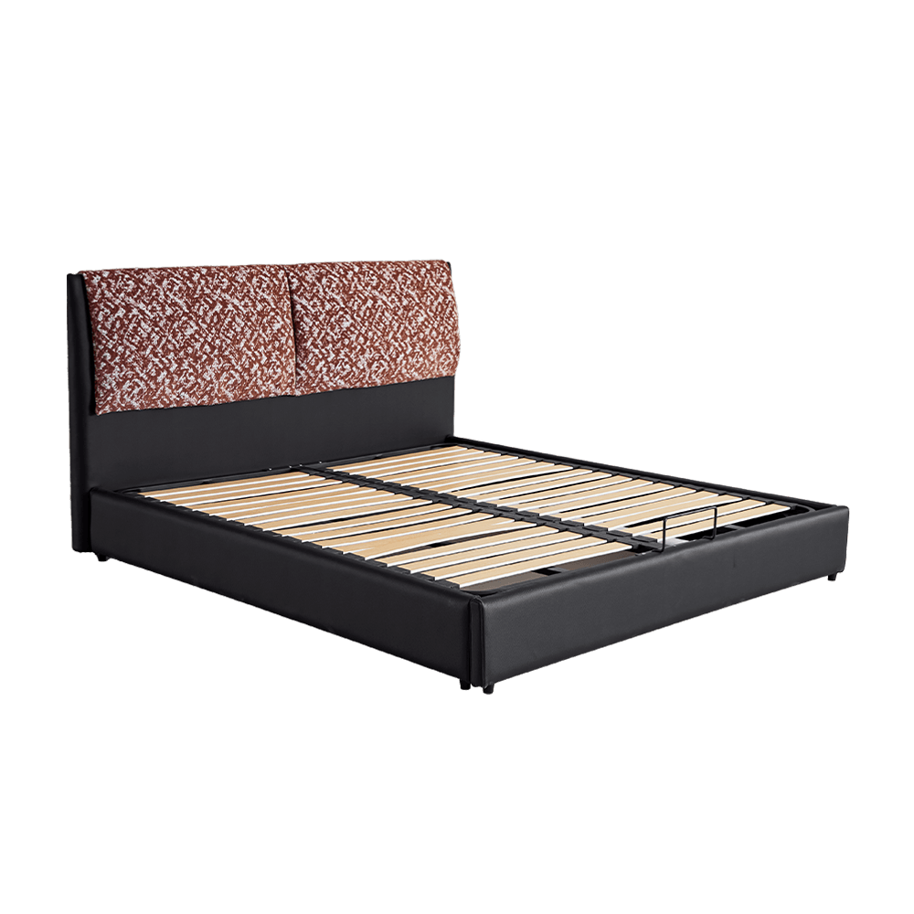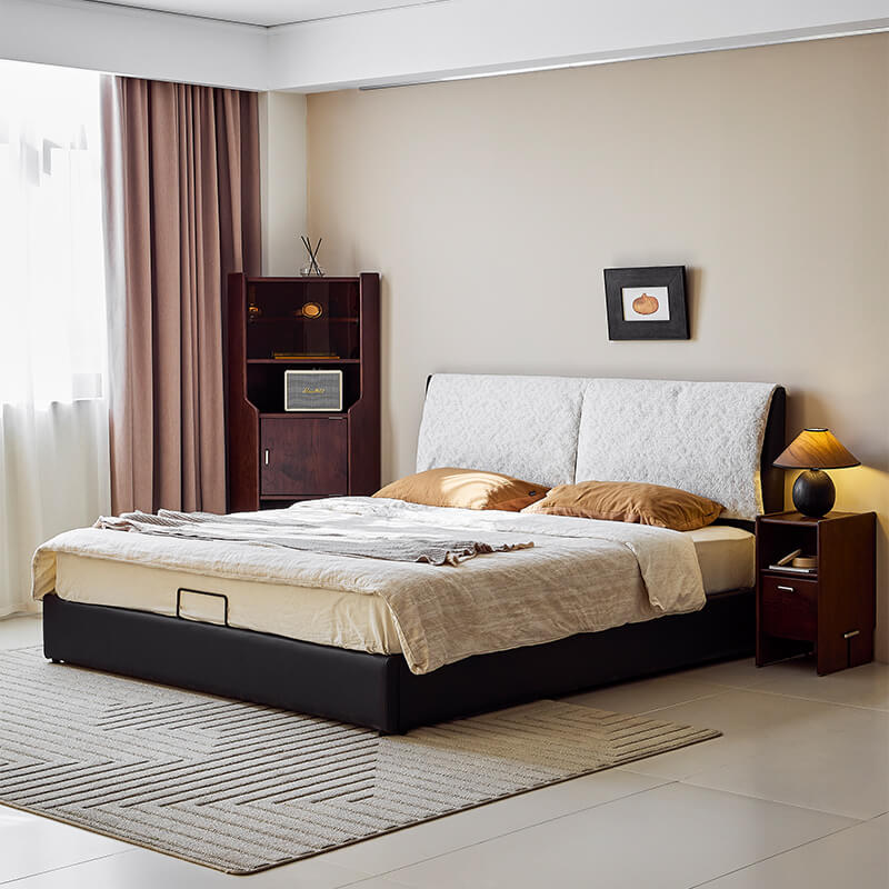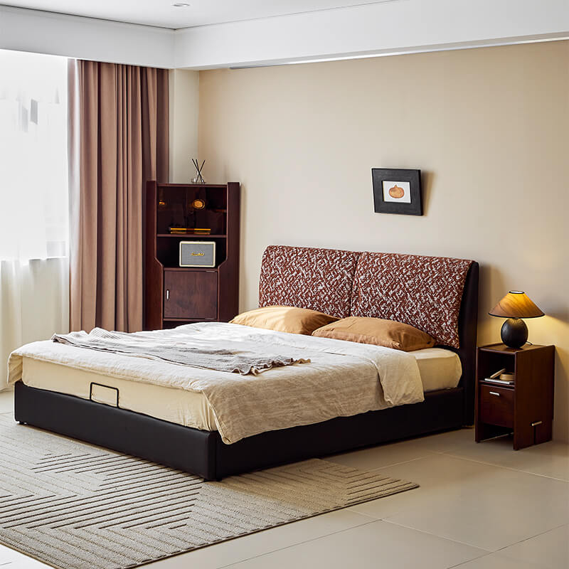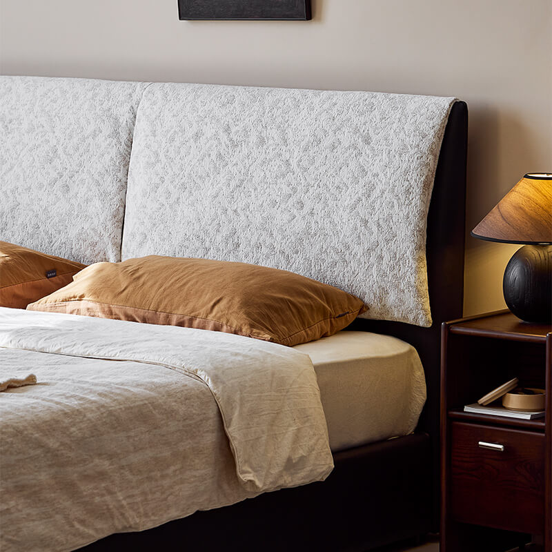 Le lit Shaw l est un lit rembourré de duvet aux couleurs contrastées , qui peut être facilement retiré et remplacé . Cela en fait un meuble lavable exceptionnellement pratique . Il allie le style du milieu du siècle à la praticité moderne . Le coussin de la tête de lit présente un design unique en couleurs contrastées , offrant un attrait visuel distinctif .