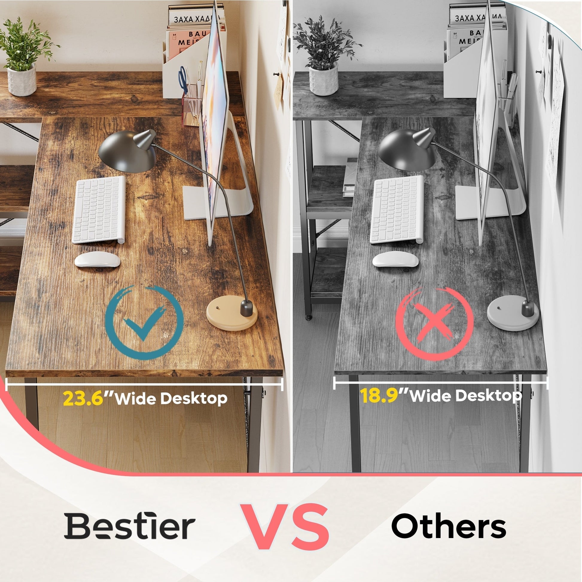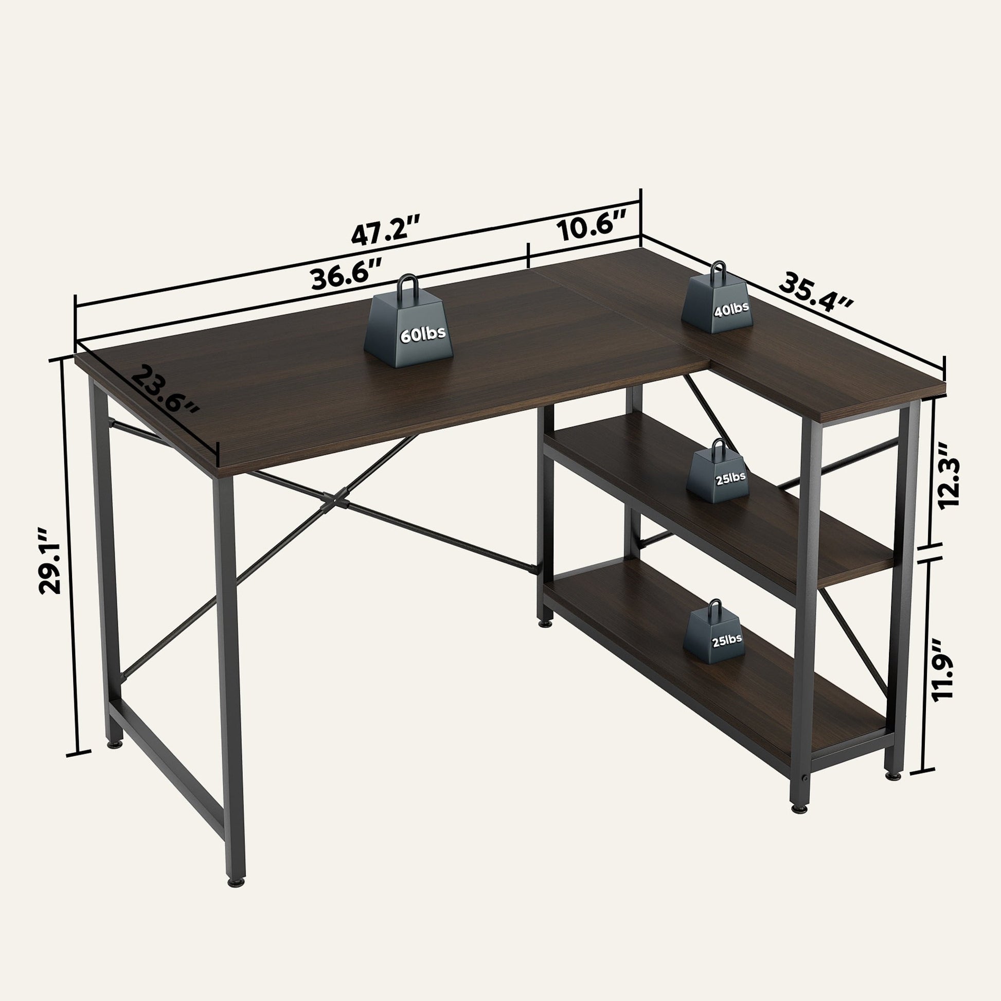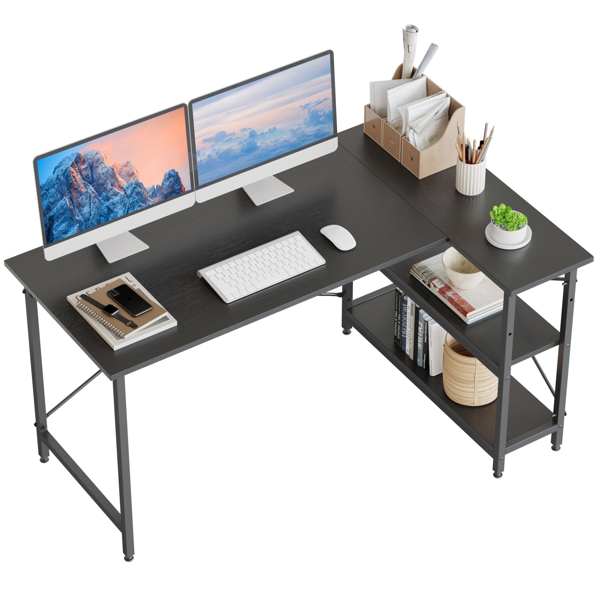 Améliorez votre espace de travail à domicile avec notre bureau d'angle compact en forme de L doté d'étagères de rangement. Son design unique en forme de L et son grand plateau de 140 cm (55 pouces) offrent un espace généreux pour vos dossiers et livres, tout en apportant une touche de dynamisme à votre espace de travail. Ses étagères réversibles peuvent être installées à gauche ou à droite selon vos préférences, et leur hauteur est réglable. Le montage est un jeu d'enfant grâce aux instructions claires et aux accessoires bien organisés. De plus, vous bénéficiez d'une garantie de remboursement de 30 jours et d'un service client à vie. Notre bureau est certifié conforme et a subi des tests de charge professionnels. La photo présentée est celle d'un client ayant utilisé un produit réel, avec son autorisation. (Taille réelle du bureau : 119 cm [47 pouces]).