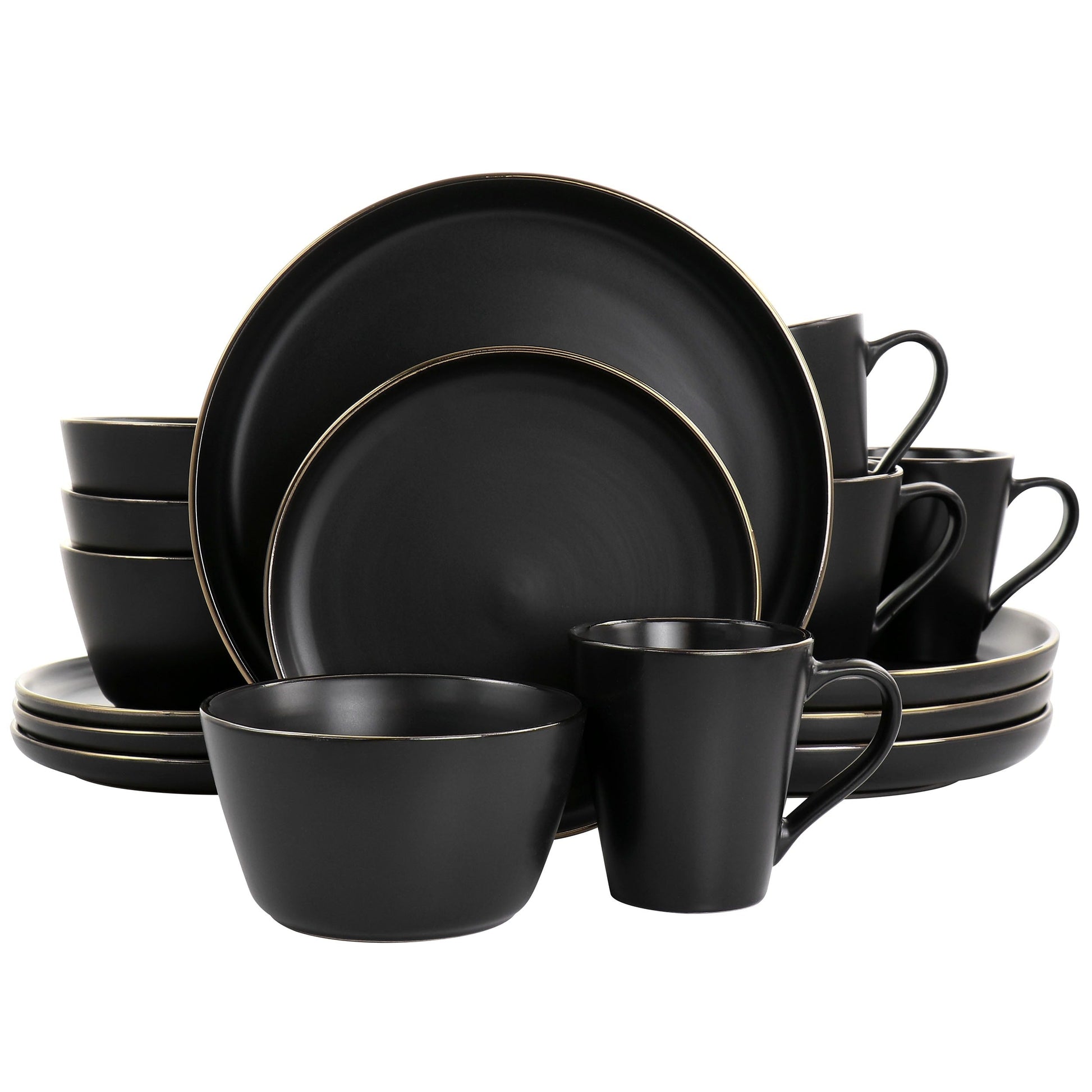 Sublimez votre table avec ce service de table rond en grès de 16 pièces, au fini noir mat sophistiqué et liseré doré. Chaque assiette, unique par sa base plate, son bord surélevé et sa bordure dorée, est une pièce maîtresse. Son élégant liseré doré apporte une touche raffinée à votre table. Fabriqué en grès, ce service est idéal pour les grandes occasions et suffisamment robuste pour un usage quotidien. Chaque assiette passe au micro-ondes pour un réchauffage rapide et au lave-vaisselle pour un nettoyage facile.