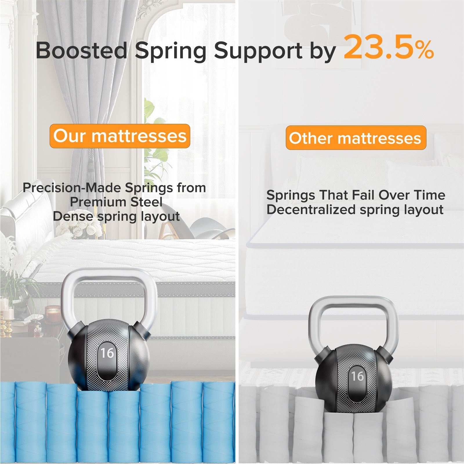 - Ressorts hélicoïdaux 23,5 % plus épais que la norme du marché : offrent un meilleur soutien, une durée de vie plus longue et empêchent l’affaissement.