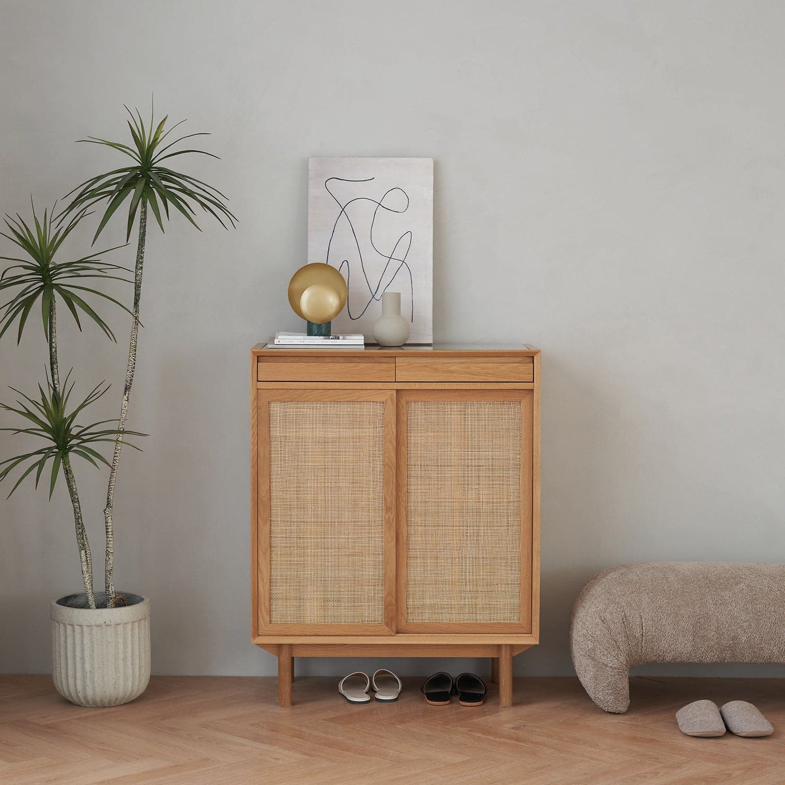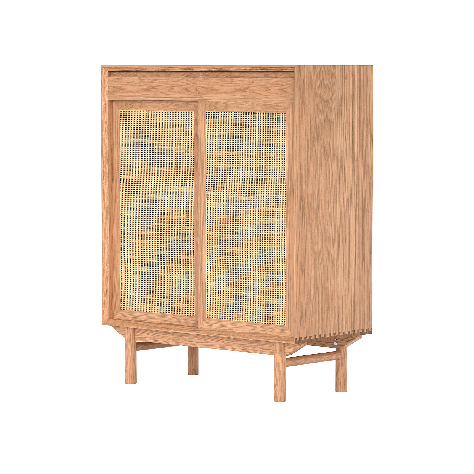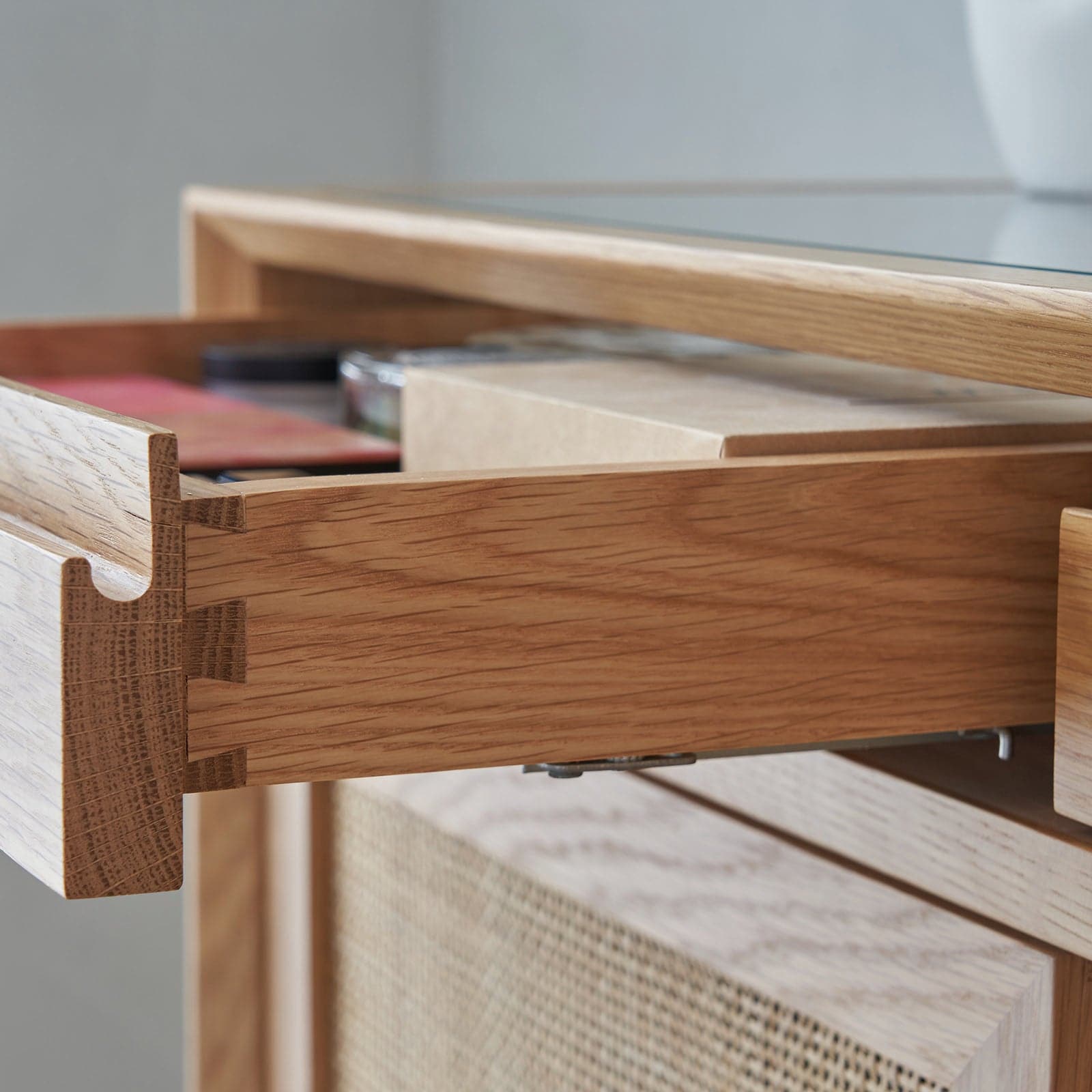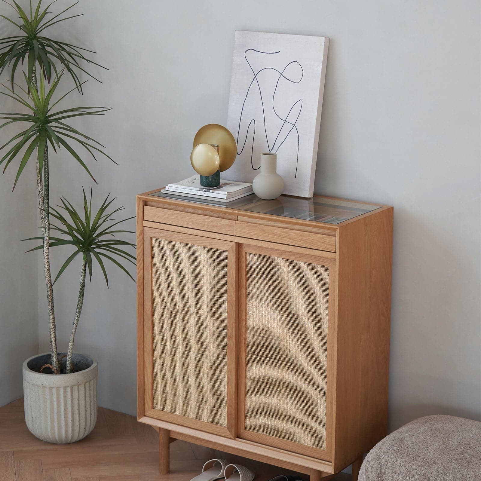 Buffet Torii / Portes en rotin tressé et plateau en verre