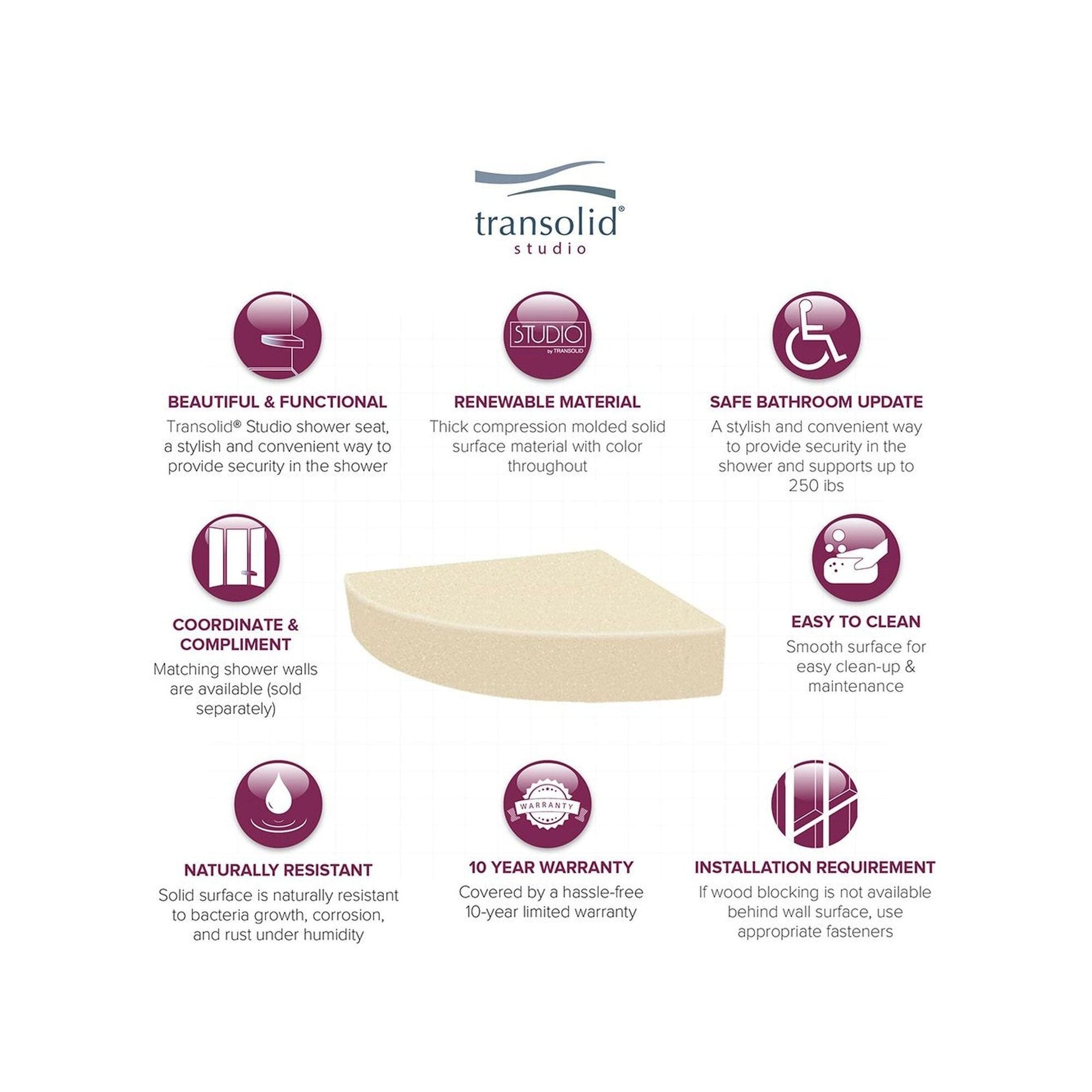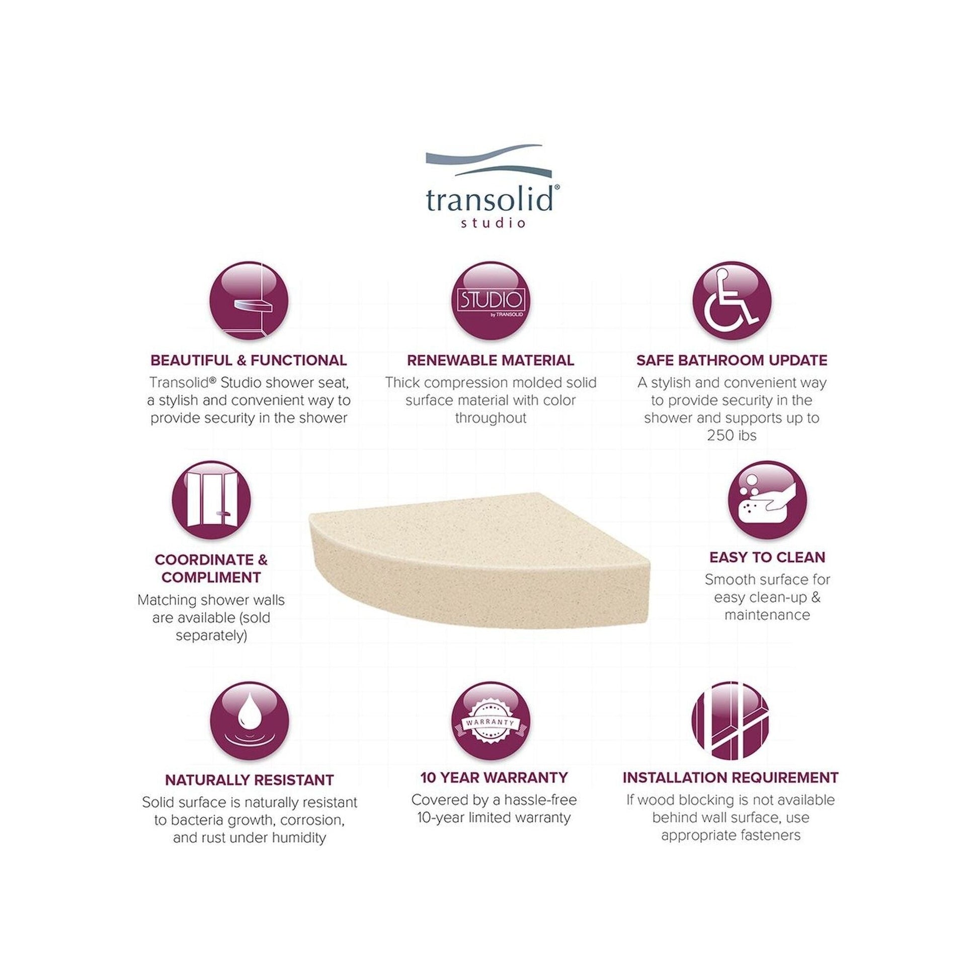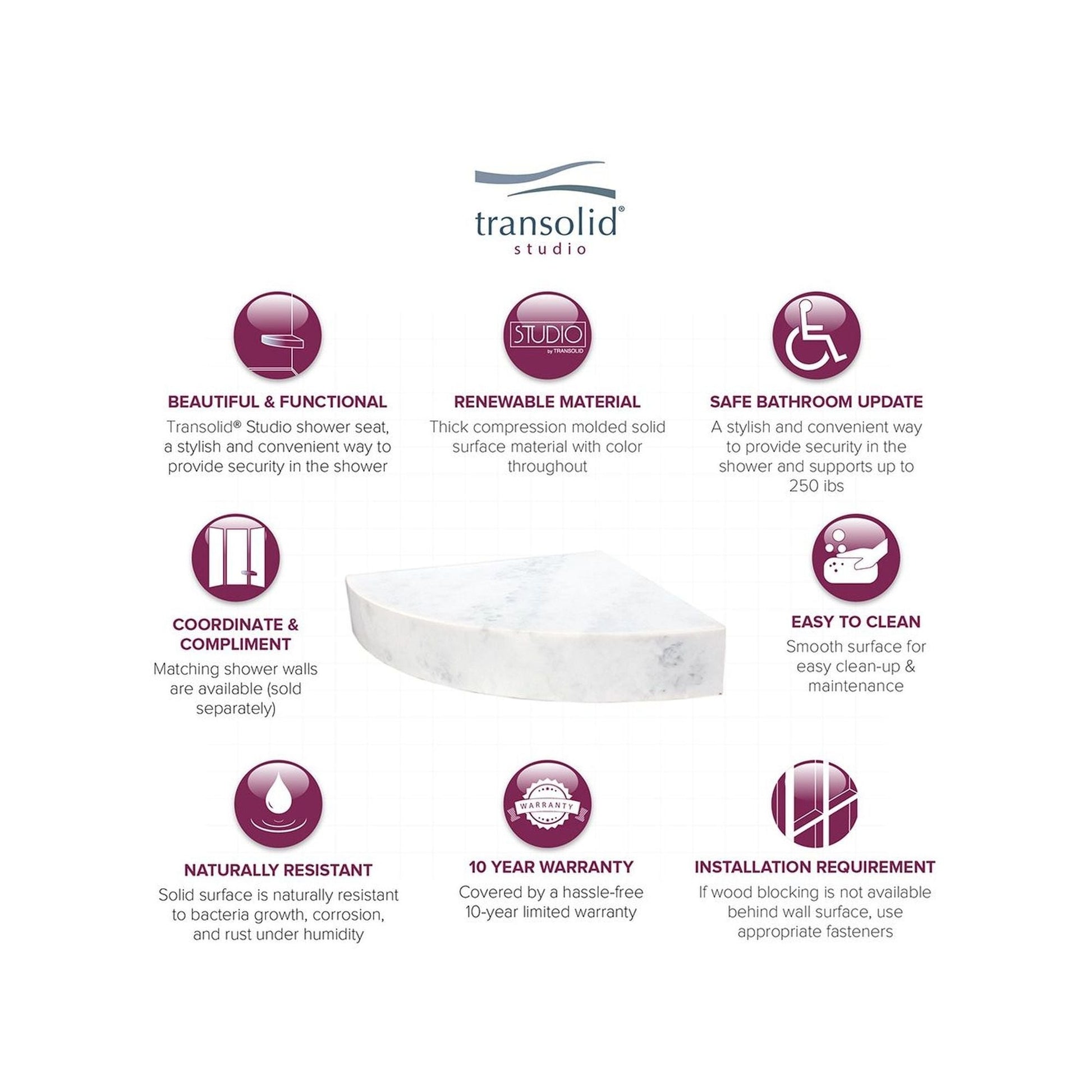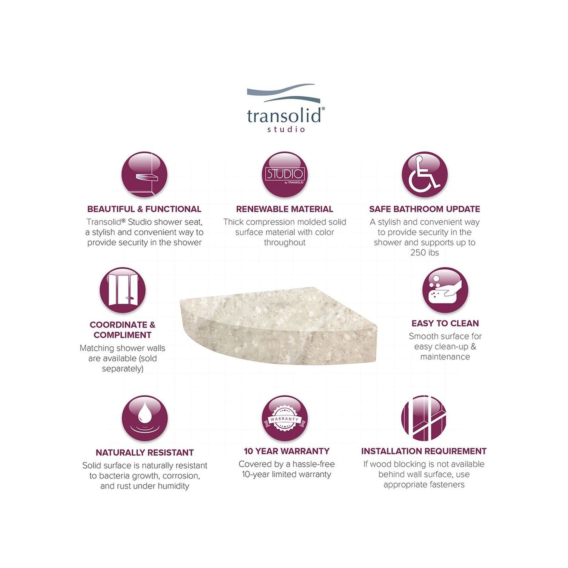 Siège de douche d'angle mural en surface solide Transolid Studio 14 po x 14 po - 14,5 po x 14,25 po x 3 po